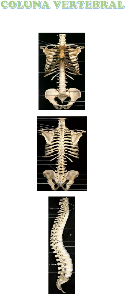 o A coluna vertebral é composta, em geral, de 33(trinta e três) vértebras; o Entre cada dois pares de vértebras temos os discos intervertebrais, responsáveis por aproximadamente um quarto do crescimento. o A estabilização dinâmica da coluna vertebral é fornecida pelas musculaturas intrínseca e extrínseca: o Intrínseca: espinho transversais, transverso costais, multífidos, os semi- espinhais e os rotadores, interespinhaise os intertransversários. o Extrínseca: latíssimo dorsal, elevador da escápula, os romboides e os músculos estabilizadores do ombro, como o serrátil, quadrado lombar e o iliopsoas FUNÇÕES GERAIS o Suporte para a posição ortostática; o Proteção a medula espinhal; o Local para a fixação de músculos; o Transferência de cargas da parte superior do tronco para os membros inferiores. CURVATURAS FISIOLÓGICAS o Curvaturas primárias–são formadas na vida intra-uterina (sacral e torácica–cifoses). o Curvaturas secundárias–são formadas ao longo do desenvolvimento (cervical lombar- lordoses). DEFORMIDADES DE ALINHAMENTO o Aumento da curvatura (mais comum):hiperlordose e hipercifose. o Retificação das curvaturas: Dorso plano, retificação lombar ou cervical. o Inversão da curvatura: Escoliose. Escoliose hipercifose hiperlordose AVALIAÇÃO POSTURAL Coluna cervical o A coluna cervical: estabilidade foi sacrifica da em favor da mobilidade (favorável a lesão). o Área cervicoencefálica: coluna cervical posterior-coluna cervical e occipito o Cervicobraquial: coluna cervical inferior o Articulações atlanto-occipitais: mais superiores (flexão e extensão/movimento de concordância com a cabeça o Articulação atlantoaxiais: articulações mais móveis: flexão e extensão/flexão lateral e rotação ANATOMIA APLICADA o Articulação atlantoccipital • Articulação Atlantoaxial Mediana (C1-C2): articulação axial (trocóidea) / Articulações atlantoaxiais laterais são articulações planas DISCOS INTERVETEBRAIS o 25% da altura da coluna cervical o Entre o atlas e o occipito e o atlas e o axis não existe disco intervertebral o Discos: conferem postura lordótica da coluna cervical SISTEMA VERTEBROBASILAR o A artéria vertebral (sistema vertebrobasilar) passa pelos processos transversos C4-C6 o Supre 20% da irrigação sanguínea do cérebro +artéria carótida (80%) o Artéria vertebral está situada próxima às articulações facetarias e ao corpo vertebral: comprimida por osteófitos o Extensão apenas 20 graus diminuem significativamente o fluxo sanguíneo da artéria vertebral COLUNA CERVICAL INFERIOR Coluna cervical inferior (C3-C7): área cervicobraquial: dor referida para a extremidade superiores *Patologia nessa região: acarreta dor apenas no pescoço, apenas no membro superior HISTÓRIA CLÍNICA o Qual é a idade do paciente? Qual é a ocupação? o Qual é a gravidade dos sintomas? o Qual foi o mecanismo da lesão? o Qual é a atividade ou o lazer habitual do paciente? o O que o paciente é capaz de fazer funcionalmente? o Os sintomas surgiram imediatamente? o Quais são os locais e limites da dor? Há irradiação da dor? A dor é profunda? Superficial? Em pontada? Em queimação? Contínua? HISTÓRIA CLÍNICA o O paciente tem dores de cabeça? o Há parestesias? Formigamentos nas extremidades? o Há sintomas nos MMSS? o O paciente tem problemas de equilíbrio? Tontura, desmaios? o O paciente exibe ou queixa-se de quais quer sintomas simpáticos? o Existem posturas ou ações que aumentam ou diminuam a dor? o Qual é a posição de dormir do paciente? o O paciente respira pela boca? OBSERVAÇÃO E TRIAGEM Exame das outras articulações adjacentes, acrescentando uma avaliação postural global; Observação Geral: evidência de dano tecidual, edema, temperatura, hipersensibilidade, estalido ou crepitação. POSTURAL GLOBAL DA COLUNA VERTEBRAL O paciente deve ser examinado na postura relaxada habitual; A postura do paciente pode ser observada nas vistas anterior, posterior e lateral Exame de Exploração das Articulações Periféricas: artic. temporomandibulares, cintura escapular, cotovelos, punho e mão. INSPEÇÃO o Postura da cabeça e pescoço (cabeça linha mediana e o paciente apresenta curvatura lordica normal) o Queixo alinhado com esterno o Lateralmente: orelhas alinhadas com o ombro e a testa na vertical o Anteriorização da cabeça ou postura militar (encurtamento adaptativos dos músculos occipitais) o Níveis dos ombros o Expressão facial o Contornos ósseos e tecidos moles INSPEÇÃO COLUNA CERVICAL -PALPAÇÃO FACE POSTERIOR: o Protuberância Occipital Externa; o Processos espinhosos e processos articulares das vértebras cervicais; o Processo mastoideo. FACE LATERAL: o Processos transversos das vértebras cervicais; o Articulações temporomandibulares, mandíbula. FACE ANTERIOR: o 3 primeiras costelas; o Fossa supraclavicular. MOVIMENTO ATIVO A. Flexão B. Extensão C. Inclinação lateral D. Rotação A avaliação da coluna torácica inclui o exame da parte Mais rígida da coluna vertebral: gradil costal associado. Coluna torácica (curva primária):apresenta uma discreta cifose (curvatura posterior); Ao avaliar a coluna torácica é essencial a avaliação, ao mesmo tempo, da coluna cervical e/ou lombar COLUNA TORÁCICA Coluna torácica: 12vértebras–diminuem de tamanho de T1 a T3 e aumentam, deforma progressiva, até T12. Vértebras: possuem facetas no corpo e processos transversos (articulação com as costelas). Os processos espinhosos dessas vértebras direcionam-se obliquamente para baixo. A vértebra T7: apresenta a maior angulação do processo espinhoso T1, T2eT3: possuem processos espinhosos que se projetam diretamente para trás. COSTELAS As costelas: ajudam a enrijecer a coluna torácica Articulam-se com as hemifacetas sobre as vértebras T2-T9. T1 e T10, existe uma faceta inteira para a lª e a l0ª costelas, respectivamente. A 1ª costela articula-se apenas com T1, a 2ª costela, com T