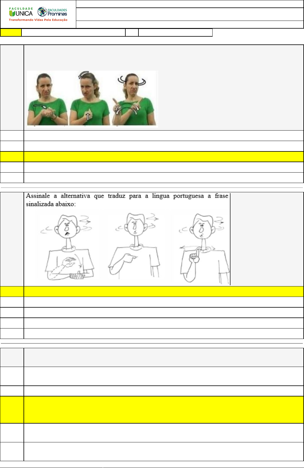 28/11/2021 19:08:21 1/3 REVISÃO DE SIMULADO Nome: CLEUZA APARECIDA PEREIRA CAVALCANTE Disciplina: Respostas corretas são marcadas em amarelo X Respostas marcardas por você. Questão 001 (INSTITUTO MACHADO DE ASSIS -2018 - Adaptada) A Língua de Sinais utiliza as expressões faciais e corporais para estabelecer tipos de frases, como as entonações na língua portuguesa. A imagem abaixo trata de qual tipo de frase? X A) Frase interrogativa. B) Frase agramatical. C) Frase negativa. D) Frase exclamativa. E) Frase afirmativa. Questão 002 X A) “Eu não sou casado” B) “Não tenho esposa” C) “Namoro eu não” D) “Eu não converso” E) “Eu sou casado” Questão 003 (FUNRIO-2014) Considerando a estrutura morfológica da LIBRAS, as frases negativas podem ser feitas por meio de três processos. São eles: A) O acréscimo do sinal “não” à frase afirmativa e um aceno afirmativo de cabeça, causando espanto no interlocutor. B) Não é possível fazer negativas em libras, devido às limitações claras dessa língua. X C) O acréscimo do sinal “não” à frase afirmativa, com a incorporação de um movimento contrário ao do sinal negado e/ou com um aceno de cabeça, que pode ser feito simultaneamente com a ação que está sendo negada. D) O acréscimo do sinal “não” à frase afirmativa e a repetição do sinal negado de forma incisiva três vezes, utilizando expressão facial afirmativa. E) O acréscimo do sinal “não” à frase afirmativa, com a incorporação de um movimento afirmativo e uma expressão fácil interrogativa. 28/11/2021 19:08:21 2/3 Questão 004 X A) SOV B) SVO C) OSV D) VOS E) OVS Questão 005 (UFMT 2017) A Libras possui diversas regras gramaticais, um aspecto dessa língua de modalidade visual-espacial é o fenômeno de incorporação. Um processo produtivo na língua de sinais brasileira é a incorporação da negação. Sobre esse processo, analise as afirmativas abaixo: I. Na Libras, pode ocorrer a incorporação da negação em alguns verbos, que, com um movimento contrário, caracteriza a negação incorporada, como nos verbos QUERER/QUERER-NÃO. II. Em todos os verbos na Libras, a incorporação de negação é feita pelo indicador movimentando-se de um lado para outro, representando o sinal de NÃO logo após o sinal a ser negado. III. Outra forma de incorporação de negação pode ocorrer simultaneamente ao movimento ou à expressão corporal, são exemplos TER e NÃO-TER, PODER e NÃO- PODER. Está correto o que se afirma em: A) I e III, apenas. B) I, II e III. C) II, apenas. D) Nenhuma das afirmativas está correta. X E) II e III, apenas. Questão 006 X A) Gostar. B) Chamar. C) Querer. 28/11/2021 19:08:21 3/3 D) Conversar. E) Falar. Questão 007 (COPESE- UFPI – 2018) Sobre a ordem das frases na Língua Brasileira de Sinais, é possível afirmar que: 1. todas as frases com a estrutura SVO são gramaticais. 2. a estrutura OSV é a estrutura utilizada no processo de topicalização. 3. a estrutura SOV é utilizada para a construção de foco. 4. frases com a estrutura VOS são agramaticais. Estão CORRETAS as afirmações: A) Apenas 1, 2 e 4. B) Apenas 1, 2 e 3. C) Apenas 1, 3 e 4. D) Apenas 2, 3 e 4. X E) 1, 2, 3 e 4. Questão 008 A) “Que bonito!” B) “Carro feio!” X C) “Que carro bonito!” D) “Nossa, susto!” E) “Eu dirijo bem”