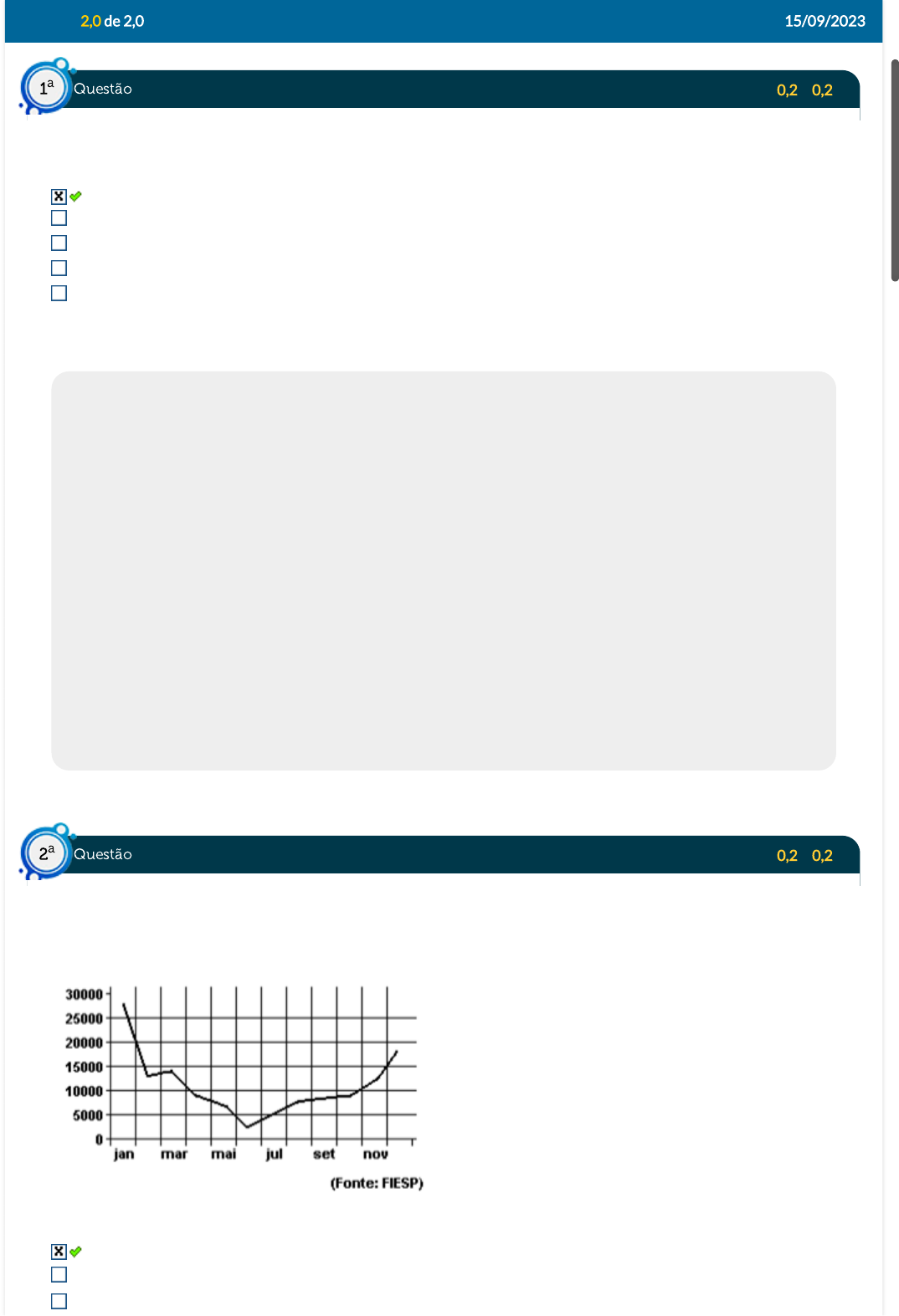 12/11/2023, 22:24 Estácio: Alunos https://simulado.estacio.br/alunos/ 1/1 Acertos: 2,0 de 2,0 15/09/2023 Acerto: 0,2 / 0,2 Julia está lendo um livro de 420 páginas e percebe que, em 2 horas, consegue ler 60 páginas. Com base em sua velocidade de leitura, quantas horas Julia precisará, aproximadamente, para ler o livro inteiro? 14 horas. 10 horas. 12 horas. 8 horas. 6 horas. Respondido em 15/09/2023 13:26:53 Explicação: Vamos utilizar a regra de três simples: 2 horas - 60 páginas x horas - 420 páginas 60x=2∙420 60x=840 x=14 horas Utilizando a regra de três simples, se Julia lê 60 páginas em 2 horas, ela levará aproximadamente 14 horas para ler o livro completo de 420 páginas. Acerto: 0,2 / 0,2 No grá�co a seguir tem-se o número de vagas fechadas a cada mês na indústria paulista, no ano de 1998. A partir desse grá�co, conclui-se corretamente que, em relação à indústria paulista no ano de 1998: No primeiro semestre, foram fechadas mais de 62.000 vagas. Durante o primeiro trimestre, a taxa de desemprego diminuiu. No terceiro trimestre, diminuiu o número de desempregados. Questão1 a Questão2 a 12/11/2023, 22:25 Estácio: Alunos https://simulado.estacio.br/alunos/ 1/1 Acerto: 0,2 / 0,2 Seja . Considere as seguintes a�rmações. 1. A função f(x) é uma função par, isto é, fx = f(-x), para todo x real. 2. A função f(x) é periódica de período 2 . 3. A função f é sobrejetora. 4. . São verdadeiras as a�rmações: 3 e 4, apenas. 1 e 3, apenas. 2 e 4, apenas. 1,2,3 e 4. 1,2 e 3, apenas. Respondido em 15/09/2023 13:33:30 Explicação: As a�rmações 2 e 4 estão corretas. A a�rmativa 2 está correta. A função seno é uma função periódica, de�nida no círculo trigonométrico e, por isso, possui um período de 2 𝜋. A a�rmativa 4 também está correta. Sabemos, pelo círculo trigonométrico que: sen(0)=0, sen(𝜋/3)=sen(60)= /2, sen(90)=1. A a�rmativa 1 está incorreta, f(x) pode assumir valores de -1 a 1. A a�rmativa 3 está incorreta, f(x) não é sobrejetora já que f(x) assume apenas valores entre -1 e 1. Acerto: 0,2 / 0,2 A variação da pressão sanguínea de um determinado atleta pode ser modelada pela seguinte expressão: , onde f(t) representa o valor da pressão em mmHG e t representa o tempo em segundos. Assim, após a análise do médico, constatou-se que o número de batimentos cardíacos por minuto (bpm) e a pressão arterial de determinado atleta na linguagem popular são, respectivamente: 90 bpm ; 12 por 8 100 bpm; 12 por 8 90 bpm; 11 por 7 110 bpm; 11 por 7 100 bpm; 11 por 7 Respondido em 15/09/2023 13:36:25 Explicação: A resposta correta é: 100 bpm; 11 por 7 f : R → R, dada porf(x) = senx π f(0) = 0, f ( ) = e f ( ) = 1π 3 √3 2 π 2 √3 f(t) = 90 − 20.cos( )10πt 3 Questão3 a Questão4 a 12/11/2023, 22:26 Estácio: Alunos https://simulado.estacio.br/alunos/ 1/1 Acerto: 0,2 / 0,2 O módulo do vetor é igual a 5. Então: x = -2 ou x = 2 x = -2 ou x = 1 x = -1 ou x = 2 x = -1 ou x = 1 x = 1 ou x = 2 Respondido em 15/09/2023 13:40:00 Explicação: A resposta correta é: x = -2 ou x = 2 Acerto: 0,2 / 0,2 Calculando o limite , encontramos: 0 3 -1 1 27 Respondido em 15/09/2023 13:37:40 Explicação: A resposta correta é: 27 Acerto: 0,2 / 0,2 Lucas comprou uma camiseta e um boné em uma loja. Ele percebeu que a camiseta custava R$15 a mais do que o boné. Se ele gastou um total de R$55, qual é o preço do boné? R$25 R$30 R$40 R$35 R$20 Respondido em 15/09/2023 13:41:39 Explicação: Seja x o preço do boné. →u = (2x, 3) limx→0 (x+3)3−27 x Questão5 a Questão6 a Questão7 a 12/11/2023, 22:27 Estácio: Alunos https://simulado.estacio.br/alunos/ 1/1 Acerto: 0,2 / 0,2 Traçando dois eixos, OX ao qual chamaremos eixo das abscissas e OY que chamaremos eixo das ordenadas, de forma que ambos se interceptem perpendicularmente em O, o plano sobre o qual construímos esses eixos �ca dividido em quatro quadrantes: Considere as sentenças: I. (0, 1) = (1, 0) J. (−1, 4) 3º quadrante K. (2, 0) ao eixo y L. (−3, −2) 3º quadrante Assinale a alternativa correta: (I);(J);(K);(L) São falsas (I);(J);(K);(L) são verdadeiras. (I);(J);(K) São falsas e (L) é verdadeira. (I);(K) São falsas e e (L);(J) são verdadeiras. (I);(J) São falsas e e (L);(K) são verdadeiras. Respondido em 15/09/2023 13:29:47 Explicação: O item (I) é claramente falsa, pois um ponto está sobre o eixo OX e o outro sobre o eixo OU, portanto não podem ser iguais. (J) é falsa, pois este ponto está no segundo quadrante, (K) é falsa, pois este ponto está sobre o eixo OX. Por �m, vemos que (L é verdadeira.) A �gura a seguir ilustra vem o que está ocorrendo: ∈ ∈ ∈ Questão8 a 12/11/2023, 22:27 Estácio: Alunos https://simulado.estacio.br/alunos/ 1/1 Acerto: 0,2 / 0,2 Em determinado país, em que a moeda é simbolizada por $, o imposto de renda é cobrado em função da renda mensal do trabalhador da seguinte forma: I. Isento, se a renda mensal do trabalhador for igual ou inferior a $10.000,00; II. 10% sobre a renda, menos $1.000,00, se a renda mensal do trabalhador for superior a $10.000,00 e inferior ou igual a $20.000,00. III. 20% sobre a renda, se a renda mensal do trabalhador for superior a $20.000,00. Se, para uma renda mensal igual a $x, o trabalhador recolhe I(x) de imposto, então é correto a�rmar que: O domínio da função I é . Nenhuma das respostas anteriores. A imagem da função I é . A imagem da função I é . A função I é uma função constante. Respondido em 15/09/2023 13:30:41 Explicação: A resposta correta é: A imagem da função I é . De fato, dado o grá�co de uma função, uma forma de encontrar a imagem da função é projetar o seu grá�co no Eixo 𝑂𝑦. Neste caso, o eixo 𝑂𝑦 corresponde ao valor do imposto recolhido. Ao analisarmos as condições de recolhimento do imposto, concluímos que o imposto assumir os seguintes valores: - De $0 (isento) até $1.000 para trabalhador