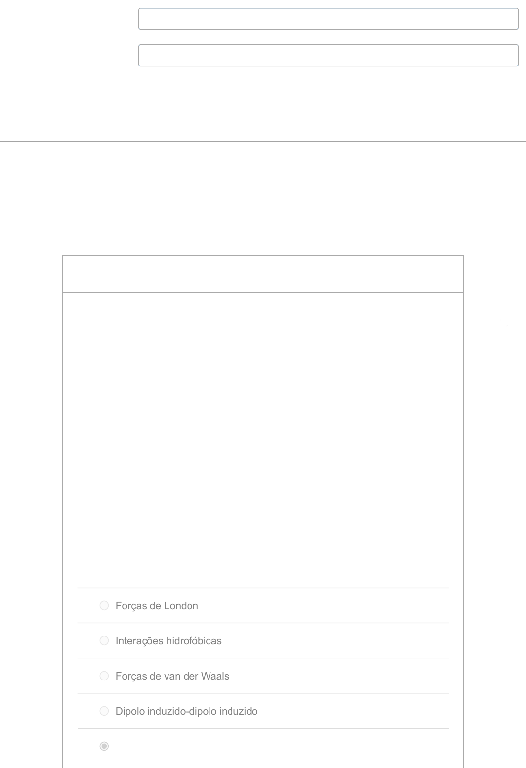 Seu Progresso: 100 % Seu Progresso: 100 % Prova Eletrônica Resultados para SIDNEI RODRIGUES GONCALVES As respostas corretas estarão disponíveis em 23 set em 0:00. Pontuação desta tentativa: 27 de 30 Enviado 14 set em 9:45 Esta tentativa levou 27 minutos. 3 / 3 ptsPergunta 1 A água é o principal componente dos organismos vivos, presente em 70% em peso. Por apresentar ligações covalentes polares entre os átomos de hidrogênio e oxigênio, ela apresenta a possibilidade de interagir com compostos polares sendo, por isso, chamada de “solvente universal”. A que tipos de interações químicas deve-se esse grande poder de solvatação da água? Forças de London Interações hidrofóbicas Forças de van der Waals Dipolo induzido-dipolo induzido Ligações de hidrogênio 3 / 3 ptsPergunta 2 As proteínas são macromoléculas biológicas que desempenham inúmeras funções nos organismos vivos. Pode-se considerar que essas macromoléculas são polímeros de moléculas mais simples. Assinale a alternativa que apresenta as unidades básicas das proteínas. Açúcares Nucleotídeos Nucleosídeos Aminoácidos Lipídeos 3 / 3 ptsPergunta 3 Os triacilgliceróis são considerados fontes mais energéticas do que os carboidratos. Isso se deve principalmente ao fato de Apresentarem mais grupos hidroxila Realizarem mais ligações de hidrogênio Serem líquidos à temperatura do corpo Possuírem maiores massas molares Liberarem mais energia em sua oxidação 3 / 3 ptsPergunta 4 As proteínas apresentam vários níveis estruturais que ajudam a definir a função de determinada proteína. Assinale a alternativa que apresenta a definição correta de estrutura secundária das proteínas. Nenhuma das anteriores Arranjo tridimensional estável da cadeia polipeptídica, consiste na sua conformação nativa Padrões estruturais que se repetem na conformação nativa, como α- hélices e folhas-β Arranjo espacial estável de subunidades de proteínas multiméricas Sequência de aminoácidos na cadeia polipeptídica 3 / 3 ptsPergunta 5 Consideradas interações químicas fortes, quando comparadas às forças d eLondon ou de van der Waals, as ligações de hidrogênio ocorrem sempre quando os átomos desse elemento estiverem ligados a átomos de: Flúor, oxigênio e nitrogênio Carbono, nitrogênio e flúor Fósforo, oxigênio e carbono Carbono, oxigênio e nitrogênio Oxigênio, flúor e carbono 0 / 3 ptsPergunta 6IncorretaIncorreta As proteínas apresentam vários níveis estruturais que desempenham importantes papeis na manutenção da conformação nativa dessas macromoléculas. Sendo assim, assinale a alternativa incorreta quanto a esses diferentes níveis estruturais. Estrutura terciária Estrutura quaternária Estrutura primária Estrutura cíclica Estrutura secundária 3 / 3 ptsPergunta 7 Os aminoácidos são moléculas que formam as grandes cadeias polipeptídicas das proteínas, qu e são consideradas macromoléculas quirais. A respeito dessa característica, assinale a alternativa que apresenta o único aminoácido que não apresenta quiralidade. Glutamato Aspartato Asparagina Glicina Glutamina 3 / 3 ptsPergunta 8 As moléculas biológicas são formadas por um grande número de átomos, principalmente dos elementos carbono, hidrogênio, oxigênio e nitrogênio. Essas moléculas são consideradas essenciais à manutenção da vida, por desempenharem inúmeros papeis os organismos vivos. São consideradas moléculas biológicas: Aminoácidos, lipídeos e proteínas Sódio, iodo e magnésio Proteínas, lipídeos, carboidratos e ácidos nucleicos Vitaminas, enzimas e DNA Cálcio, ferro e sódio 3 / 3 ptsPergunta 9 Além da constante de acidez, Ka, uma outra forma de avaliar a força de um ácido é através do valor de pKa que, assim como o pH, é obtido a partir da aplicação do logaritmo negativo de Ka. Dessa forma, pode-se inferir que uma substância será classificada como: Ácido fraco se o valor de pKa for negativo Ácido forte se o valor de pKa for alto Ácido forte se o valor de pKa for igual ao valor de pH Ácido fraco se o valor de pKa for baixo ou nulo Ácido forte se o valor de pKa for baixo (https://portal.rybena.com.br) (https://portal.rybena.com.br) 3 / 3 ptsPergunta 10 As proteínas apresentam sua função definida basicamente pela forma como a cadeia polipeptídica se enovela tridimensionalmente, podendo assumir duas formas principais: as globulares e as fibrosas. Sobre as proteínas fibrosas, assinale a alternativa que apresenta dois exemplos desse tipo de proteína. Tripsina e colágeno Queratina e colágeno Colágeno e hexoquinase Queratina e pepsina Glutationa peroxidase e fibroína Pontuação do teste: 27 de 30 https://portal.rybena.com.br/ https://portal.rybena.com.br/