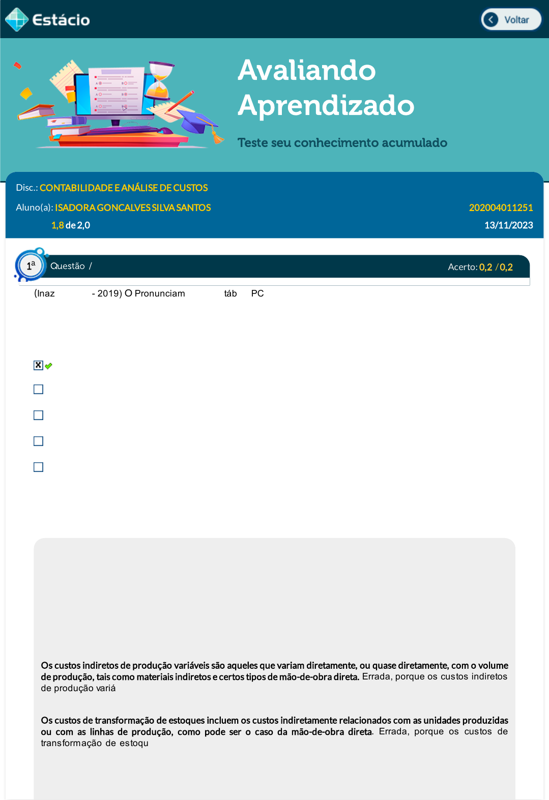 13/11/23, 12:54 Estácio: Alunos https://simulado.estacio.br/alunos/ 1/6 Avaliando Aprendizado Teste seu conhecimento acumulado Disc.: CONTABILIDADE E ANÁLISE DE CUSTOS Aluno(a): ISADORA GONCALVES SILVA SANTOS 202004011251 Acertos: 1,8 de 2,0 13/11/2023 Acerto: 0,2 / 0,2 (Inaz do Pará - 2019) O Pronunciamento Contábil CPC 16 (R2) ESTOQUES estabelece o tratamento contábil para os estoques. Esse Pronunciamento proporciona orientação sobre a determinação do valor de custo dos estoques e sobre o seu subsequente reconhecimento como despesa em resultado, incluindo qualquer redução ao valor realizável líquido, além de proporcionar orientação sobre o método e os critérios usados para atribuir custos aos estoques.Em sendo assim, assinale a alternativa correta de acordo com o que preniza o CPC 16 (R2): O valor de custo do estoque deve incluir todos os custos de aquisição e de transformação, bem como outros custos incorridos para trazer os estoques à sua condição e localização atuais. Os custos indiretos de produção variáveis são aqueles que variam diretamente, ou quase diretamente, com o volume de produção, tais como materiais indiretos e certos tipos de mão-de-obra direta. O custo dos estoques pode não ser recuperável se esses estoques estiverem danificados, se se tornarem total ou parcialmente obsoletos ou se os seus preços de venda tiverem aumentado. Os custos de transformação de estoques incluem os custos indiretamente relacionados com as unidades produzidas ou com as linhas de produção, como pode ser o caso da mão-de-obra direta. O custo dos estoques de itens que não são normalmente intercambiáveis e de bens ou serviços produzidos e segregados para projetos específicos deve ser atribuído pelo uso da identificação específica dos seus custos conjuntos. Respondido em 13/11/2023 12:43:24 Explicação: De acordo com o CPC 16, a resposta correta é a que diz: O valor de custo do estoque deve incluir todos os custos de aquisição e de transformação, bem como outros custos incorridos para trazer os estoques à sua condição e localização atuais. Correção dos itens: Os custos indiretos de produção variáveis são aqueles que variam diretamente, ou quase diretamente, com o volume de produção, tais como materiais indiretos e certos tipos de mão-de-obra direta. Errada, porque os custos indiretos de produção variáveis são aqueles que variam diretamente, ou quase diretamente, com o volume de produção, tais como materiais indiretos e certos tipos de mão de obra INDIRETA. Os custos de transformação de estoques incluem os custos indiretamente relacionados com as unidades produzidas ou com as linhas de produção, como pode ser o caso da mão-de-obra direta. Errada, porque os custos de transformação de estoques incluem os custos DIRETAMENTE relacionados com as unidades produzidas ou com as linhas de produção, como pode ser o caso da mão de obra direta. Também incluem a alocação sistemática de custos indiretos de produção, fixos e variáveis, que sejam incorridos para transformar os materiais em produtos acabados. Questão / 1 a https://simulado.estacio.br/alunos/inicio.asp https://simulado.estacio.br/alunos/inicio.asp javascript:voltar(); javascript:voltar(); 13/11/23, 12:54 Estácio: Alunos https://simulado.estacio.br/alunos/ 2/6 O custo dos estoques pode não ser recuperável se esses estoques estiverem dani�cados, se se tornarem total ou parcialmente obsoletos ou se os seus preços de venda tiverem aumentado. Errada, porque o custo dos estoques pode não ser recuperável se esses estoques estiverem danificados, se se tornarem total ou parcialmente obsoletos ou se os seus preços de venda tiverem DIMINUIDO. d. Errada, porque, o custo dos estoques de itens que não são normalmente intercambiáveis e de bens ou serviços produzidos e segregados para projetos específicos deve ser atribuído pelo uso da identificação específica dos seus custos INDIVIDUAIS. e. Correta: é o que prevê o CPD 16: O valor de custo do estoque deve incluir todos os custos de aquisição e de transformação, bem como outros custos incorridos para trazer os estoques à sua condição e localização atuais. Acerto: 0,0 / 0,2 Analise os dados da tabela a seguir, que representa dois coprodutos: Produto 1 Produto 2 Valor de Venda R$ 5,00 R$ 3,00 Quantidade 1500 2000 Ponderação 2 3 Custo Total R$ 10.000.00 Qual é o valor do custo a ser alocado no produto 2 pelo método do volume produzido? R$ 6.714,29 R$ 5.714,29 R$ 4.714,29 R$ 7.714,29 R$ 8.714,29 Respondido em 13/11/2023 12:44:21 Explicação: A resposta correta é: R$ 5.714,29 Acerto: 0,2 / 0,2 Uma empresa tem no estoque 500 produtos produzidos em abril ao custo de R$5,00 cada, 1.000 produzidos em maio ao custo de R$6,00 cada e 2.000 em junho a R$5,80 cada. Sabe-se que ela possui controle especí�co de estoque e que vendeu 200 produtos produzidos em abril e 50 produzidos em maio. Calcule o custo das mercadorias vendidas pelo método do preço especí�co. R$1.250,00 (PEPS) R$1.450,00 (UEPS) R$1.300,00 (PE) R$750,00 R$1.435,50 (custo médio) Respondido em 13/11/2023 12:46:03 Questão / 2 a Questão / 3 a 13/11/23, 12:54 Estácio: Alunos https://simulado.estacio.br/alunos/ 3/6 Explicação: A resposta correta é: R$1.300,00 (PE) Acerto: 0,2 / 0,2 Marque a alternativa que corresponde aos Centros de Custos: Não devem ser utilizados por empresas. Recebem lançamentos de débitos e créditos. Não recebem débitos nem créditos, mas ajudam no gerenciamento da empresa. Recebem apenas lançamentos de créditos. Recebem apenas lançamentos de débitos. Respondido em 13/11/2023 12:46:58 Explicação: A resposta correta é: Recebem apenas lançamentos de créditos. Acerto: 0,2 / 0,2 Os custos de transformação, também chamados custos de conversão, compreendem a soma de todos os custos para transformar as matérias-primas em produtos acabados. Representam o valor do esforço da própria empresa no pr