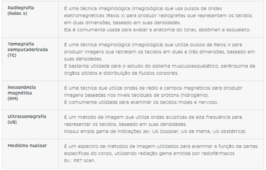 Radiologia Raio-X A radiografia é o método de imagem que utiliza Raios X ou ondas eletromagnéticas. Essas ondas passam através do corpo da pessoa, sendo alguns raios absorvidos pelos tecidos e outros não. Estes últimos alcançam o filme radiográfico que está logo atrás do corpo. Isto cria uma imagem bidimensional (plana), chamada de radiografia. Tecidos densos (como os ossos) vão absorver a maioria dos raios e aparecem nas radiografias como brancos, enquanto o ar não bloqueia nenhum raio e aparece preto. Outros tecidos estão dentro dessa escala de cinza. Essas regras se traduzem numa linguagem radiográfica básica: • Densidade ou opacidade se refere às áreas claras (brancas) da imagem. Exemplo: osso úmero • Lucência se refere a áreas escuras (pretas) da imagem. Exemplo: ar nos pulmões. O Raio X continua sendo uma modalidade de imagem médica amplamente utilizada, já que apresenta resolução espacial e permite a visualização de estruturas que são difíceis de serem percebidas em cortes axiais (secções transversais). A radiografia é utilizada principalmente nos Raios x de tórax, de abdômen e dos ossos. Tomografia computadorizada (TC) A tomografia computadorizada (TC), antigamente chamada de tomografia axial computadorizada, é outro método de imagem não invasivo. A TC também utiliza Raios x, mas a máquina é mais avançada. Ela roda ao redor de uma pessoa estacionária e cria múltiplas imagens de cortes transversais, que depois podem ser transformados em uma imagem em 3D. Como a TC utiliza Raios x, as imagens também dependem da densidade dos tecidos. A densidade é expressa em unidades de Hounsfield (HU), que vão de +1000 para os ossos (claros), passando em 0 para a água (cinza) e chegando até -1000 para o ar (escuro). Cada tecido do corpo tem sua densidade normal, que os radiologistas conhecem. Se a densidade está alterada, expressamos isto usando a terminologia da TC: hiperdenso, hipodenso ou isodenso, quando comparado a alguma outra estrutura. A vantagem da TC em relação ao raio X é a sua capacidade de visualização tridimensional do corpo, fornecendo uma representação mais precisa da área de interesse. Existem várias técnicas de TC, como a TC de fatia única (single slice), a TC helicoidal (espiral) e a TC de múltiplas fatias (multi slice). Essas técnicas oferecem variações nas espessuras dos cortes e nas doses de radiação utilizadas para criar a imagem. As máquinas de TC também podem mudar da “janela óssea” para a “janela de tecidos moles”, dependendo de qual estrutura queremos observar. Além disso, as imagens de TC podem ser feitas com contraste radiológico para ajudar na visualização de determinadas estruturas. É importante saber como se orientar nas imagens de TC. Para imagens axiais, imagine que você está olhando para a pessoa a partir de seus pés (vendo o corte da TC de baixo para cima), enquanto cada um de vocês está olhando para direções opostas. Então você pode se orientar utilizando a abreviação DAEP para as posições de 9,12,3 e 6 horas de um relógio. • 9 - direita • 12 - anterior • 3 - esquerda • 6 - posterior Ressonância magnética (RM) A RM é uma modalidade imaginológica (imagiológica) que, além da anatomia, pode mostrar alguns processos fisiológicos do corpo (RM funcional). Ela usa campos magnéticos e pulsos de radiofrequência para excitar prótons (íons hidrogênio) do nosso corpo. Os íons de hidrogênio excitados emitem sinais captados pelo scanner da RM que, baseado na intensidade do sinal, cria uma imagem em escala de cinza. Uma vez que somos feitos principalmente de gordura e de água, tem muito hidrogênio para se detectar. A densidade desses prótons nos nossos tecidos está relacionada à magnitude do sinal, ou seja, densidade aumentada significa sinal aumentado. Grande intensidade de sinal é representada em branco, moderada densidade de sinal, em cinza e baixa intensidade de sinal, em preto. Quando uma estrutura é mais clara do que deveria ser dizemos que ela é hiperintensa. Se ela for mais escura, então é hipointensa. A densidade de prótons está aumentada em alguns tipos de lesões, como edema, infecção, inflamação, desmielinização, hemorragia, alguns tumores e cistos. Em outros tipos, ela está reduzida, como no tecido cicatricial, calcificação, alguns tumores, formação de membranas e cápsulas. A RM não utiliza radiação, pode ser feita com contraste e qualquer plano do corpo pode ser analisado. Apesar de parecer o método de imagem perfeito, tem algumas desvantagens. A RM demora mais que a TC e pode ser desconfortável para algumas pessoas, já que a máquina é muito barulhenta e requer que a pessoa fique dentro de um tubo estreito (problemático para pessoas com claustrofobia). Além disso, a RM é absolutamente contraindicada em pacientes com implantes de metal, devido à intensidade do campo magnético criado. Com todas as suas propriedades, salvo contraindicações, a RM é a melhor técnica de imagem para tecidos moles. A RM oferece várias modalidades dentre as quais os radiologistas podem escolher, dependendo de qual estrutura eles querem focar. Os métodos básicos de RM são: • T1 - a imagem pesada em T1 mostra melhor estruturas compostas principalmente por gordura (fluidos são escuros / pretos, gordura é clara / branca). . • T2 - a imagem pesada em T2 apresenta estruturas feitas tanto de água quanto de gordura (gordura e fluidos são claros). • PD (densidade de prótons) - Densidade de prótons para o exame de músculos e ossos. • FLAIR (inversão recuperação) - Inversão recuperação com atenuação líquida mostra melhor o cérebro. É útil para identificar doenças do sistema nervoso central, como insultos cerebrovasculares, esclerose múltipla e meningite. • DWI (difusão) - a imagem pesada em difusão detecta a distribuição de fluidos (extra e intracelular) dentro dos tecidos. Como o balanço entre os 