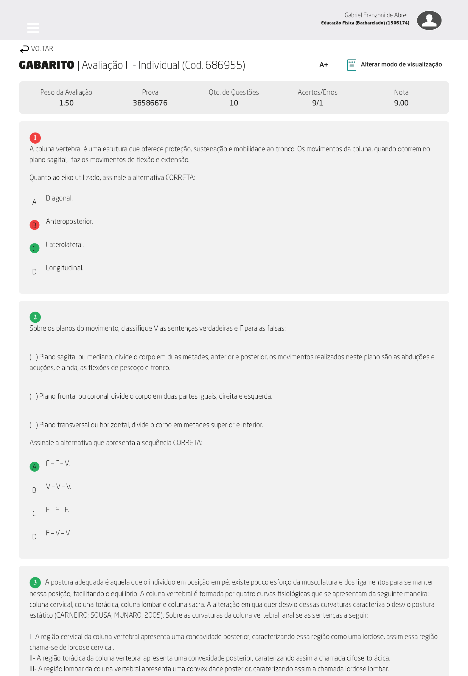 08/11/2023, 13:31 AVA https://ava2.uniasselvi.com.br/subject/grades-and-tests/answer-book/eyJ0ZXN0Ijp7InRlc3RDb2RlIjoiNjg2OTU1IiwiZGVzY3JpcHRpb24iOiJBdmFsaWHDp8OjbyBJSSAtIEluZGl2aWR1YWwiLCJwYXJhbWV0ZXIiOjU0… 1/5 GABARITO | Avaliação II - Individual (Cod.:686955) Peso da Avaliação 1,50 Prova 38586676 Qtd. de Questões 10 Acertos/Erros 9/1 Nota 9,00 A coluna vertebral é uma esrutura que oferece proteção, sustenação e mobilidade ao tronco. Os movimentos da coluna, quando ocorrem no plano sagital, faz os movimentos de flexão e extensão. Quanto ao eixo utilizado, assinale a alternativa CORRETA: A Diagonal. B Anteroposterior. C Laterolateral. D Longitudinal. Sobre os planos do movimento, classifique V as sentenças verdadeiras e F para as falsas: ( ) Plano sagital ou mediano, divide o corpo em duas metades, anterior e posterior, os movimentos realizados neste plano são as abduções e aduções, e ainda, as flexões de pescoço e tronco. ( ) Plano frontal ou coronal, divide o corpo em duas partes iguais, direita e esquerda. ( ) Plano transversal ou horizontal, divide o corpo em metades superior e inferior. Assinale a alternativa que apresenta a sequência CORRETA: A F – F – V. B V – V – V. C F – F – F. D F – V – V. A postura adequada é aquela que o indivíduo em posição em pé, existe pouco esforço da musculatura e dos ligamentos para se manter nessa posição, facilitando o equilíbrio. A coluna vertebral é formada por quatro curvas fisiológicas que se apresentam da seguinte maneira: coluna cervical, coluna torácica, coluna lombar e coluna sacra. A alteração em qualquer desvio dessas curvaturas caracteriza o desvio postural estático (CARNEIRO; SOUSA; MUNARO, 2005). Sobre as curvaturas da coluna vertebral, analise as sentenças a seguir: I- A região cervical da coluna vertebral apresenta uma concavidade posterior, caracterizando essa região como uma lordose, assim essa região chama-se de lordose cervical. II- A região torácica da coluna vertebral apresenta uma convexidade posterior, caraterizando assim a chamada cifose torácica. III- A região lombar da coluna vertebral apresenta uma convexidade posterior, caraterizando assim a chamada lordose lombar. VOLTAR A+ Alterar modo de visualização 1 2 3 Gabriel Franzoni de Abreu Educação Física (Bacharelado) (1906174)  08/11/2023, 13:31 AVA https://ava2.uniasselvi.com.br/subject/grades-and-tests/answer-book/eyJ0ZXN0Ijp7InRlc3RDb2RlIjoiNjg2OTU1IiwiZGVzY3JpcHRpb24iOiJBdmFsaWHDp8OjbyBJSSAtIEluZGl2aWR1YWwiLCJwYXJhbWV0ZXIiOjU0… 2/5 Assinale a alternativa CORRETA: CARNEIRO, José Ailton Oliveira; SOUSA, Lucas Matos de; MUNARO, Hector Luiz Rodrigues. Predominância de desvios posturais em estudantes de Educação Física da Universidade Estadual do Sudoeste da Bahia. Revista Saúde.com, Jequié, v. 1, n. 2, p. 118-123, out. 2005. A As sentenças I e III estão corretas. B As sentenças I e II estão corretas. C As sentenças II e III estão corretas. D Somente a sentença I está correta. Os planos de movimento são linhas imaginárias que passam pelo corpo humano com o objetivo de facilitar a análise do movimento de um segmento em relação ao outro. Qual plano divide o corpo em duas partes iguais, direita e esquerda, sendo os movimentos para frente e para trás, flexão e extensão? A Plano transversal. B Plano sagital. C Plano frontal. D Plano ventral. O quadril é uma grande articulação que liga o tronco e os membros inferiores do corpo. Ela possui formato semelhante a uma colher pegadora de sorvete. Pensando deste modo, a cabeça femoral, esférica, é o sorvete e o acetábulo, que tem forma de taça, a colher. A principal característica do quadril é sua estabilidade e sua amplitude de movimentos. Ele permite que a bacia gire, assim como garante que os membros inferiores façam o mesmo. Por isso os tipos de movimentos das pernas são tão variados. É o quadril também que dá estabilidade a todos esses movimentos, tornando fácil caminhar, agachar, pular e mais. Sobre os movimentos da articulação do quadril, assinale a alternativa CORRETA: A Flexão, abdução, adução e hiperxtensão. B Flexão, extensão e hiperxtensão. C Adução, lateral e extensão. D Flexão, extensão, abdução, adução, rotação medial, rotação lateral e circundução. 4 5 Gabriel Franzoni de Abreu Educação Física (Bacharelado) (1906174)  08/11/2023, 13:31 AVA https://ava2.uniasselvi.com.br/subject/grades-and-tests/answer-book/eyJ0ZXN0Ijp7InRlc3RDb2RlIjoiNjg2OTU1IiwiZGVzY3JpcHRpb24iOiJBdmFsaWHDp8OjbyBJSSAtIEluZGl2aWR1YWwiLCJwYXJhbWV0ZXIiOjU0… 3/5 Correlacione abaixo as ações cinesiológicas dos músculos dos punhos e das mãos com suas respectivas ações musculares: 1. Flexor e extensor radial do carpo. 2. Flexor e extensor ulnar do carpo. 3. Extensor dos dedos. 4. Extensor do polegar. 5. Oponente do polegar. ( ) Extensão da segunda, terceira, quarta e quinta falanges das articulações metacarpofalangianas. ( ) Tem ação na flexão, abdução do punho e pouca participação na flexão e extensão do cotovelo. ( ) Oposição carpometacarpal do polegar. ( ) Flexão e adução do punho e pouca participação na flexão do cotovelo e extensão e adução do punho e pouca participação na extensão do cotovelo. ( ) Realiza extensão do polegar na articulação metacarpofalangiana, abdução carpometacarpal e abdução de punho. Assinale a alternativa que apresenta a sequência CORRETA: A 5 – 1 – 2 – 3 – 4. B 4 – 1 – 5 – 2 – 3. C 3 – 1 – 5 – 2 – 4. D 1 – 4 – 5 – 3 – 2. Há músculos responsáveis tanto pela articulação do quadril quanto pela articulação do joelho. Sobre esses músculos, analise as opções a seguir: I- Reto femoral. II- Vasto lateral. III- Semimembranoso. IV- Isquiotibiais. V- Glúteo máximo. Assinale a alternativa CORRETA: 6 7 Gabriel Franzoni de Abreu Educação Física (Bacharelado) (1906174)  08/11/2023, 13:31 AVA https://ava2.uniasselvi.com.br/subj