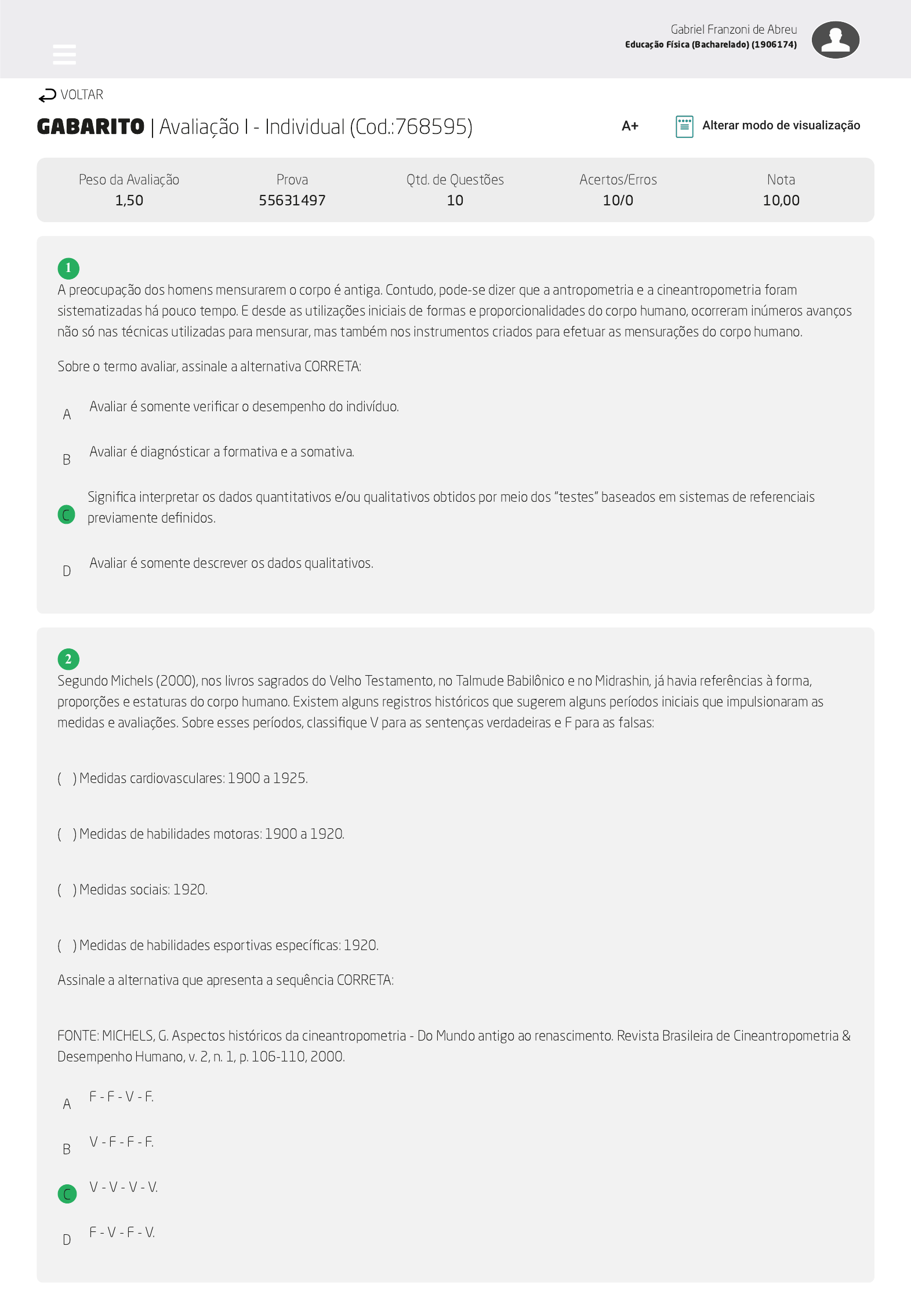 08/11/2023, 12:15 AVA https://ava2.uniasselvi.com.br/subject/grades-and-tests/answer-book/eyJ0ZXN0Ijp7InRlc3RDb2RlIjoiNzY4NTk1IiwiZGVzY3JpcHRpb24iOiJBdmFsaWHDp8OjbyBJIC0gSW5kaXZpZHVhbCIsInBhcmFtZXRlciI6MTI5M… 1/5 GABARITO | Avaliação I - Individual (Cod.:768595) Peso da Avaliação 1,50 Prova 55631497 Qtd. de Questões 10 Acertos/Erros 10/0 Nota 10,00 A preocupação dos homens mensurarem o corpo é antiga. Contudo, pode-se dizer que a antropometria e a cineantropometria foram sistematizadas há pouco tempo. E desde as utilizações iniciais de formas e proporcionalidades do corpo humano, ocorreram inúmeros avanços não só nas técnicas utilizadas para mensurar, mas também nos instrumentos criados para efetuar as mensurações do corpo humano. Sobre o termo avaliar, assinale a alternativa CORRETA: A Avaliar é somente verificar o desempenho do indivíduo. B Avaliar é diagnósticar a formativa e a somativa. C Significa interpretar os dados quantitativos e/ou qualitativos obtidos por meio dos “testes” baseados em sistemas de referenciais previamente definidos. D Avaliar é somente descrever os dados qualitativos. Segundo Michels (2000), nos livros sagrados do Velho Testamento, no Talmude Babilônico e no Midrashin, já havia referências à forma, proporções e estaturas do corpo humano. Existem alguns registros históricos que sugerem alguns períodos iniciais que impulsionaram as medidas e avaliações. Sobre esses períodos, classifique V para as sentenças verdadeiras e F para as falsas: ( ) Medidas cardiovasculares: 1900 a 1925. ( ) Medidas de habilidades motoras: 1900 a 1920. ( ) Medidas sociais: 1920. ( ) Medidas de habilidades esportivas específicas: 1920. Assinale a alternativa que apresenta a sequência CORRETA: FONTE: MICHELS, G. Aspectos históricos da cineantropometria - Do Mundo antigo ao renascimento. Revista Brasileira de Cineantropometria & Desempenho Humano, v. 2, n. 1, p. 106-110, 2000. A F - F - V - F. B V - F - F - F. C V - V - V - V. D F - V - F - V. VOLTAR A+ Alterar modo de visualização 1 2 Gabriel Franzoni de Abreu Educação Física (Bacharelado) (1906174) 08/11/2023, 12:15 AVA https://ava2.uniasselvi.com.br/subject/grades-and-tests/answer-book/eyJ0ZXN0Ijp7InRlc3RDb2RlIjoiNzY4NTk1IiwiZGVzY3JpcHRpb24iOiJBdmFsaWHDp8OjbyBJIC0gSW5kaXZpZHVhbCIsInBhcmFtZXRlciI6MTI5M… 2/5 Na educação física, avaliar a condição física do indivíduo é fundamental. Por exemplo, pode ser útil para avaliar a evolução das capacidades físicas após um programa de intervenção. Nessa perspectiva, há três diferentes tipos de avaliação: diagnóstica, formativa e somativa. Sobre esses três tipos, associe os itens, utilizando o código a seguir: ( ) Diagnóstica. ( ) Formativa. ( ) Somativa. ( ) É a soma de todas as avaliações realizadas no fim de cada unidade do planejamento, com o objetivo de obter um quadro geral da evolução do indivíduo. ( ) É a análise dos pontos fortes e fracos do indivíduo ou grupo de indivíduos, em relação a uma determinada característica. ( ) É o tipo de avaliação feita continuamente ao longo do processo de ensino-aprendizagem (avalia o progresso). Assinale a alternativa que apresenta a sequência CORRETA: A I - II - III. B III - I - II. C III - II - I. D II - III - I. A preocupação dos homens mensurarem o corpo é antiga. Contudo, pode-se dizer que a antropometria e a cineantropometria foram sistematizadas há pouco tempo. E desde as utilizações iniciais de formas e proporcionalidades do corpo humano, ocorreram inúmeros avanços não só nas técnicas utilizadas para mensurar, mas também nos instrumentos criados para efetuar as mensurações do corpo humano. Sobre os principais termos frequentemente utilizados pelos professores de educação física, assinale a alternativa CORRETA: A Testar, medir e avaliar. B Observar, medir e avaliar. C Iniciar, medir e avaliar. D Utilizar, medir e avaliar. Testar, medir e avaliar são terminologias importantes para a compreensão dos conteúdos de medidas e avaliações na área da Educação Física. Porém, muitas vezes, são erroneamente entendidos como sinônimos. Com relação ao conceito dessas terminologias, assinale a alternativa CORRETA: A Avaliar significa descrever fenômenos do ponto de vista quantitativo. É o resultado obtido através da coleta realizada por um instrumento, procedimento ou técnica atribuindo-se a ela um valor numérico, e devem ser precisas e objetivas. 3 4 5 Gabriel Franzoni de Abreu Educação Física (Bacharelado) (1906174) 08/11/2023, 12:15 AVA https://ava2.uniasselvi.com.br/subject/grades-and-tests/answer-book/eyJ0ZXN0Ijp7InRlc3RDb2RlIjoiNzY4NTk1IiwiZGVzY3JpcHRpb24iOiJBdmFsaWHDp8OjbyBJIC0gSW5kaXZpZHVhbCIsInBhcmFtZXRlciI6MTI5M… 3/5 B Avaliar significa interpretar dados quantitativos e qualitativos a fim de obter parecer ou julgamento de valores com bases em referenciais previamente definidos. C Medir significa verificar o desempenho do indivíduo mediante situações previamente organizadas e padronizadas. Essas situações padronizadas são denominadas medidas. D As medidas podem ocorrer por meio de escrita, observação ou performance. Alguns exemplos de medidas são: medida de estatura, medida para verificar o conhecimento, medida de Cooper, medida de sentar e alcançar, entre outros de não menor importância. O conceito de cineantropometria é importante para nossos estudos. Qual é esse conceito? A Medida do homem em movimento. B Avaliação do homem. C Avaliação do IMC. D Medir o homem. Normalmente os erros de medida são causados pelas constantes alterações que podem surgir. Em destaque podemos colocar aspectos relacionados aos avaliadores, aos avaliados e aos instrumentos utilizados na avaliação. Sobre a classificação e os erros de medidas, assinale a alternativa CORRETA: A Sistemáticos e involuntários. B Científicos e complexos. C Empíricos e aleatórios. D Sistemáticos e aleatórios. No cenário de medidas e avaliaçõ