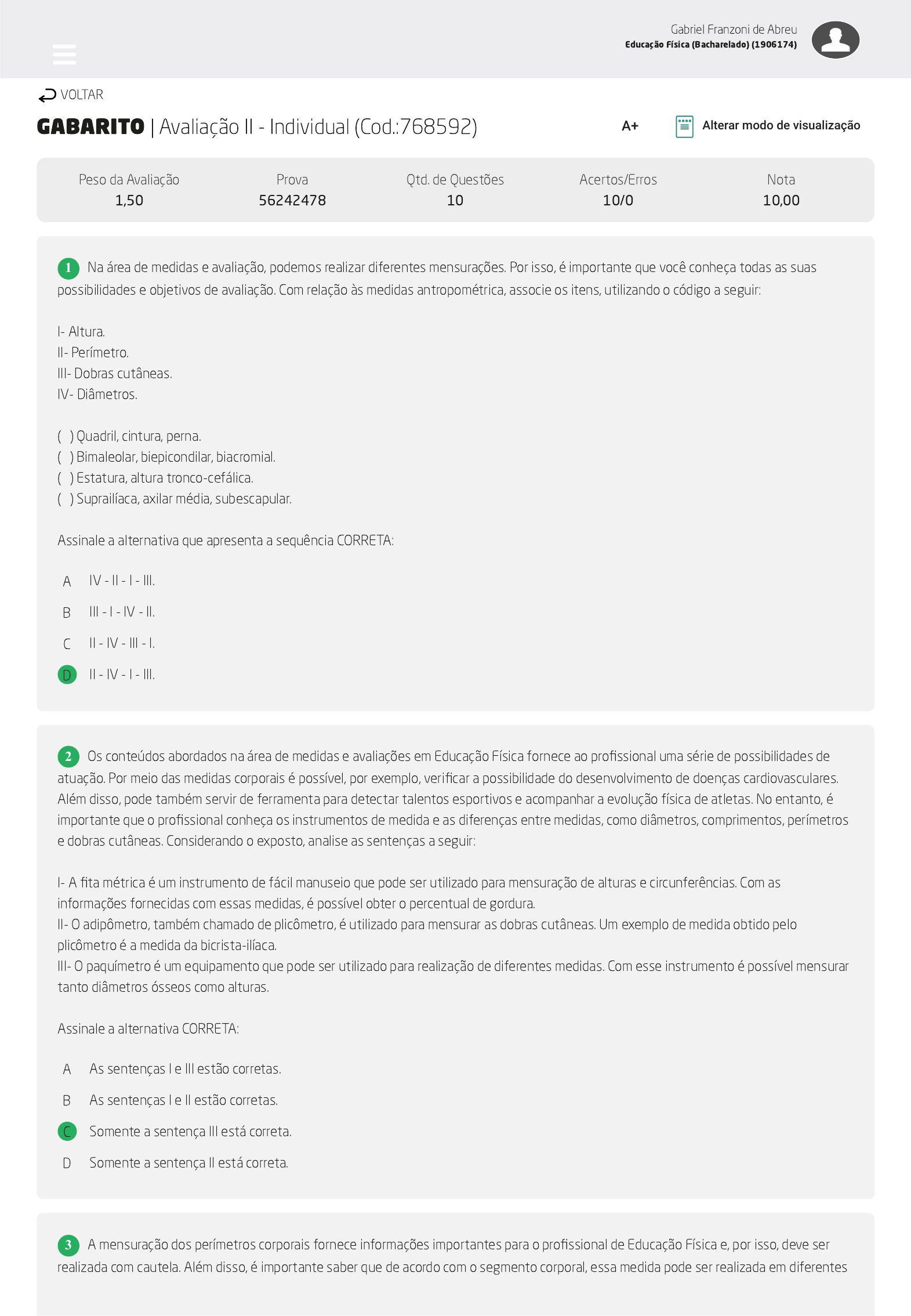 08/11/2023, 12:15 AVA https://ava2.uniasselvi.com.br/subject/grades-and-tests/answer-book/eyJ0ZXN0Ijp7InRlc3RDb2RlIjoiNzY4NTkyIiwiZGVzY3JpcHRpb24iOiJBdmFsaWHDp8OjbyBJSSAtIEluZGl2aWR1YWwiLCJwYXJhbWV0ZXIiOjU… 1/4 GABARITO | Avaliação II - Individual (Cod.:768592) Peso da Avaliação 1,50 Prova 56242478 Qtd. de Questões 10 Acertos/Erros 10/0 Nota 10,00 Na área de medidas e avaliação, podemos realizar diferentes mensurações. Por isso, é importante que você conheça todas as suas possibilidades e objetivos de avaliação. Com relação às medidas antropométrica, associe os itens, utilizando o código a seguir: I- Altura. II- Perímetro. III- Dobras cutâneas. IV- Diâmetros. ( ) Quadril, cintura, perna. ( ) Bimaleolar, biepicondilar, biacromial. ( ) Estatura, altura tronco-cefálica. ( ) Suprailíaca, axilar média, subescapular. Assinale a alternativa que apresenta a sequência CORRETA: A IV - II - I - III. B III - I - IV - II. C II - IV - III - I. D II - IV - I - III. Os conteúdos abordados na área de medidas e avaliações em Educação Física fornece ao profissional uma série de possibilidades de atuação. Por meio das medidas corporais é possível, por exemplo, verificar a possibilidade do desenvolvimento de doenças cardiovasculares. Além disso, pode também servir de ferramenta para detectar talentos esportivos e acompanhar a evolução física de atletas. No entanto, é importante que o profissional conheça os instrumentos de medida e as diferenças entre medidas, como diâmetros, comprimentos, perímetros e dobras cutâneas. Considerando o exposto, analise as sentenças a seguir: I- A fita métrica é um instrumento de fácil manuseio que pode ser utilizado para mensuração de alturas e circunferências. Com as informações fornecidas com essas medidas, é possível obter o percentual de gordura. II- O adipômetro, também chamado de plicômetro, é utilizado para mensurar as dobras cutâneas. Um exemplo de medida obtido pelo plicômetro é a medida da bicrista-ilíaca. III- O paquímetro é um equipamento que pode ser utilizado para realização de diferentes medidas. Com esse instrumento é possível mensurar tanto diâmetros ósseos como alturas. Assinale a alternativa CORRETA: A As sentenças I e III estão corretas. B As sentenças I e II estão corretas. C Somente a sentença III está correta. D Somente a sentença II está correta. A mensuração dos perímetros corporais fornece informações importantes para o profissional de Educação Física e, por isso, deve ser realizada com cautela. Além disso, é importante saber que de acordo com o segmento corporal, essa medida pode ser realizada em diferentes VOLTAR A+ Alterar modo de visualização 1 2 3 Gabriel Franzoni de Abreu Educação Física (Bacharelado) (1906174) 08/11/2023, 12:15 AVA https://ava2.uniasselvi.com.br/subject/grades-and-tests/answer-book/eyJ0ZXN0Ijp7InRlc3RDb2RlIjoiNzY4NTkyIiwiZGVzY3JpcHRpb24iOiJBdmFsaWHDp8OjbyBJSSAtIEluZGl2aWR1YWwiLCJwYXJhbWV0ZXIiOjU… 2/4 partes. Na coxa, por exemplo, o perímetro pode ser mensurado em diferentes partes do segmento corporal. Sobre o perímetro da coxa, assinale a alternativa CORRETA: A Para mensuração do perímetro da coxa, o avaliador deve se posicionar em frente ao avaliado. B Durante a mensuração do perímetro da coxa, o avaliado permanece com o joelho flexionado. C Para mensuração do perímetro medial da coxa, usa-se a maior porção da coxa como referência. D A referência utilizada para mensuração do perímetro proximal da coxa é a prega glútea. Existem diversos métodos para a avaliação do crescimento de indivíduos, mas o método mais prático e de baixo custo é a utilização de medidas antropométricas. Para o acompanhamento do crescimento destes indivíduos, existem algumas medidas imprescindíveis e normalmente utilizadas na prática pelos profissionais de Educação Física, como as alturas e a massa corporal. Quanto às principais medidas de altura, assinale a alternativa CORRETA: A Estatura e comprimento de membros. B Estatura sentada e diâmetros ósseos. C Estatura e altura tronco-cefálica. D Comprimento de membros e altura tronco-cefálica. Existem algumas técnicas utilizadas nas medidas e avaliações. Quais são elas? A Internas, diretas e duplamente diretas. B Internas, indiretas e duplamente indiretas. C Diretas, internas e duplamente indiretas. D Diretas, indiretas e duplamente indiretas. Existem diversos métodos para a avaliação do crescimento de indivíduos, mas o método mais prático e de baixo custo é utilização de medidas antropométricas. As principais medidas antropométricas podem ser divididas em diferentes categorias. Dentro destas categorias existem as medidas que são realizadas propriamente ditas. Quanto a estas categorias, associe os itens, utilizando o código a seguir: I- Cintura e quadril. II- Tricipital e subescapular. III- Biestiloide e biacromial. IV- De membros inferiores. ( ) Dobras cutâneas. ( ) Diâmetros. ( ) Perímetros. ( ) Comprimentos. Assinale a alternativa que apresenta a sequência CORRETA: A IV - II - I - III. B II - III - I - IV. C II - III - IV - I. 4 5 6 Gabriel Franzoni de Abreu Educação Física (Bacharelado) (1906174) 08/11/2023, 12:15 AVA https://ava2.uniasselvi.com.br/subject/grades-and-tests/answer-book/eyJ0ZXN0Ijp7InRlc3RDb2RlIjoiNzY4NTkyIiwiZGVzY3JpcHRpb24iOiJBdmFsaWHDp8OjbyBJSSAtIEluZGl2aWR1YWwiLCJwYXJhbWV0ZXIiOjU… 3/4 D I - III - II - IV. Há muitas técnicas e métodos para analisar a composição corporal, porém cada uma possui respaldo em modelos teóricos distintos. O modelo atualmente mais recomendado para analisar a composição corporal é organizado em cinco níveis. Nesse contexto, associe os itens, utilizando o código a seguir: I- Nível Atômico. II- Nível Molecular. III- Nível Celular. IV- Sistema Tecidular. V- Corpo inteiro. ( ) Fluídos extracelulares e massa celular. ( ) Hidrogênio, oxigênio e carbono. ( ) Todas as estruturas que c