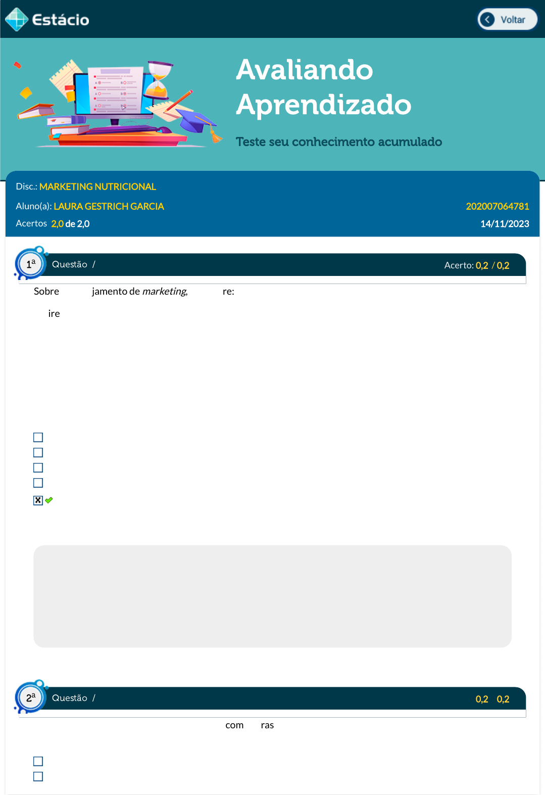 14/11/23, 19:21 Estácio: Alunos https://simulado.estacio.br/alunos/ 1/6 Avaliando Aprendizado Teste seu conhecimento acumulado Disc.: MARKETING NUTRICIONAL Aluno(a): LAURA GESTRICH GARCIA 202007064781 Acertos: 2,0 de 2,0 14/11/2023 Acerto: 0,2 / 0,2 Sobre o planejamento de marketing, considere: I. Direcionar a estratégia da empresa para grupos de clientes especí�cos. II. Identi�car boas oportunidades de negócio. III. Elaborar o �uxo de caixa da empresa. IV. Produzir sozinho valor superior para os clientes. V. Estabelecer indicadores para mensuração de desempenho.Para apoiar o planejamento estratégico de uma empresa, são utilizados os objetivos do planejamento de marketing constantes apenas em: II, III e IV III, IV e V I, III e V I, II e IV I, II Respondido em 14/11/2023 17:39:46 Explicação: O plano de marketing é um amplo mapeamento do mercado, do público-alvo mais interessante para a empresa e do posicionamento da organização em relação a esses elementos. Assim, ele é um documento que ajuda a orientar as ações de marketing, com objetivo de atrair e reter um público especí�co. Ao mesmo tempo, ele de�ne ações que ajudem a expandir e �delizar os clientes. Para de�nir os seus objetivos de marketing com sucesso é necessário entender que, para qualquer estratégia, é preciso de�nir o fator de tempo, período e prazo, pois os objetivos nada mais são que a especi�cação dos resultados esperados. Acerto: 0,2 / 0,2 As normas da família ISO 9000, juntamente com outras normas, revelam um consenso mundial sobre sistemas de gestão integrados que in�uenciam o cotidiano de diversas instituições. São propósitos da referida norma: Aumentar o número de diretrizes, com o objetivo de esclarecer sua aplicação. Comandar a gestão das organizações para poder certi�cá-las. Questão / 1 a Questão / 2 a https://simulado.estacio.br/alunos/inicio.asp https://simulado.estacio.br/alunos/inicio.asp javascript:voltar(); javascript:voltar(); 14/11/23, 19:21 Estácio: Alunos https://simulado.estacio.br/alunos/ 2/6 Adequar aos pedidos dos setores especí�cos, não servindo para todos. Contemplar a evolução das necessidades dos usuários e clientes. Resolver somente as di�culdades encontradas pelos grandes negócios. Respondido em 14/11/2023 17:42:24 Explicação: As normas NBR ISO 9000 podem auxiliar a resolver as di�culdades encontradas tanto pelos pequenos quanto pelos grandes negócios. São especialmente úteis para os pequenos negócios, pois estes geralmente não dispõem de especialistas ou de departamentos voltados exclusivamente para a gestão da qualidade. Tais normas podem ser aplicadas a diferentes setores, como serviços de saúde, educação, tecnologia da informação, entre outros. As normas NBR ISO 9000 reduziram o número de diretrizes que foram surgindo, com o objetivo de esclarecer sua aplicação. Dessa forma, essas normas permitem contemplar a evolução das necessidades dos usuários e clientes. É importante ressaltar que as normas NBR ISO 9000 não comandam a gestão das organizações, elas orientam a gestão das organizações para que estas possam receber a certi�cação. Acerto: 0,2 / 0,2 As diversas informações são importantes para as empresas, e por isso é necessário que estas busquem conhecer ao máximo o mercado, a�nal é preciso maximizar ao máximo as chances de troca. Quanto mais se conhece um mercado, mais estratégias podem ser empregadas, e uma delas refere-se ao preço. Kotler e Keller (2006), destacam condições essenciais para que ocorra a troca. Desta maneira, analise as asserções abaixo e marque a opção correta. I. Todas as partes que estão envolvidas no processo de troca, devem ter algo que venha a interessar ao outro. Neste caso é preciso no mínimo duas partes; II. Ter capacidade de comunicação e entrega é indispensável para ambas as partes envolvidas no processo de troca; III. A oferta de troca pode perfeitamente ser aceita ou recusada por ambas as partes envolvidas. KELLER, K.L. & KOTLER, P. Administração de Marketing. 12ª ed. São Paulo: Pearson, 2006 A asserção I é uma proposição verdadeira, e as II e III são falsas. As asserções I e II são proposições falsas, e a III é verdadeira. A asserção I é uma proposição falsa, e as II e III são verdadeiras. As asserções I, II e III são proposições verdadeiras. As asserções I, II e III são proposições falsas. Respondido em 14/11/2023 19:07:28 Explicação: O processo de troca deve ser considerado quando ambas as partes se interessam pelo produto ou serviço, levando à transação. Os interessados precisam falar uma linguagem que ambos entendam, podendo antes do fechamento, recusar a oferta, caso não atenda as expectativas criadas. No processo de troca, também se considera a capacidade de entrega. Acerto: 0,2 / 0,2 (KOTLER / 2003) a�rma que o cliente é nosso visitante mais importante. Ele não depende de nós - nós é que dependemos dele. Não é um estranho em nosso negócio - é parte dele. Não prestamos nenhum favor aos clientes quando os servimos, ao contrário, ele é que nos presta um favor, ao dar-nos a oportunidade de servi-lo. Seguindo a premissa do autor, assinale a alternativa correta quanto ao assunto abordado: Questão / 3 a Questão / 4 a 14/11/23, 19:21 Estácio: Alunos https://simulado.estacio.br/alunos/ 3/6 Relacionamento e atendimento ao cliente. Relações públicas. Responsabilidade social. Marketing pessoal. Comunicação organizacional. Respondido em 14/11/2023 17:45:22 Explicação: Gabarito: Relacionamento e atendimento ao cliente. Justi�cativa: O marketing de relacionamento é caracterizado pela construção de relações longevas com os consumidores. Sabe-se que os clientes muitas vezes são volúveis, não se �delizando com determinada marca e, por isso, competir no mercado para adquirir novos clientes pode até ser mais fácil do que manter um cliente �el. Por conta disso