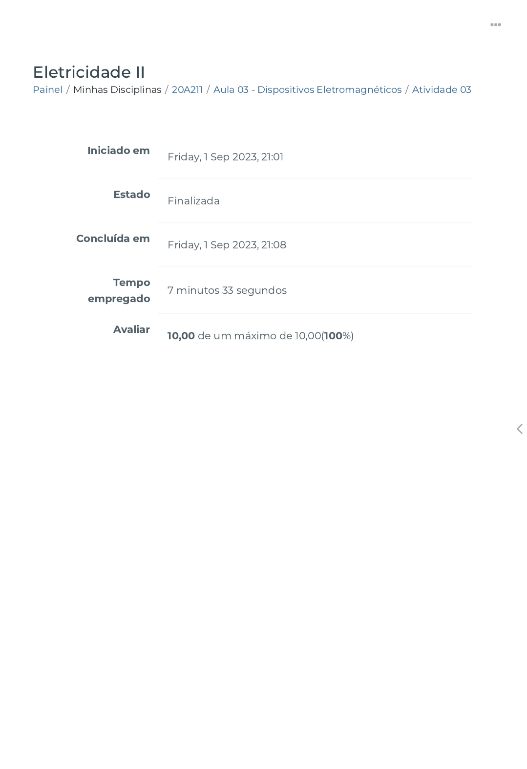 14/11/2023, 21:51 Atividade 03 https://ava.politecnicabr.com.br/mod/quiz/review.php?attempt=5525654 1/7 Painel / Minhas Disciplinas / 20A211 / Aula 03 - Dispositivos Eletromagnéticos / Atividade 03 Eletricidade II Iniciado em Friday, 1 Sep 2023, 21:01 Estado Finalizada Concluída em Friday, 1 Sep 2023, 21:08 Tempo empregado 7 minutos 33 segundos Avaliar 10,00 de um máximo de 10,00(100%) https://ava.politecnicabr.com.br/my/ https://ava.politecnicabr.com.br/my/ https://ava.politecnicabr.com.br/course/view.php?id=947 https://ava.politecnicabr.com.br/course/view.php?id=947#section-5 https://ava.politecnicabr.com.br/mod/quiz/view.php?id=32631 https://ava.politecnicabr.com.br/ 14/11/2023, 21:51 Atividade 03 https://ava.politecnicabr.com.br/mod/quiz/review.php?attempt=5525654 2/7 Questão 1 Correto Atingiu 2,00 de 2,00 Um transformador ideal tem 200 espiras no primário e 800 espiras no secundário. Aplicando uma tensão de 10V rms ao primário, qual o valor da corrente que circula através da carga R1? Escolha uma opção: a. 0,4 A b. 10 A c. 4 A d. 0,2 A e. 20 A https://ava.politecnicabr.com.br/ 14/11/2023, 21:51 Atividade 03 https://ava.politecnicabr.com.br/mod/quiz/review.php?attempt=5525654 3/7 Questão 2 Correto Atingiu 2,00 de 2,00 Um transformador ideal tem 200 espiras no primário e 800 espiras no secundário. Aplicando uma tensão de 10V rms no primário, qual o valor da tensão induzida no secundário? Escolha uma opção: a. 2,5V rms b. 400V rms c. 20V rms d. 40V rms https://ava.politecnicabr.com.br/ 14/11/2023, 21:51 Atividade 03 https://ava.politecnicabr.com.br/mod/quiz/review.php?attempt=5525654 4/7 Questão 3 Correto Atingiu 2,00 de 2,00 É um dispositivo eletromecânico que permite controlar uma corrente de grade valor a partir de uma pequena corrente. Escolha uma opção: a. Transformador b. Bobina c. Espira d. Relé https://ava.politecnicabr.com.br/ 14/11/2023, 21:51 Atividade 03 https://ava.politecnicabr.com.br/mod/quiz/review.php?attempt=5525654 5/7 Questão 4 Correto Atingiu 2,00 de 2,00 São correntes induzidas no ferro pelo �uxo variável. Escolha uma opção: a. Correntes de Induzidos b. Correntes de Acoplamento c. Correntes de Enrolamento d. Correntes de Foucalt https://ava.politecnicabr.com.br/ 14/11/2023, 21:51 Atividade 03 https://ava.politecnicabr.com.br/mod/quiz/review.php?attempt=5525654 6/7 Questão 5 Correto Atingiu 2,00 de 2,00 É um dispositivo que permite modi�car a amplitude de uma tensão alternada, aumentando-a ou diminuindo-a. Escolha uma opção: a. Número de Espiras b. Relé c. Núcleo de Ferro d. Transformador Entre em Contato https://www.politecnicabr.com.br 0800 084 2627 0800 084 2627 Links Úteis Dicas da nossa Diretora Acadêmica Planner de Estudos Declaração de Matrícula Orientações do AVA Abertura de Ticket Fale com o Tutor Cronograma de Estudos Manual de Estágio Manual de Competência Siga-nos nas redes sociais https://www.politecnicabr.com.br/ https://soundcloud.com/user-501638417/sets/escola-politecnica-brasileira https://soundcloud.com/user-501638417/sets/escola-politecnica-brasileira https://storage.googleapis.com/sirius-pubstore/semestre_plannerdeestudo%20poli.pdf https://storage.googleapis.com/sirius-pubstore/semestre_plannerdeestudo%20poli.pdf https://storage.googleapis.com/sirius-pubstore/declaracao_matricula.pdf https://storage.googleapis.com/sirius-pubstore/declaracao_matricula.pdf https://storage.googleapis.com/sirius-pubstore/orientacoes_ava.pdf https://storage.googleapis.com/sirius-pubstore/orientacoes_ava.pdf https://storage.googleapis.com/sirius-pubstore/abertura_ticket.pdf https://storage.googleapis.com/sirius-pubstore/abertura_ticket.pdf https://storage.googleapis.com/sirius-pubstore/fale_com_tutor.pdf https://storage.googleapis.com/sirius-pubstore/fale_com_tutor.pdf https://storage.googleapis.com/sirius-pubstore/cronograma_estudos.pdf https://storage.googleapis.com/sirius-pubstore/cronograma_estudos.pdf https://storage.googleapis.com/sirius-pubstore/manual_estagio.pdf https://storage.googleapis.com/sirius-pubstore/manual_estagio.pdf https://storage.googleapis.com/sirius-pubstore/manual_competencia.pdf https://storage.googleapis.com/sirius-pubstore/manual_competencia.pdf https://ava.politecnicabr.com.br/ 14/11/2023, 21:51 Atividade 03 https://ava.politecnicabr.com.br/mod/quiz/review.php?attempt=5525654 7/7 © 2022 - Escola Politécnica Brasileira https://ava.politecnicabr.com.br/mod/quiz/0 https://ava.politecnicabr.com.br/mod/quiz/0 https://www.facebook.com/politecnicabr https://www.instagram.com/politecnicabr_oficial https://ava.politecnicabr.com.br/