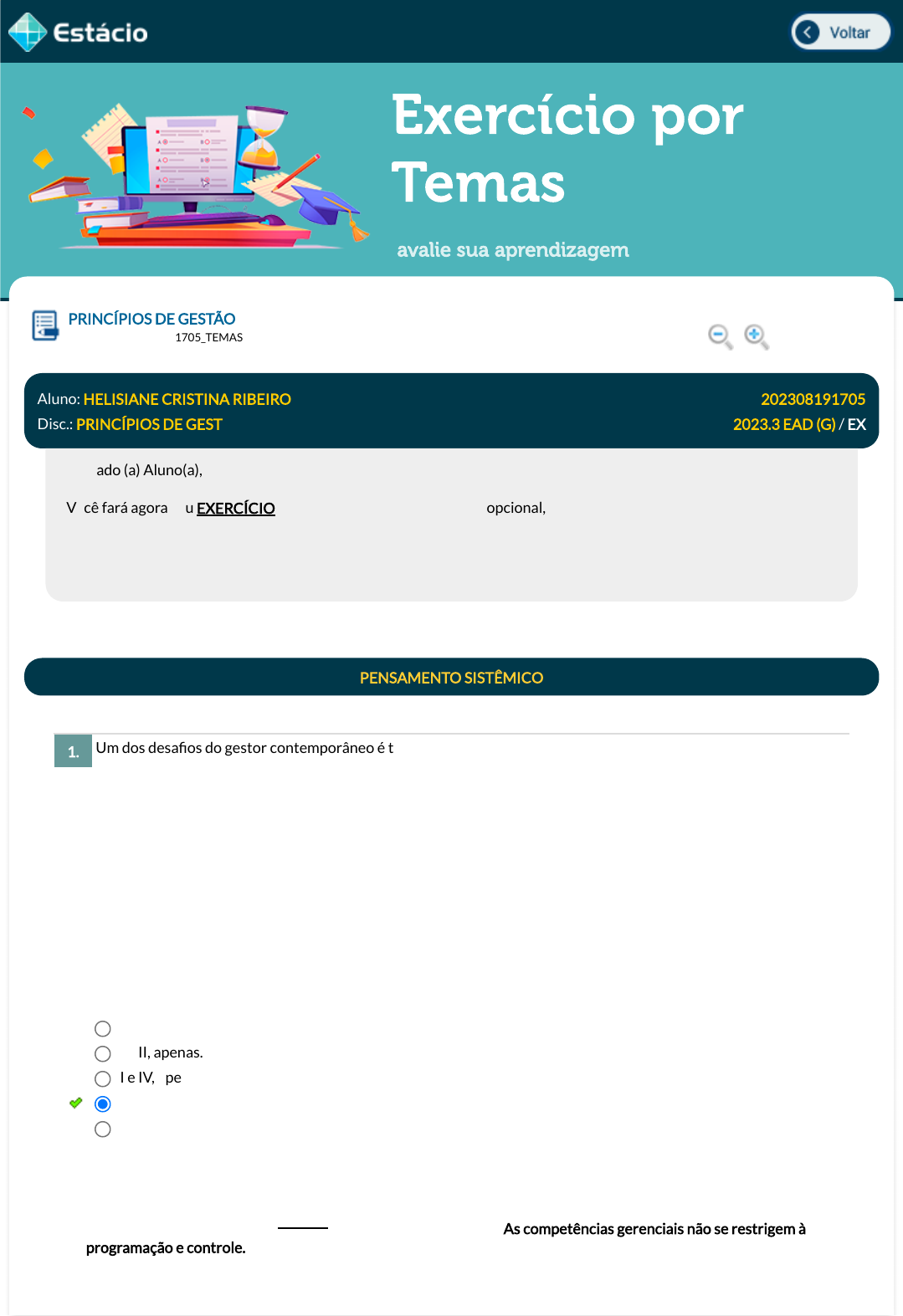 15/11/2023, 11:49 Estácio: Alunos https://simulado.estacio.br/alunos/ 1/6 Exercício por Temas avalie sua aprendizagem Um dos desa�os do gestor contemporâneo é ter capacidade para gerir organizações em ambientes mutáveis e turbulentos. As pressões do ambiente externo causam impacto no gerenciamento das empresas e as principais mudanças necessárias envolvem: I- a criação de estruturas e formas de organização do trabalho adaptáveis às contingências impostas pelo ambiente; II- processos decisórios ágeis e focados nas exigências do mercado; III- empregados com posturas criativas, de análise e pensamento crítico; IV- competências gerenciais restritas à programação e controle. Estão corretos os itens: PRINCÍPIOS DE GESTÃO Lupa DGT0005_202308191705_TEMAS Aluno: HELISIANE CRISTINA RIBEIRO Matr.: 202308191705 Disc.: PRINCÍPIOS DE GEST 2023.3 EAD (G) / EX Prezado (a) Aluno(a), Você fará agora seu EXERCÍCIO! Lembre-se que este exercício é opcional, mas não valerá ponto para sua avaliação. O mesmo será composto de questões de múltipla escolha. Após responde cada questão, você terá acesso ao gabarito comentado e/ou à explicação da mesma. Aproveite para se familiarizar com este modelo de questões que será usado na sua AV e AVS. PENSAMENTO SISTÊMICO 1. II e IV, apenas. I e II, apenas. I e IV, apenas. I, II e III, apenas. III e IV, apenas. Data Resp.: 15/11/2023 11:33:33 Explicação: IV- competências gerenciais restritas à programação e controle. As competências gerenciais não se restrigem à programação e controle. javascript:voltar(); javascript:voltar(); javascript:voltar(); javascript:voltar(); javascript:diminui(); javascript:diminui(); javascript:aumenta(); javascript:aumenta(); 15/11/2023, 11:49 Estácio: Alunos https://simulado.estacio.br/alunos/ 2/6 O Banco LUCROS S/A. adquiriu, há um mês, uma empresa de software, que possuía 15% do mercado de programas de segurança bancária. Após uma análise organizacional, percebeu-se que a expansão desejada não ocorria em razão da falta de agressividade da empresa e de sua estrutura verticalizada e inflexível. O Banco decidiu, então, implementar uma transformação interna para tornar-se uma organização com forte capacidade de adaptação às novas tendências de mercado. Assim, será necessário que a empresa: I- seja voltada para o cliente; II- valorize a criatividade e a inovação; III- se baseie em metas que possam atender seus diversos grupos de interesse, entre eles, clientes, empregados e acionistas. Está(ão) correto(s): Por muito tempo o conceito de produção em massa foi amplamente utilizado pelas organizações e sua in�uência se estendeu para além das fronteiras geográ�cas e ideológicas. Quais foram as condições socioeconômicas que favoreceram a disseminação desse conceito? O termo VUCA tem sido utilizado para descrever o mundo atual e seus desa�os. Esse acrônimo é uma forma de representar as mudanças rápidas e constantes que ocorrem na sociedade, na economia e na política. O que signi�ca o termo VUCA? 2. apenas o item II. os itens I, II e III. apenas os itens II e III. apenas os itens I e II. apenas o item I. Data Resp.: 15/11/2023 11:31:55 Explicação: As três a�rmativas estão corretas. Empresas com forte capacidade de adaptação devem ser voltadas par o cliente, valorizar a criatividade e a inovação e se basear em metas que atendam aos steakholders. De fato, uma cultura voltada para o cliente permite melhor percepção das tendências do mercado. Enquanto isso metas que atendem aos steakholders são uma forma de manter os envolvidos motivados e com sua melhor produtividade. Além disso, é essencial uma cultura que valorize a criatividade e a inovação para uma empresa que pretende se adaptar às tendências do mercado. 3. Centralização dos mercados, crescimento econômico lento e força de trabalho desquali�cada. Descentralização dos mercados, crescimento econômico lento e força de trabalho altamente quali�cada. Concentração dos mercados, crescimento econômico lento e força de trabalho altamente quali�cada. Concentração dos mercados, crescimento econômico acelerado e força de trabalho desquali�cada. Centralização dos mercados, crescimento econômico acelerado e força de trabalho altamente quali�cada. Data Resp.: 15/11/2023 11:30:11 Explicação: O conceito de produção em massa foi usado por organizações durante décadas e sua in�uência ultrapassou fronteiras geográ�cas e ideológicas. A forte concentração dos mercados, o crescimento econômico acelerado, a força de trabalho desquali�cada, o desperdício e a falta de e�ciência foram condições socioeconômicas da época que favoreceram a multiplicação do modelo por outras empresas. 4. 15/11/2023, 11:49 Estácio: Alunos https://simulado.estacio.br/alunos/ 3/6 O equilíbrio de interesses em uma empresa refere-se à busca por uma relação justa e equilibrada entre as diversas partes interessadas ou stakeholders, como funcionários, clientes, fornecedores, acionistas, comunidade local, entre outros. Qual é a importância desse equilíbrio para o sucesso de uma organização? A Administração é uma ciência que tem como objeto de estudo a organização. Segundo Sobral e Peci (SOBRAL, Felipe; PECI, Alketa. Administração: Teoria e prática no contexto brasileiro. 2. ed. São Paulo: Pearson, 2013) qual é a de�nição de organização? Volatilidade, incerteza, complexidade, ambiguidade. Voluntariedade, uni�cação, coerência, adaptabilidade. Voluntariedade, unicidade, clareza, ação. Volatilidade, unicidade, coerência, ação. Volatilidade, incerteza, clareza, adaptabilidade. Data Resp.: 15/11/2023 11:27:41 Explicação: VUCA, signi�ca: V - Volatilidade U - Incerteza C - Complexidade A - Ambiguidade 5. É importante para garantir conexões positivas entre stakeholders e melhores resultados. É importante apenas para empresas que at