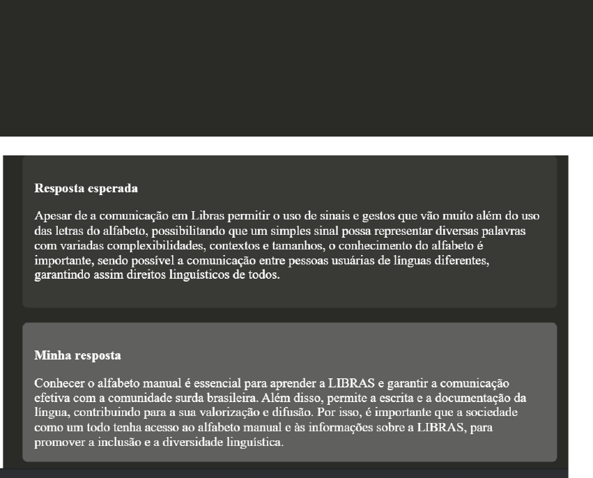 1 [Laboratório Virtual – O Alfabeto em Libras] Com base nos estudos realizados no laboratório virtual sobre a forma de comunicação entre pessoas surdas e ouvintes, é possível notar que a Língua Brasileira de Sinais e o alfabeto em Libras não são sinônimos. Nesse sentido, disserte sobre a importância de conhecer o alfabeto manual para aprender a Língua Brasileira de Sinais. É de suma importância o conhecimento do alfabeto manual devido ao fato de que apesar da LIBRAS possuir uma gama surpreendente maior que o número de letras do alfabeto, levando em conta que os gestos reproduzidos por uma pessoa surda/muda pode ter uma grande variedade de significados dependendo do modo que é reproduzido, o conhecimento do alfabeto leva a comunicação de indivíduos com nacionalidades diferentes (o que também acarreta línguas diferentes), podendo ser incluídos na sociedade não só pessoas surdas/mudas como a inclusão de todos os cantos do mundo . 2 [Laboratório Virtual – O Alfabeto em Libras] O alfabeto, assim como em toda e qualquer língua, tem como finalidade a formação de palavras que transmitem diversos tipos de significado. Nesse contexto, descreva quatro características principais do alfabeto em LIBRAS. O alfabeto em libras tem como principal característica a “escrita” feita no ar, possibilitando a comunicação não escrita (em papel) entre indivíduos surdos/mudos e outras pessoas, ambas as partes devem ter conhecimento tanto pratico quanto teórico, pois este tipo de comunicação leva tampo para ser adquirida por maio de treinamento e principalmente memorização, também se leva em conta que pode ser feito com as duas mãos, para facilitar a comunicação entre pessoas de pessoas destras ou canhotas, não ficando delimitadas as coordenações motoras de suas mãos, além disso ela é geralmente usada com nomes, pois a maioria das demais palavras tem seus gestos próprios, agora os nomes de lugares e pessoas devem ser feitos utilizando o alfabeto em libras, sempre a frente do corpo em uma altura considerável para facilitar a comunicação.