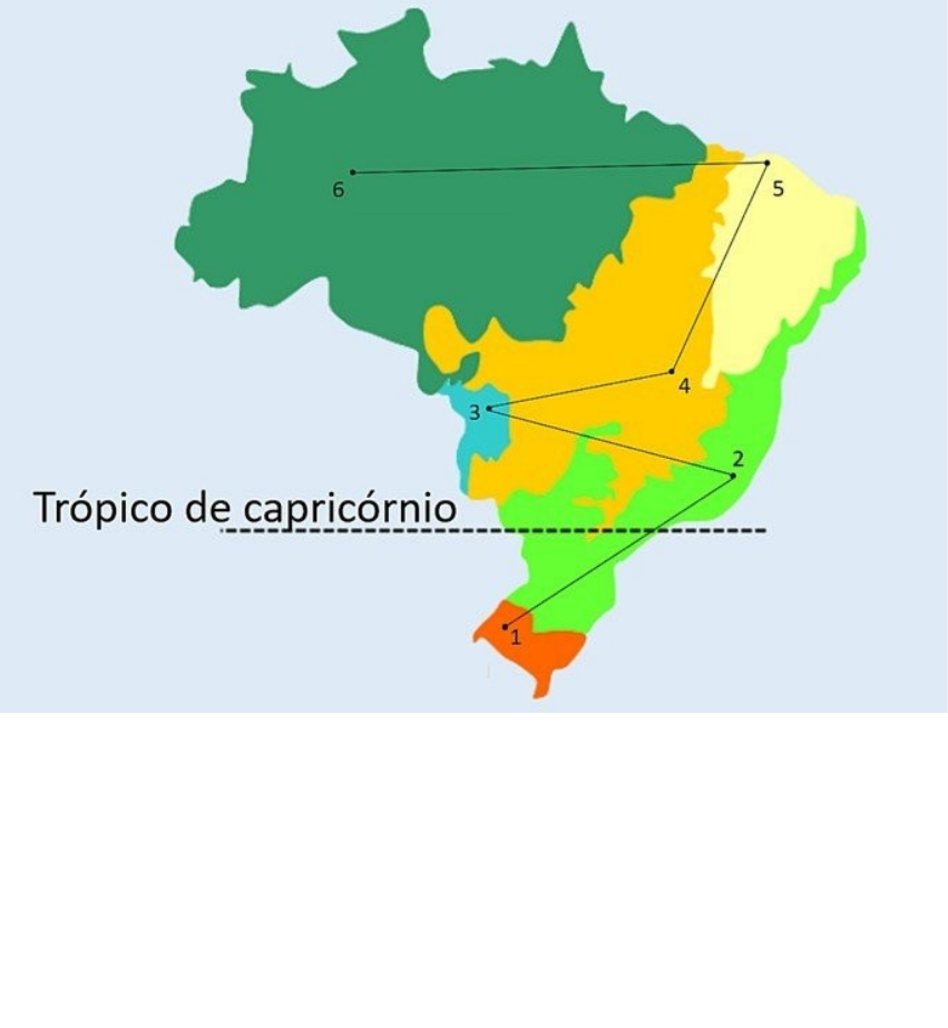 Questão 2 Uma pessoa decidiu aproveitar suas férias e visitar seis cidades para conhecer de perto os biomas brasileiros. O percurso realizado está representado no mapa a seguir. Sabendo que a pessoa partiu do Rio Grande do Sul (1) e teve como destino final o estado do Amazonas (6), a sequência dos biomas visitados foram: a) Pantanal, Caatinga, Cerrado, Mata Atlântica, Pampa e Amazônia. b) Pantanal, Pampa, Mata Atlântica, Cerrado, Caatinga e Amazônia. c) Pampa, Mata Atlântica, Pantanal, Cerrado, Caatinga e Amazônia. d) Pampa, Cerrado, Caatinga, Mata Atlântica, Pantanal e Amazônia. V, V, V, V.