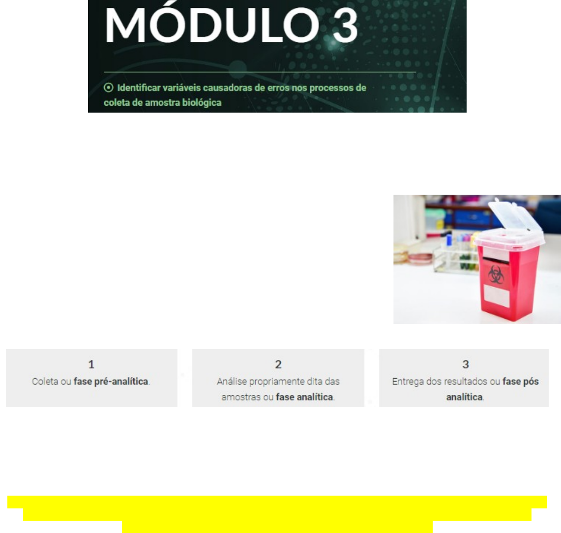 Laboratório Clínico e Controle de Qualidade AULA 2 MOD 3 - Biossegurança COLETA DE MATERIAIS BIOLÓGICOS Os exames clínicos laboratoriais iniciam com a coleta do material biológico. Para que todo o restante do processo ocorra de maneira satisfatória é necessário que a coleta seja realizada de forma correta e que a amostra chegue viável até os laboratórios, atendendo a determinados padrões específicos. Estão incluídas nesse processo de coleta ações que influenciam diretamente no resultado dos exames, como: higienização de mãos e materiais, antissepsia da região, descarte correto de materiais perfurocortantes, preenchimento correto da solicitação, identificação da amostra e seu armazenamento temporário. Ainda no contexto da coleta, é de extrema importância que o paciente esteja informado e tenha compreendido as recomendações para a aquisição da amostra biológica, quando a coleta depender dele. Algumas informações passadas pelos pacientes influenciam de forma significativa todo o processo, como uso de determinados medicamentos, hábitos e atividades físicas antes da coleta. Durante o exame existe a possibilidade de interferência de algumas variáveis. É o que veremos a seguir, mas antes conheceremos no esquema abaixo as fases que compreendem esse processo, mais na frente conheceremos detalhadamente cada fase. VARIÁVEIS INTERFERENTES DOS PROCESSOS DE ANÁLISES CLÍNICAS Variáveis pré-analíticas A fase pré-analítica é constituída da etapa de solicitação do exame pelo médico, coleta de dados do paciente, procedimentos de coleta da amostra biológica, armazenamento e transporte desta, até o momento de realização da análise. Essa é a fase com maior número de erros em todo processo, podendo chegar até 80% de todos os erros em um laboratório clínico, pois contém muitas variáveis que interferem diretamente no resultado, sendo a falta de orientação ao paciente uma das principais causas de alterações. O conhecimento dessas variáveis pode ser essencial na interpretação dos resultados obtidos. As variáveis pré-analíticas mais comuns e que mais interferem nos processos laboratoriais são: - Variação cronobiológica, que corresponde a alteração corpórea de algumas substâncias a serem analisadas, em função do horário da coleta. - Jejum, obrigatório para determinados exames, torna-se um problema quando não é respeitado o número de horas requerido. - Dieta, já que a ingestão de certos alimentos nas horas anteriores ao exame pode interferir na concentração de algumas substâncias e moléculas. - Idade, que pode não parecer tão importante para a análise, porém o padrão de alguns analitos é alterado conforme a faixa etária. - Sexo biológico, visto que diferenças hormonais e alguns outros analitos apresentam divergências importantes entre homens e mulheres. - Atividade física, principalmente de grande intensidade, alteram a concentração sérica de enzimas. - Uso de drogas e fármacos, que interferem diretamente no resultado pelo efeito fisiológico. - Posição, mudança brusca causa variação na concentração sérica de analitos. Como aprendemos, a fase analítica é aquela que compreende a etapa de realização da análise propriamente dita e, apesar de ser uma etapa com apresentação de poucos erros, alguns podem ser apontados como mais comuns: Variáveis pós analíticas A fase pós-analítica é marcada pela validação e liberação dos resultados das análises, encerrando-se com a interpretação destes pelo médico que solicitou os exames, fazendo a correlação com a situação clínica do paciente. Os resultados liberados têm um impacto importante e decisivo na conduta médica, no que diz respeito a linhas de tratamento, para que sejam assertivas e específicas. Desta forma, os laudos devem ser montados seguindo recomendações normativas, após serem analisados pelo médico assistente do laboratório, antes de chegarem ao paciente e ao médico solicitante. Apesar de ser uma fase que apresenta poucos erros, cerca de 20 a 30% dos ocorridos em todo processo, alguns equívocos podem acontecer, como: PROCEDIMENTOS BÁSICOS PARA MINIMIZAR OCORRÊNCIA DE ERROS Após estudarmos os tipos de erros que acontecem durante todo o processo desenvolvido nos laboratórios clínicos, precisamos debater como evitá-los para que os resultados representem de fato o que acontece no organismo do paciente. As atividades desenvolvidas nos laboratórios são atestadas, normatizadas e acreditadas por organismos nacionais, para que os erros sejam mitigados. Tais organismos disponibilizam planilhas, ferramentas de interface dos equipamentos e sistemas de informações. Porém, para que tudo ocorra de maneira satisfatória é de extrema importância que seja realizado o treinamento dos funcionários e que a equipe não apresente grande rotatividade, para que os níveis de qualidade do atendimento e procedimento sejam mantidos. Vejamos a seguir os passos que minimizam a ocorrência de erros: FASE PRÉ-ANALÍTICA: Os primeiros passos para minimizar a ocorrência de erros relacionados durante a fase pré-analítica incluem padronização do registro para a identificação do paciente e da amostra. Tal padronização deve destacar a busca por informações que podem influenciar de forma direta ou indireta o resultado dos exames. Desta forma, podemos garantir que todas as requisições e orientações para realização dos exames foram seguidas pelos pacientes e que as amostras se encontram viáveis e possíveis de serem analisadas. Vale lembrar que a coleta das amostras também é parte do processo que merece uma atenção maior, uma vez que é um processo rotineiro, podendo ser negligenciado pelos funcionários. Toda documentação de orientação no processo de coleta deve estar disponível em todas as áreas e setores laboratoriais. FASE ANALÍTICA: Essa fase apresenta o menor percentual de erros cometidos, no entanto também de