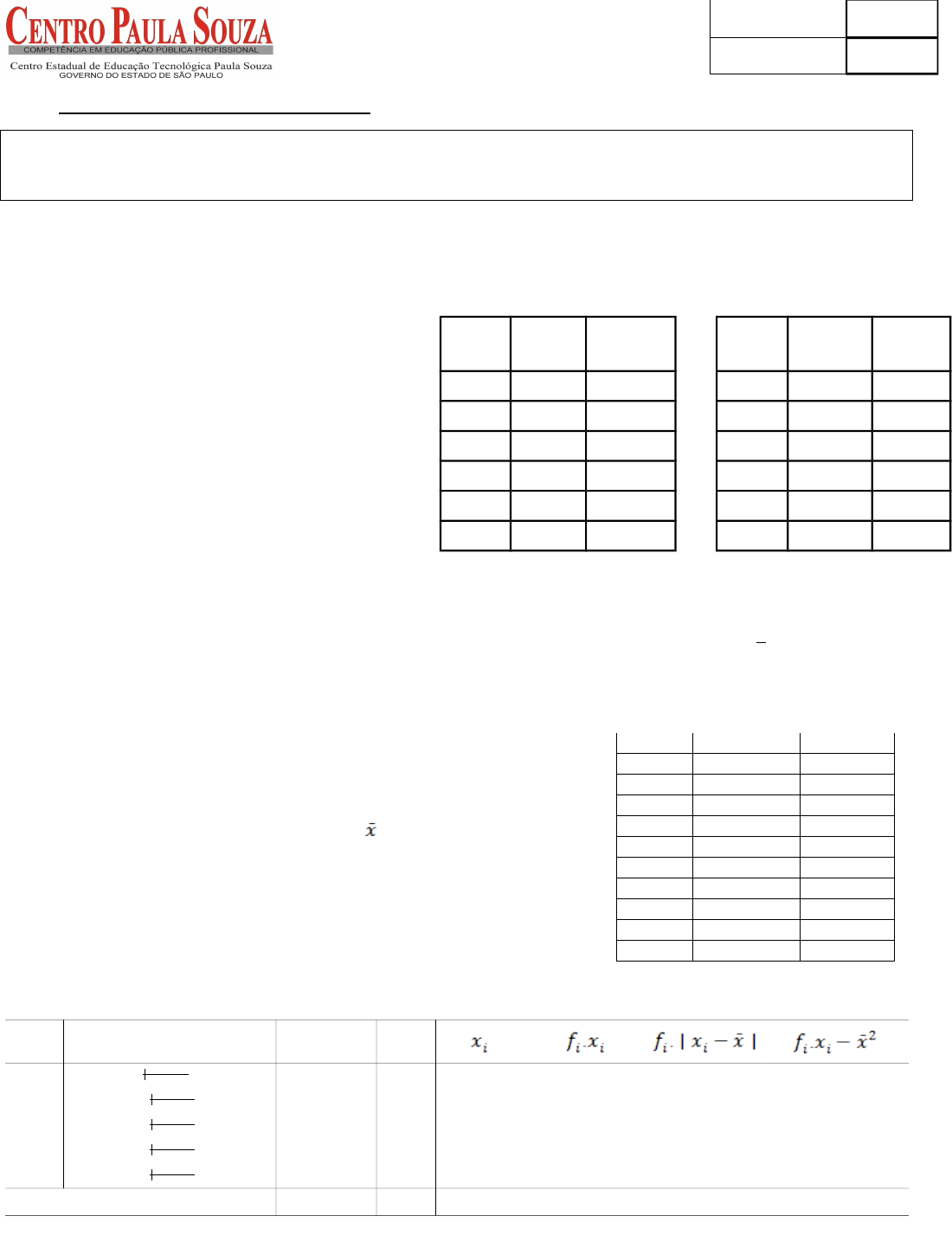 Faculdade Tecnológica de Carapicuíba Tecnologia em Logística Disciplina: Estatística Aplicada a Gestão Nome:______________________________ nº_____________ Avaliação - 02/04/13 • Use a prova para desenvolver as contas; • As alternativas visam ajudar, explicite TODAS contas; 1. Uma montadora de caminhões de grande porte contratou uma empresa para avaliar quantos caminhões deve ter como Estoque de Segurança (ES). Foi solicitado o dados de uma certa semana, sobre a venda diária (di) para determinar assim a demanda média (d). Além disto foi solicitado os tempos (ti) que as industrias fornecedoras de matéria prima demoraram para entregar os pedidos (lead time) feito nos respectivos dias para determinar o tempo médio (t) entre pedido e entrega. Estes dados foram tabulados. Determinar: a. demanda média (d) b. desvio padrão da demanda (d) c. tempo médio (t) entre pedido e entrega d. desvio padrão do tempo médio (t) Calcular o Estoque de Segurança (ES), considerando que o nível de serviço desejado é de 99,87% (z=3). No de caminhões vendidos (d i−d ) 2 Tempo para entrega (t i−t ) 2 segunda 112 segunda 9 terça 111 terça 7 quarta 110 quarta 8 quinta 110 quinta 9 sexta 112 sexta 7 TOTAL TOTAL Resposta: Estoque de Segurança = 298 (aproximadamente) 2. Medidas as estaturas de 1017 indivíduos estas estaturas foram listadas como x e obtivemos x = 162,2 cm e σX = 8,01 cm. O peso destes indivíduos foi listadas como y e o peso médio desses indivíduos é 52 kg, com um desvio padrão de 2,3 kg. Esses indivíduos apresentam maior variabilidade em estatura ou em peso? 3. Uma amostra aleatória de 10 pessoas na FATEC forma coletados os anos de estudos e a renda familiar. Tivemos uma grande variação, uma vez que inclui alunos ingressantes (entre 10 e 13), veteranos (entre 12 e 15) e professores (entre 16 e 21). Sabemos que o numero médio de anos de estudo (obtida considerando a soma total de anos de estudos) é de 15 anos e que neste caso os dados tem uma variância de 13,8. Quais alunos estão na zona de normalidade de anos de Estudo? Sabendo que a média da renda familiar é 3 salários mínimos, com desvio padrão de um salário mínimo, podemos afirmar que existe uma correlação entre os anos de estudos e a renda familiar? 4. A tabela abaixo representa os salários dos vendedores de uma empresa baseado em comissões: Classe Salário (R$) Número de funcionários Fac 1 500,00 1.000,00 38 38 750,00 28.500,00 38.323,00 38.648.745,50 2 1.000,00 1.500,00 252 290 1.250,00 315.000,00 128.142,00 65.160.207,00 3 1.500,00 2.000,00 402 692 1.750,00 703.500,00 3.417,00 29.044,50 4 2.000,00 2.500,00 271 963 2.250,00 609.750,00 133.196,50 65.466.079,75 5 2.500,00 3.000,00 37 1000 2.750,00 101.750,00 36.685,50 36.373.673,25 Total 1000 1.758.500,00 339.764,00 205.677.750,00 Renda familiar A 13 3 B 16 3 C 20 4 D 19 4 E 11 2 F 14 3 G 10 2 H 18 4 I 19 4 J 10 1 Aluno Anos sem estudar Nota do aluno Nota FINAL Faculdade Tecnológica de Carapicuíba Tecnologia em Logística Disciplina: Estatística Aplicada a Gestão a) Qual é o valor da média dos salários dos funcionários? a) R$ 1758,5 b) R$ 1900,5 c) R$ 1761,19 d) R$ 1458,24 e) R$ 1645,63 b) Qual é o valor da mediana dos salários dos funcionários? a) R$ 1758,5 b) R$ 1900,5 c) R$ 1761,19 d) R$ 1458,24 e) R$ 1645,63 c) Qual é o valor da moda dos salários dos funcionários? a) R$ 1758,5 b) R$ 1900,5 c) R$ 1761,19 d) R$ 1458,24 e) R$ 1645,63 d) Qual é o valor do desvio da média dos salários dos funcionários? a) R$ 334,15 b) R$ 215,84 c) R$ 341,66 d) R$ 458,24 e) R$ 339,76 e) Qual é o valor do variância dos salários dos funcionários? a) R$ 209.984,00 b) R$ 222.215,84 c) R$ 205.677.75 d) R$ 215.456,87 e) R$ 196.103,57 f) Qual é o valor do desvio padrão da média dos salários dos funcionários? a) R$ 434,15 b) R$ 453,52 c) R$ 341,66 d) R$ 458,24 e) R$ 416,00 g) Fazer histograma das classe das notas pela quantidade de alunos em cada classe (frequência). Formulário A fórmula para dados no rol Variância da variável X: Var(X) = ∑ i=1 n ( x i−x̄ ) 2 n Desvio padrão da variável X: σX=√Var(X) Coeficiente de variação da variável X: Coefv (X) = σX x̄ Covariância entre as variáveis X e Y: Cov(X,Y) = ∑ i=1 n ( xi− x̄ )( yi− x̄ ) n Coeficiente de correlação entre as variáveis X e Y: Corr (X,Y) = Cov(X,Y) (σX σY ) A fórmula para dados agrupados Mediana = li+ n 2 − Facanterior f i . h Moda = l i + Δanterior Δanterior + Δ posterior .h • l i limite inferior da classe i • f i frequência da classe i • h amplitude dos intervalos de cada classe n número de dados analisados • Facanterior frequência acumulada da classe anterior a classe da mediana • Δanterior variação das frequência da classe da moda e da classe anterior; • Δ posterior variação das frequência da classe da moda e da classe posterior; A fórmula do estoque de segurança O estoque de segurança (ES) é calculado pela fórmula: ES=z∗√σd2∗t+σt2∗d 2 z indica quantos desvios padrão ao redor da média tomamos; d a demanda média σd o desvio padrão da demanda; t o lead time médio σt o desvio padrão do lead time.