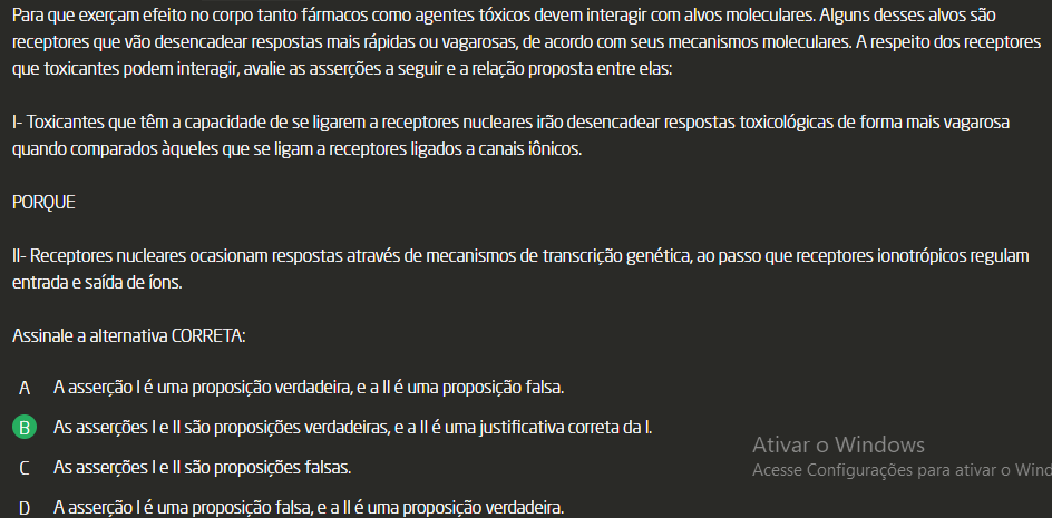 Para que exerçam efeito no corpo tanto fármacos como agentes tóxicos devem interagir com alvos moleculares. Alguns desses alvos são receptores que vão desencadear respostas mais rápidas ou vagarosas, de acordo com seus mecanismos moleculares. A respeito dos receptores que toxicantes podem interagir, avalie as asserções a seguir e a relação proposta entre elas: Assinale a alternativa CORRETA: I- Toxicantes que têm a capacidade de se ligarem a receptores nucleares irão desencadear respostas toxicológicas de forma mais vagarosa quando comparados àqueles que se ligam a receptores ligados a canais. II- Receptores nucleares ocasionam respostas através de mecanismos de transcrição genética, ao passo que receptores ionotrópicos regulam entrada e saída de. A A asserção I é uma proposição verdadeira, e a II é uma proposição falsa. B As asserções e II são proposições verdadeiras, e a II é uma justificativa correta da I. C As asserções I e II são proposições falsas. D A asserção I é uma proposição falsa, e a II é uma proposição verdadeira.