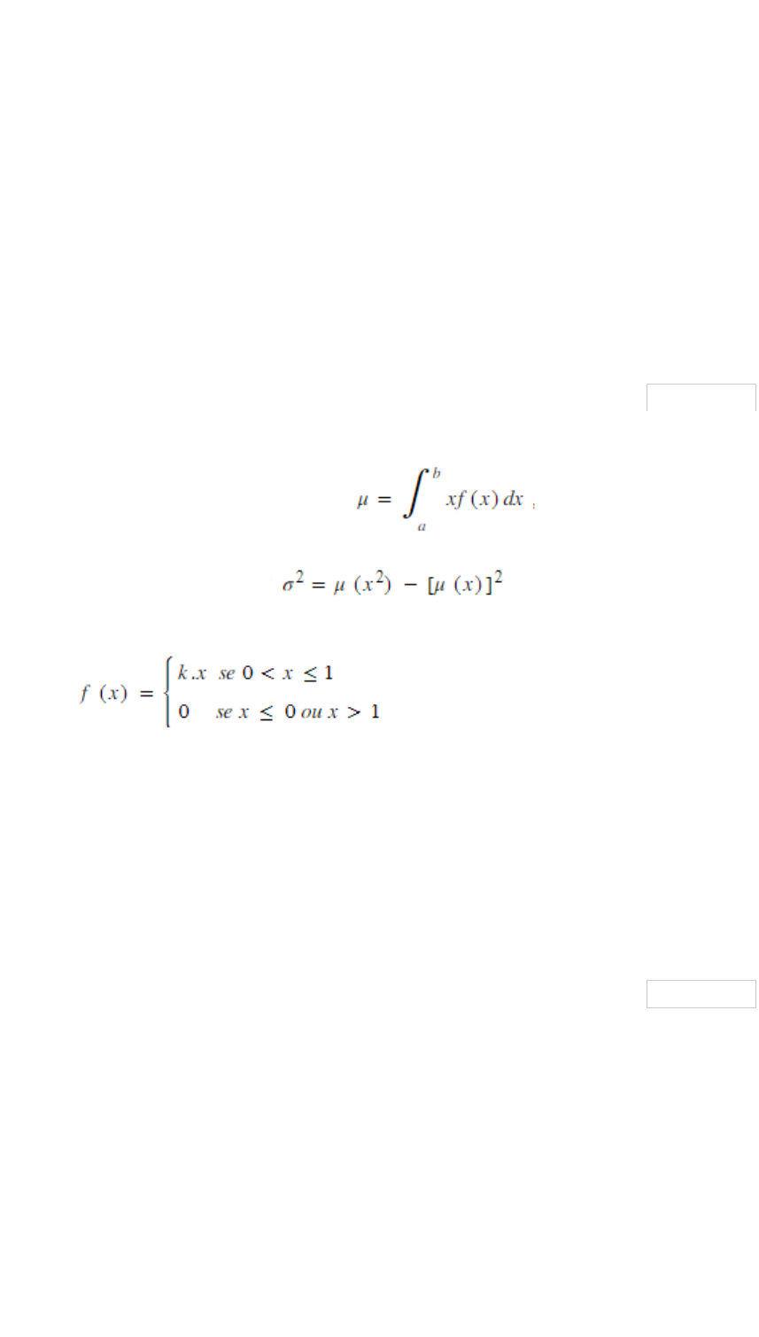 PERGUNTA 1 Uma pesquisa verificou que, a cada ida ao shopping, uma pessoa gasta uma média de 80 minutos, com desvio padrão de 20 minutos. Esse tempo é normalmente distribuído. Sabendo disso, qual a probabilidade de que uma ida ao shopping dure entre 55 a 110 minutos? Assinale a alternativa correta. a. 75,12%. b. 78,41%. c. 82,76%. d. 89,54%. e. 68,45%. 1,42 pontos PERGUNTA 2 Para uma distribuição de probabilidade contínua, a média é calculada por meio da seguinte fórmula: , enquanto que a variância é dada por . Sabendo disso, determine k, para que f(x) seja uma função densidade de probabilidade, e assinale a alternativa correta. a. k=0. b. k=1. c. k=5. d. k=3. e. k=2. 1,42 pontos PERGUNTA 3 Por definição, uma variável aleatória contínua tem distribuição uniforme quando seus valores se espalham uniformemente sobre as faixas de valores possíveis em um intervalo [a,b]. Sabendo disso, se um ponto é escolhido ao acaso, no intervalo de [0,2], assinale a alternativa correta que apresenta qual é a probabilidade de que esteja entre 1 e 1,5. a. 15%. b. 20%. c. 25%. d. 45%. e. 30%. 1,42 pontos PERGUNTA 4 Uma pesquisa identificou que as pessoas usam os smartphones por uma média de 3 anos antes de trocá-los por um novo aparelho. O desvio padrão é de 0,5 ano E, o z- escore que corresponde a 2 anos de uso é de -2. Considerando que uma pessoa foi selecionada aleatoriamente, assinale a alternativa que apresenta a probabilidade de ela utilizar o smartphone por menos de 2 anos antes de trocá-lo por um novo aparelho. (Considere que a variável x seja normalmente distribuída.) Univesp | O normal assusta? a. 3,02%. b. 3,83%. c. 3,24%. d. 2,28%. e. 1,92%. 1,42 pontos PERGUNTA 5 Uma pesquisa identificou que a vida útil de uma bateria é normalmente distribuída, com média de 3.000 horas e desvio padrão de 80 horas. O z-escore que corresponde a 2.800 horas é de -2,5. Sabendo disso, qual é a porcentagem de baterias que têm vida útil inferior a 2.800 horas? a. 0,84%. b. 1,10%. c. 1,24%. d. 0,62%. e. 1,62%. 1,42 pontos https://apps.univesp.br/o-normal-assusta/ PERGUNTA 6 Geralmente, a distribuição de probabilidade exponencial é utilizada na descrição do tempo que se leva para completar uma determinada tarefa. Sabendo disso, leia as asserções que seguem e a relação proposta entre elas: I. Se o intervalo de tempo para atendimento em uma fila de banco é uma variável aleatória, com distribuição exponencial de parâmetro λ=0,15 , então, a probabilidade de haver um atendimento em um intervalo inferior a 10 minutos é de 50% PORQUE II. Desenvolvendo o cálculo para a probabilidade procurada, encontraremos o resultado de 0,5, ou seja, A respeito dessas asserções, assinale a alternativa correta. a. A asserção I é uma proposição verdadeira, e a II é uma proposição falsa. b. As asserções I e II são proposições verdadeiras, mas a II não é uma justificativa da I. c. A asserção I é uma proposição falsa, e a II é uma proposição verdadeira. d. As asserções I e II são proposições verdadeiras, e a II é uma justificativa da I. - ERRADO e. As asserções I e II são falsas. 1,45 pontos PERGUNTA 7 A distribuição de probabilidade exponencial normalmente é utilizada na descrição do tempo que se leva para completar uma determinada tarefa. Nesse caso, a função densidade de probabilidade que descreve a variável exponencial é dada por Sabendo disso, leia as asserções que seguem e a relação proposta entre elas: I. Se, em minutos, o intervalo de tempo entre emissões de uma fonte radioativa é uma variável aleatória com distribuição exponencial de parâmetro =0,1, então a probabilidade de haver uma emissão em um intervalo inferior a 5 minutos é de 39% PORQUE II. Desenvolvendo o cálculo da probabilidade para P(x<5), com x variando a 0 até 5, encontraremos o resultado de 0,39, ou seja, A respeito dessas asserções, assinale a alternativa correta. a. A asserção I é uma proposição falsa, e a II é uma proposição verdadeira. b. As asserções I e II são falsas. c. As asserções I e II são proposições verdadeiras, mas a II não é uma justificativa da I. d. A asserção I é uma proposição verdadeira, e a II é uma proposição falsa. e. As asserções I e II são proposições verdadeiras, e a II é uma justificativa da I.