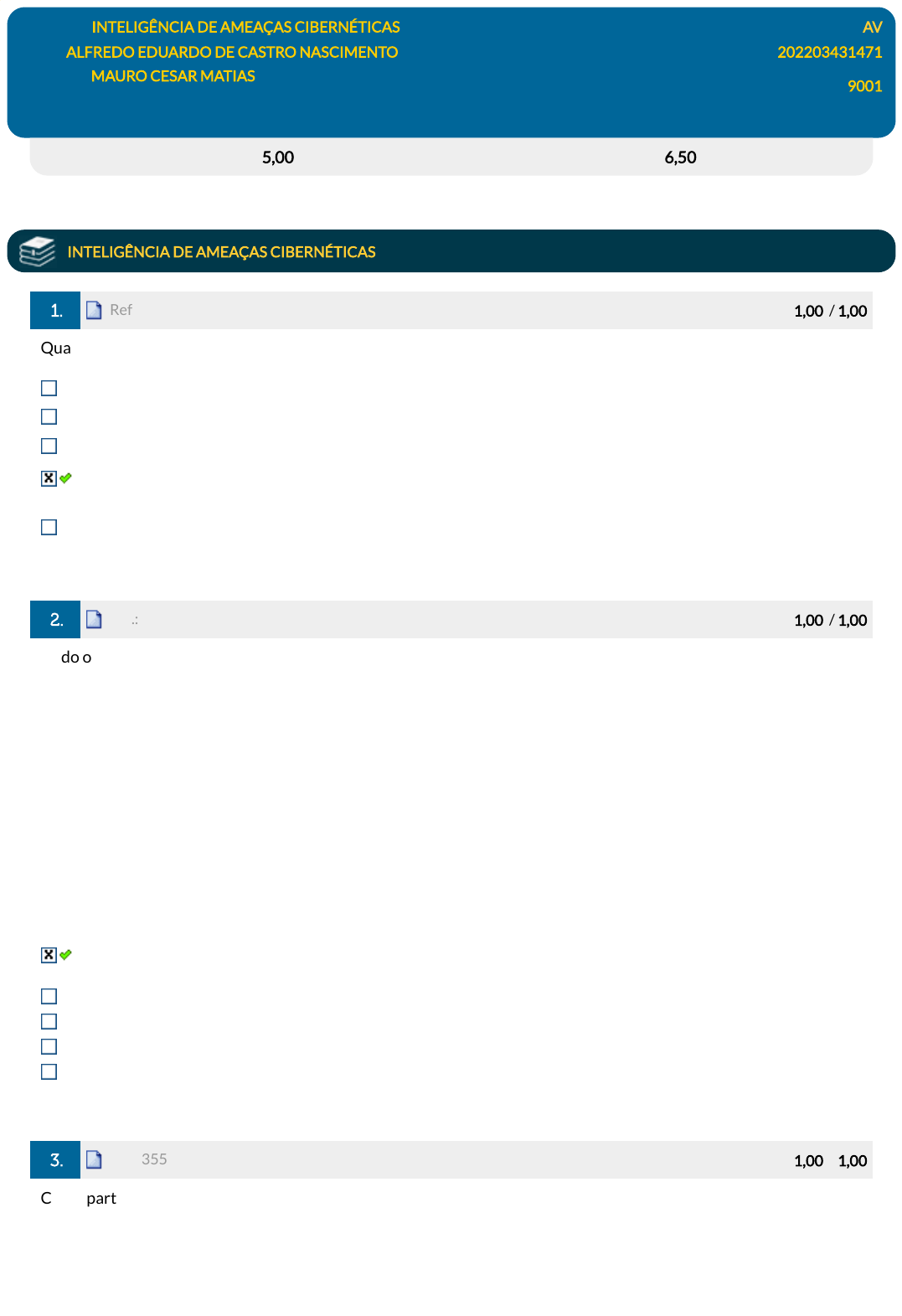 12/06/2023, 10:17 EPS https://simulado.estacio.br/alunos/template.asp?pagina=bdq_alunos_agendamento.asp&f_cod_disc=# 1/3 Disciplina: INTELIGÊNCIA DE AMEAÇAS CIBERNÉTICAS AV Aluno: ALFREDO EDUARDO DE CASTRO NASCIMENTO 202203431471 Professor: MAURO CESAR MATIAS Turma: 9001 DGT1463_AV_202203431471 (AG) 20/04/2023 14:51:06 (F) Avaliação: 5,00 pts Nota SIA: 6,50 pts INTELIGÊNCIA DE AMEAÇAS CIBERNÉTICAS 1. Ref.: 3551911 Pontos: 1,00 / 1,00 Quais são as cinco fases do ciclo de vida do CTI? Planejamento e Requerimentos, Coleta de Logs, Análise, Resposta a Incidentes Coleta de Informações, Análise, Produção e Disseminação, Revisão Busca, Planejamento e Requerimentos, Gravação, Análise, e Disseminação Planejamento e Requerimentos, Coleta e Processamento de Informações, Análise, Produção e Disseminação Busca de Dados, Coleta e Processamento de Informações, Análise, Produção 2. Ref.: 3557226 Pontos: 1,00 / 1,00 Dado o trafego abaixo: GET /ckeditor/MathJax.js?con�g=TeX-AMS_HTML HTTP/1.1 Host: www.MyWebSite.com.br Connection: keep-alive User-Agent: Mozilla/5.0 (Macintosh; Intel Mac OS X 10_15_3) AppleWebKit/537.36 (KHTML, like Gecko) Chrome/80.0.3987.149 Safari/537.36 Accept: */* Referer: http://www.MyWebSite.com.br/ Accept-Encoding: gzip, de�ate Accept-Language: en-US,en;q=0.9 E veri�cando que o User-Agent corresponde a um sistema MacOSX, podemos concluir que: O User-Agent não é um bom IOC pois se trata de um User-Agent comum, utilizados por sistemas Apple, e poderia gerar muitos alertas falsos, caso criassemos um alerta baseado apenas no User-Agent. Nenhuma alternativa está correta Todos os campos deste trafego http podem ser utilizados como IOCs Podemos usar este User-Agent como um bom IOC, pois a maioria dos sistemas sao baseados em Windows. O User-Agent nao pode ser usado como IOC porque nao contem o nome do host. 3. Ref.: 3558165 Pontos: 1,00 / 1,00 Como parte do relatório gerado por um sistema sandbox, temos o seguinte trecho: 1. Installation/Persistance a. Modifies auto-execute functionality by setting/creating a value in the registry O que signi�ca isto? javascript:alert('C%C3%B3digo da quest%C3%A3o: 3551911.'); javascript:alert('C%C3%B3digo da quest%C3%A3o: 3557226.'); javascript:alert('C%C3%B3digo da quest%C3%A3o: 3558165.'); 12/06/2023, 10:17 EPS https://simulado.estacio.br/alunos/template.asp?pagina=bdq_alunos_agendamento.asp&f_cod_disc=# 2/3 Indica que o malware fez download de arquivos para o sistema. Nenhuma das alternativas está correta Indica que o malware removeu arquivos dentro do sistema Indica que o malware realizou modi�cações no sistema que permita que ele seja executado automaticamente, como modo de persistencia. Indica que o malware está se conectando a um servidor remoto 4. Ref.: 3555540 Pontos: 1,00 / 1,00 Com relação as assertivas abaixo, julgue-as como V (verdadeiro) ou F (falso) e assinale a resposta correta: 1. A sigla OSINT (do inglês Open Source Intelligence) representa informações que podem ser adquiridas livremente na internet. 2. Nslookup e Whois são exemplo de ferramentas que podem ser usados para OSINT, já que fornecem informações que podem ser usadas para realizar um mapeamento de uma rede a partir de um dado como um domínio ou um endereço IP. 3. Pastebin é um exemplo de site no qual informações podem ser postadas anonimamente sobre diferentes tópicos, com um tempo de vida variável. F-F-F V-V-V F-V-V V-V-F V-F-V 5. Ref.: 3567735 Pontos: 1,00 / 1,00 É um recurso de dados incorporado ao Maltego, através dele, você pode conectar dados de uma variedade de fontes públicas (OSINT), mais de 30 parceiros e também seus próprios dados. Device Transform Hub Domain Person Company 6. Ref.: 3555565 Pontos: 0,00 / 1,00 Devemos evitar bloquear listas de IPs maliciosos sem ter um contexto maior sobre eles? Não, IPs recebidos como maliciosos devem ser bloqueados de qualquer forma. Sim, um IP não pode ser considerado malicioso. Não, IPs são mais con�áveis do que domínios. Não, quanto mais IPs bloqueados, mais segura estará a minha rede. Sim, um IP pode estar associado a múltiplos websites que podem não ser maliciosos. 7. Ref.: 3564761 Pontos: 0,00 / 1,00 javascript:alert('C%C3%B3digo da quest%C3%A3o: 3555540.'); javascript:alert('C%C3%B3digo da quest%C3%A3o: 3567735.'); javascript:alert('C%C3%B3digo da quest%C3%A3o: 3555565.'); javascript:alert('C%C3%B3digo da quest%C3%A3o: 3564761.'); 12/06/2023, 10:17 EPS https://simulado.estacio.br/alunos/template.asp?pagina=bdq_alunos_agendamento.asp&f_cod_disc=# 3/3 Um analista de inteligência de uma organização está tentando conseguir apoio para adquirir uma plataforma TIP para dentro da empresa (seja ela gratuita ou paga). Que principais vantagens podem ser descritas, podendo ajudá-lo no processo de convencimento? Assinale a alternativa INCORRETA. Uma plataforma de TIP evita que o(s) analista(s) �que sobrecarregados buscando informações sobre novos ataques e IOCs relacionados. Uma plataforma TIP automaticamente coleta feeds de IOCs, e armazena em uma maneira que facilita a busca e a análise. Uma plataforma de TIP permite que o(s) analista(s) �que(m) sobrecarregado(s) buscando informações sobre novos ataques e IOCs relacionados. Uma plataforma TIP permite que o analista possa correlacionar IOCs encontrados em sua organização com outros IOCs que foram compartilhados por outras empresas ou artigos. Uma plataforma TIP pode integrar com o sistema de correlacionamento de logs e automaticamente enviar os últimos IOCs para o sistema. 8. Ref.: 3555591 Pontos: 0,00 / 1,00 O que é o Cyber Kill Chain? Uma expressão para de�nir os pontos fracos de uma organização Monitoração de ataques hackers. São os estágios de um cyber attack em uma organização. Nenhuma das alternativas Uma forma de responder a incidentes de segurança. 9. Ref.: 3555615 Pontos: 0,00 / 1,00 Após conseguir acesso ao ambiente, o grupo hacker utilizou uma técnica que perm
