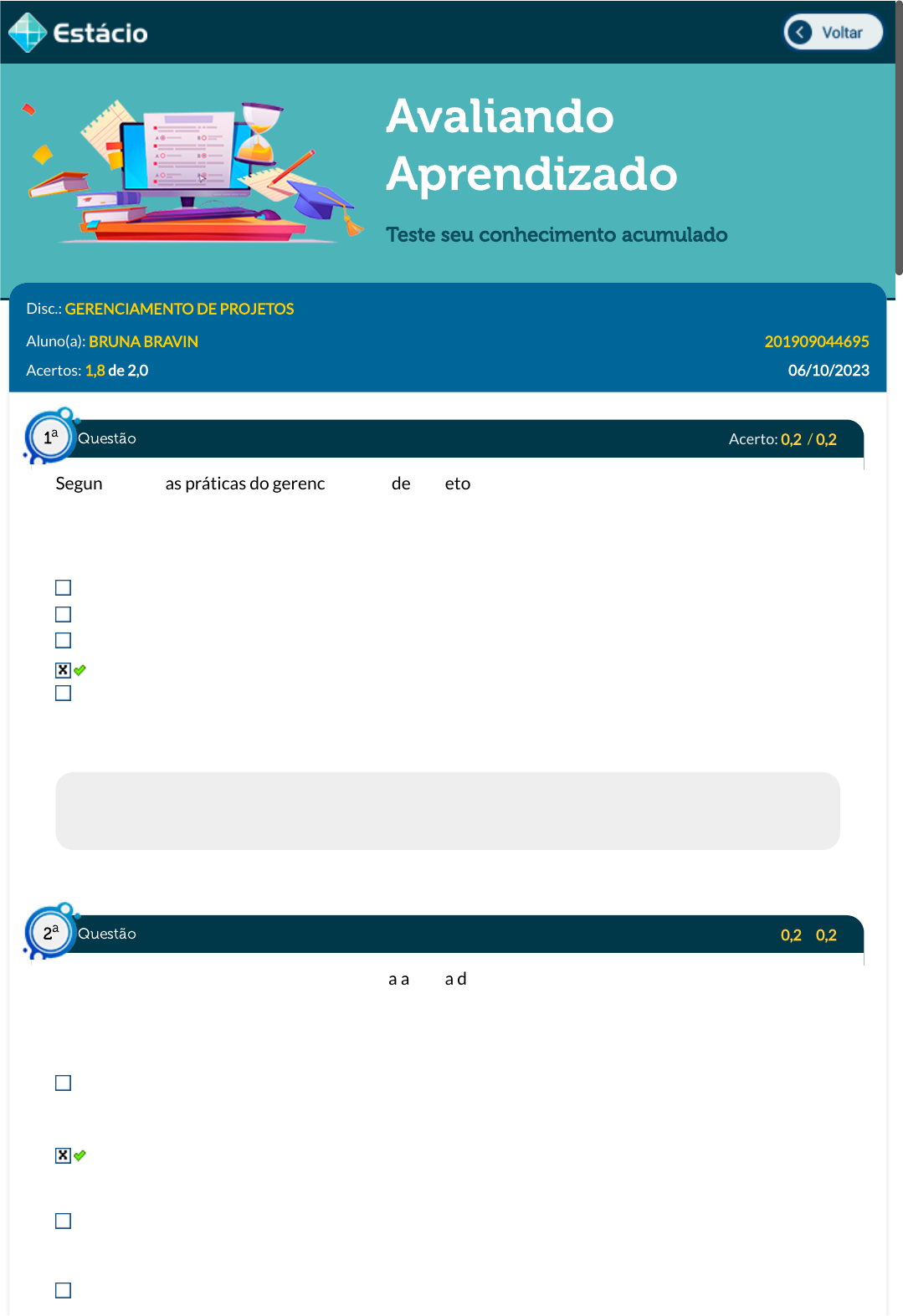 17/10/2023, 16:26 Estácio: Alunos https://simulado.estacio.br/alunos/ 1/1 Avaliando Aprendizado Teste seu conhecimento acumulado Disc.: GERENCIAMENTO DE PROJETOS Aluno(a): BRUNA BRAVIN 201909044695 Acertos: 1,8 de 2,0 06/10/2023 Acerto: 0,2 / 0,2 Segundo as boas práticas do gerenciamento de projetos, delineadas pelo Guia PMBOK, os grupos de processos são um agrupamento lógico de entrada, ferramentas, técnicas e saídas. Dessa forma, o grupo de processos de Monitoramento e Controle além de possuir processos para monitorar o trabalho que está sendo executado ele também atua fazendo: A orientação e o gerenciamento do trabalho; O plano de gerenciamento do projeto; O registro das lições aprendidas; O controle integrado de mudanças; O conhecimento das partes interessadas; Respondido em 06/10/2023 11:34:24 Explicação: A resposta correta é: O controle integrado de mudanças; Acerto: 0,2 / 0,2 Escopo em projetos, essencialmente signi�ca a soma de todos os produtos que serão gerados pelo projeto. E pode ser desmembrado em escopo do projeto e escopo do produto. Com base na a�rmação acima, diferencie escopo de projeto e escopo de produto escolhendo a alternativa que representa esta diferenciação. Escopo do produto resume todas as atividades necessárias para a elaboração do produto/serviço. Escopo do projeto é exclusivamente o produto que necessitará ser criado como resultado do projeto. Escopo do produto são as características e funções que caracterizam um produto, serviço ou resultado. Escopo do projeto é o trabalho que deve ser realizado para entregar um produto, serviço ou resultado com as características e funções especi�cadas. Escopo do produto é o trabalho que deve ser realizado para entregar um produto, serviço ou resultado com as características e funções especi�cadas. Escopo do projeto são as características e funções que caracterizam um produto, serviço ou resultado. Escopo do produto é a decomposição em entregáveis e pacotes de trabalho facilitando todo o gerenciamento Escopo do projeto é a lista de entregáveis identi�cadas para construção do Questão1 a Questão2 a https://simulado.estacio.br/alunos/inicio.asp https://simulado.estacio.br/alunos/inicio.asp javascript:voltar(); javascript:voltar();