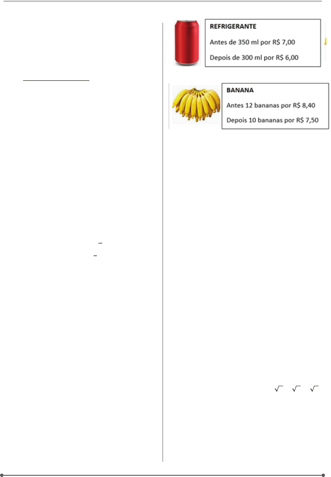 Página 8 EXAME CLASSIFICATÓRIO 2022.1 FORMA DE ENSINO: INTEGRADO 31. Todo número positivo pode ser escrito em notação científi ca: 𝑘 × 10𝑛 , em que 1 ≤ 𝑘 < 10 e n é um número inteiro. Esta notação auxilia quando temos números “muito grandes” ou “muito pequenos”. Com base nessas informações, a notação científi ca do número 𝐴 = 0,000168 × 0,001 0,024 × 3,5 é: a) 2 × 10−6 b) 2 × 10−5 c) 1,6 × 10−4 d) 1,6 × 10−3 e) 1,6 × 10−2 32. A presidente do sindicato de um bairro de Teresina (PI) está organizando uma excursão para Parnaíba (PI) e fretou um ônibus com 54 lugares. Do total de lugares reservou das vagas para os sindicalizados do bairro, para os não sindicalizados do bairro e o restante dos lugares do ônibus para os que moram em outros bairros. Quantos lugares do ônibus estão reservados para moradores de outros bairros? a) 36 b) 24 c) 12 d) 10 e) 6 33. Em uma propaganda, foi anunciado mudanças de preços em dois produtos conforme as fi guras: 2 3 Analise os produtos e os preços antes e depois das mudanças e marque a alternativa correta em relação ao preço real de cada mercadoria. a) O preço do refrigerante baixou e o preço da banana aumentou. b) O preço do refrigerante baixou e o preço da banana baixou. c) O preço do refrigerante e da banana permaneceram o mesmo. d) O preço do refrigerante permaneceu o mesmo e o preço da banana aumentou. e) O preço do refrigerante aumentou e o preço da banana baixou. 34. Sabe-se que uma determinada vela de 43,5 cm de altura, quando acesa, diminui 1,5 mm por minuto. Quanto tempo essa vela levará para ser consumida totalmente? a) 4 horas e 10 min. b) 4 horas e 50 min. c) 3 horas e 50 min. d) 3 horas e 30 min. e) 3 horas e 10 min. 35. Dados os números reais, marque a alternativa correta: MATEMÁTICA 2 9 2� , 33 , 44 Página 9 EXAME CLASSIFICATÓRIO 2022.1 FORMA DE ENSINO: INTEGRADO a) 2� < 33 < 44 b) 2� = 44 > 33 c) 2� = 44 < 33 d) 2� = 33 < 44 e) 2� > 33 > 44 36. Um número natural é cubo perfeito se ele for igual ao cubo de outro número natural. Por exemplo 8 é um cubo perfeito, pois 23 = 8 . Com base nessa informação, determine o menor número natural 𝑥 ≠ 0 tal que 𝑁 = 3600 � 𝑥 seja um cubo perfeito. a) 27 b) 58 c) 60 d) 64 e) 125 37. Seja 𝑃 = 245 + 435 e as proposições relacionadas a P: I) P é ímpar. II) P é múltiplo de 16. III) O dobro de P é 246 + 271 A respeito das proposições, é correto afi rmar: a) Somente I é verdadeiro. b) Somente II é verdadeiro. c) Somente III é verdadeiro. d) I e II são verdadeiros. e) II e III são verdadeiros. 38. A maquete de um determinado prédio é uma redução, em escala, em três dimensões. Se esse prédio tem 528 metros de altura e está representado na maquete com escala de 1:600, qual a altura real de uma porta na maquete que tem 4,2 mm de altura? a) 2,52 metros b) 2,40 metros c) 2,35 metros d) 2,22 metros e) 2,10 metros 39. Pedro, Antônio e Carlos jogaram na Mega Sena, e cada um deu uma quantia para pagar a aposta. Pedro entrou com R$ 50,00, Antonio com R$ 60,00 e Carlos com R$ 100,00 . Caso ganhem o prêmio de R$ 6720000,00 , os três se comprometeram a dividirem o prémio em partes proporcionais às quantias jogadas. Se ganharem sozinhos o prêmio, quanto Carlos receberá a mais que Antônio? a) R$ 1120000,00 b) R$ 1180000,00 c) R$ 1210000,00 d) R$ 1280000,00 e) R$ 1300000,00 40. Cobriu-se o piso de uma cozinha com 800 peças de cerâmica de 50cm de comprimento por 20cm de largura. Quantas peças de 40 cm de comprimento por 40cm de largura serão necessárias para cobrir uma cozinha cuja área é o dobro da anterior? a) 1050 peças b) 1000 peças c) 980 peças d) 920 peças e) 900 peças 41. Um capital de R$ 22300,00 é aplicado a juros simples durante 105 dias. Qual o valor dos juros simples para uma taxa de 2% ao mês? (Observação: considerar o calendário comercial de 30 dias). a) R$ 1561,00 b) R$ 1590,00 c) R$ 1642,00 d) R$ 1655,00 e) R$ 1690,00 Página 10 EXAME CLASSIFICATÓRIO 2022.1 FORMA DE ENSINO: INTEGRADO 42. Sendo p o preço de venda por unidade de um produto e c o custo do produto por unidade, chamamos de margem de contribuição a diferença p-c. De modo geral, a margem de contribuição representa quanto o lucro da venda de cada produto contribuirá para a empresa (comércio) cobrir seus custos. Com essa informação, o dono de um comércio comprou uma caixa de canetas com 100 unidades pagando R$ 150,00. Se ele vender 30 unidades com uma margem de contribuição igual a 40% do custo unitário e 70 unidades com uma margem de 30% sobre o custo unitário, qual a receita de venda das 100 unidades? a) R$ 200,00 b) R$ 199,50 c) R$ 180,00 d) R$ 185,90 e) R$ 179,30 43. Para fazer um trabalho da escola, João pegou uma folha retangular de 40cm por 30cm e recortou (tirou), de seus quatro cantos, regiões quadradas de lados que medem x cm. Qual é o valor de x, sabendo que a área que sobrou da folha passou a ser de 944 cm² ? a) 6 cm b) 7 cm c) 8 cm d) 9 cm e) 10 cm 44. A soma dos números inteiros n que satisfazem 2n + 3 < n + 7 ≤ 4n + 2 é: a) 10 b) 9 c) 6 d) 5 e) 4 45. A equação −3𝑥2 + 10𝑥 − 3 = 0, para x pertencente ao conjunto dos números reais, apresenta: a) uma raiz, que é número par. b) uma raiz maior que 7. c) duas raízes, que são quadrados perfeitos. d) duas raízes cujo produto é -3. e) duas raízes cuja soma é 10/3. 46. Um aluno resolveu desafi ar seus colegas de grupo de estudo com o seguinte problema: determinar a soma dos termos de uma fração que quando acrescentado uma unidade no seu numerador, a fração torna-se equivalente a 2 e, quando acrescentado duas unidades no seu denominador, a fração torna-se equivalente a 1. Se for respondido corretamente o problema proposto, o grupo encontrou a soma dos termos da fração considerada igual a: a) 5 b) 6 c) 7 d) 8 e) 9 47. Se x e y são números reais tais que x3 - y3 = 19(x - y) e x · y = 6, 