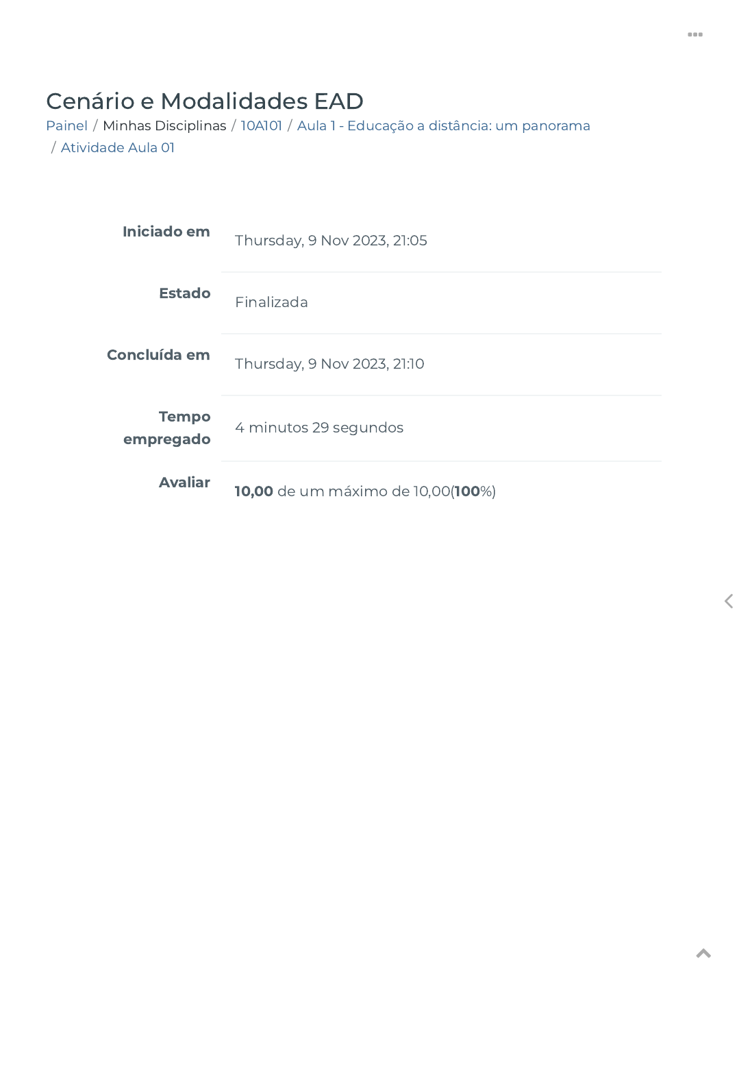 09/11/2023, 21:10 Atividade Aula 01 https://ava.politecnicabr.com.br/mod/quiz/review.php?attempt=5884706 1/5 Painel / Minhas Disciplinas / 10A101 / Aula 1 - Educação a distância: um panorama / Atividade Aula 01 Cenário e Modalidades EAD Iniciado em Thursday, 9 Nov 2023, 21:05 Estado Finalizada Concluída em Thursday, 9 Nov 2023, 21:10 Tempo empregado 4 minutos 29 segundos Avaliar 10,00 de um máximo de 10,00(100%) https://ava.politecnicabr.com.br/my/ https://ava.politecnicabr.com.br/my/ https://ava.politecnicabr.com.br/course/view.php?id=828 https://ava.politecnicabr.com.br/course/view.php?id=828#section-2 https://ava.politecnicabr.com.br/mod/quiz/view.php?id=21023 https://ava.politecnicabr.com.br/ 09/11/2023, 21:10 Atividade Aula 01 https://ava.politecnicabr.com.br/mod/quiz/review.php?attempt=5884706 2/5 Questão 1 Completo Atingiu 2,00 de 2,00 Não faz dos sinônimos de educação a distância, a opção: Escolha uma opção: Questão 2 Completo Atingiu 2,00 de 2,00 Podemos a�rmar que a EAD se apresenta há muito tempo como um caminho para a inovação e renovação educacional de que tanto precisamos em nosso país, seja no ensino regular e formal, seja na educação corporativa, seja na formação pro�ssional continuada. Escolha uma opção: a. Educação aberta b. Educação light c. Estudo online d. Ensino virtual e. Educação �exível Verdadeiro Falso https://ava.politecnicabr.com.br/ 09/11/2023, 21:10 Atividade Aula 01 https://ava.politecnicabr.com.br/mod/quiz/review.php?attempt=5884706 3/5 Questão 3 Completo Atingiu 2,00 de 2,00 Podemos a�rmar que após a Primeira Guerra Mundial, a educação a distância teve um novo impulso, devido às necessidades sociais e econômicas do pós-guerra e ao desenvolvimento e difusão de tecnologias como o rádio e o cinema. Escolha uma opção: Questão 4 Completo Atingiu 2,00 de 2,00 Relacione: Educação Instrução Ensino Verdadeiro Falso referente à formação integral do ser humano – não se restring está ligada ao treinamento, à capacitação operacional, ao ens encontra-se diretamente ligada à atuação do professor e aos https://ava.politecnicabr.com.br/ 09/11/2023, 21:10 Atividade Aula 01 https://ava.politecnicabr.com.br/mod/quiz/review.php?attempt=5884706 4/5 Questão 5 Completo Atingiu 2,00 de 2,00 Podemos a�rmar que a EAD é estabelecida quando o professor não está no mesmo espaço geográ�co (físico) que seus alunos. Essa distância é reduzida por meio dos recursos didáticos, ou melhor, das tecnologias e dos meios de comunicação utilizados como suporte para a aprendizagem. Escolha uma opção: Verdadeiro Falso Entre em Contato https://www.politecnicabr.com.br 0800 084 2627 0800 084 2627 Links Úteis Dicas da nossa Diretora Acadêmica Planner de Estudos Declaração de Matrícula Orientações do AVA Abertura de Ticket Fale com o Tutor Cronograma de Estudos Manual de Estágio Manual de Competência Siga-nos nas redes sociais https://www.politecnicabr.com.br/ https://soundcloud.com/user-501638417/sets/escola-politecnica-brasileira https://soundcloud.com/user-501638417/sets/escola-politecnica-brasileira https://storage.googleapis.com/sirius-pubstore/semestre_plannerdeestudo%20poli.pdf https://storage.googleapis.com/sirius-pubstore/semestre_plannerdeestudo%20poli.pdf https://storage.googleapis.com/sirius-pubstore/declaracao_matricula.pdf https://storage.googleapis.com/sirius-pubstore/declaracao_matricula.pdf https://storage.googleapis.com/sirius-pubstore/orientacoes_ava.pdf https://storage.googleapis.com/sirius-pubstore/orientacoes_ava.pdf https://storage.googleapis.com/sirius-pubstore/abertura_ticket.pdf https://storage.googleapis.com/sirius-pubstore/abertura_ticket.pdf https://storage.googleapis.com/sirius-pubstore/fale_com_tutor.pdf https://storage.googleapis.com/sirius-pubstore/fale_com_tutor.pdf https://storage.googleapis.com/sirius-pubstore/cronograma_estudos.pdf https://storage.googleapis.com/sirius-pubstore/cronograma_estudos.pdf https://storage.googleapis.com/sirius-pubstore/manual_estagio.pdf https://storage.googleapis.com/sirius-pubstore/manual_estagio.pdf https://storage.googleapis.com/sirius-pubstore/manual_competencia.pdf https://storage.googleapis.com/sirius-pubstore/manual_competencia.pdf https://ava.politecnicabr.com.br/ 09/11/2023, 21:10 Atividade Aula 01 https://ava.politecnicabr.com.br/mod/quiz/review.php?attempt=5884706 5/5 © 2022 - Escola Politécnica Brasileira https://ava.politecnicabr.com.br/mod/quiz/0 https://ava.politecnicabr.com.br/mod/quiz/0 https://www.facebook.com/politecnicabr https://www.instagram.com/politecnicabr_oficial https://ava.politecnicabr.com.br/