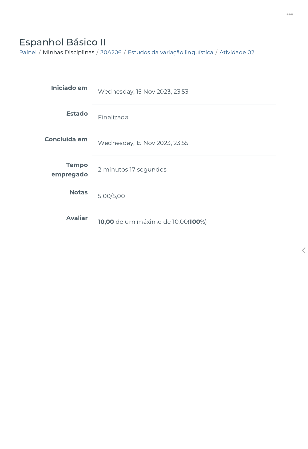 15/11/2023, 23:55 Atividade 02 https://ava.politecnicabr.com.br/mod/quiz/review.php?attempt=5910870 1/7 Painel / Minhas Disciplinas / 30A206 / Estudos da variação linguística / Atividade 02 Espanhol Básico II Iniciado em Wednesday, 15 Nov 2023, 23:53 Estado Finalizada Concluída em Wednesday, 15 Nov 2023, 23:55 Tempo empregado 2 minutos 17 segundos Notas 5,00/5,00 Avaliar 10,00 de um máximo de 10,00(100%) https://ava.politecnicabr.com.br/my/ https://ava.politecnicabr.com.br/my/ https://ava.politecnicabr.com.br/course/view.php?id=1007 https://ava.politecnicabr.com.br/course/view.php?id=1007#section-3 https://ava.politecnicabr.com.br/mod/quiz/view.php?id=35632 https://ava.politecnicabr.com.br/ 15/11/2023, 23:55 Atividade 02 https://ava.politecnicabr.com.br/mod/quiz/review.php?attempt=5910870 2/7 Questão 1 Correto Atingiu 1,00 de 1,00 Na língua espanhola, há muitas variedades linguísticas associadas à pronúncia. Analise as questões a seguir e assinale a alternativa cuja a�rmação esteja correta. Escolha uma opção: a. Nos dialetos da América Latina, apenas o andino tem distinção da pronúncia de ll e y b. A letra s tem a mesma pronúncia em todos os países hispano- americanos. c. Na Espanha, as letras z e c, seguidas de e ou i, têm o mesmo fonema. d. Os fonemas vocálicos do espanhol, de forma geral, são nasais e. Em todos os países hispano--americanos, o dígrafo ll é pronunciado com o fonema palatal surdo e, na Espanha, com fonema lateral sonoro. https://ava.politecnicabr.com.br/ 15/11/2023, 23:55 Atividade 02 https://ava.politecnicabr.com.br/mod/quiz/review.php?attempt=5910870 3/7 Questão 2 Correto Atingiu 1,00 de 1,00 O léxico é um dos aspectos da língua mais sensíveis à variação linguística. Retome a tradução de Papai Noel e pipoca na Colômbia, no México, no Chile, na Argentina e na Espanha e assinale a alternativa que apresente a correspondência correta. Escolha uma opção: a. Chile: Papá Noel, cabrita. b. México: Santa Claus; cotufa. c. Espanha: Papá Noel; palomitas blancas. d. Argentina: Viejito Pascuero; crispeta. e. Colômbia: Papá Noel; crispeta. https://ava.politecnicabr.com.br/ 15/11/2023, 23:55 Atividade 02 https://ava.politecnicabr.com.br/mod/quiz/review.php?attempt=5910870 4/7 Questão 3 Correto Atingiu 1,00 de 1,00 A variação linguística é um fenômeno que ocorre com todas as línguas vivas. Re�ita sobre os aspectos relacionados à variação linguística e assinale a alternativa que apresenta uma a�rmação correta. Escolha uma opção: a. As variações surgem a partir da escrita. b. A variação linguística é uma diversi�cação lexical, morfológica, sintática ou fonética. c. Pessoas de uma mesma família usam os mesmos vocábulos, pronúncias, organizações sintáticas e morfológicas. d. A variação linguística ocorre por imposições de grupos contrários às normas gramaticais. e. Todos os habitantes de uma mesma região apresentam as mesmas variações. https://ava.politecnicabr.com.br/ 15/11/2023, 23:55 Atividade 02 https://ava.politecnicabr.com.br/mod/quiz/review.php?attempt=5910870 5/7 Questão 4 Correto Atingiu 1,00 de 1,00 Tanto na Espanha quanto na América, há diferentes zonas dialetais. Re�ita sobre os aspectos de cada zona e assinale a alternativa que contém uma a�rmação correta sobre o assunto. Escolha uma opção: a. Não existe nasalização de vogais em nenhuma variedade espanhola. b. Na região andaluza, é comum o uso de vosotros mesmo em situações informais. c. O voseo ocorre apenas na Argentina. d. Na região Centro-Norte da Espanha, há uma tendência de omitir o fonema da letra d em situações variadas. e. Em algumas regiões da América, é costume pronunciar a letra s de forma aspirada. https://ava.politecnicabr.com.br/ 15/11/2023, 23:55 Atividade 02 https://ava.politecnicabr.com.br/mod/quiz/review.php?attempt=5910870 6/7 Questão 5 Correto Atingiu 1,00 de 1,00 A língua espanhola apresenta diversas variações. A partir dessa constatação, assinale a alternativa correta. Escolha uma opção: a. O espanhol americano eliminou qualquer in�uência indígena. b. A Espanha apresenta homogeneidade na língua. c. Na língua espanhola, a variação padrão é a que tem mais características semelhantes com a do Centro-Norte da Espanha. d. As gírias são um exemplo do elemento histórico da variação linguística do espanhol na América. e. Todos os países hispano-americanos têm as mesmas variações linguísticas. Entre em Contato https://www.politecnicabr.com.br 0800 084 2627 0800 084 2627 Links Úteis Dicas da nossa Diretora Acadêmica Planner de Estudos Declaração de Matrícula Orientações do AVA Abertura de Ticket Fale com o Tutor Cronograma de Estudos Manual de Estágio Manual de Competência https://www.politecnicabr.com.br/ https://soundcloud.com/user-501638417/sets/escola-politecnica-brasileira https://soundcloud.com/user-501638417/sets/escola-politecnica-brasileira https://storage.googleapis.com/sirius-pubstore/semestre_plannerdeestudo%20poli.pdf https://storage.googleapis.com/sirius-pubstore/semestre_plannerdeestudo%20poli.pdf https://storage.googleapis.com/sirius-pubstore/declaracao_matricula.pdf https://storage.googleapis.com/sirius-pubstore/declaracao_matricula.pdf https://storage.googleapis.com/sirius-pubstore/orientacoes_ava.pdf https://storage.googleapis.com/sirius-pubstore/orientacoes_ava.pdf https://storage.googleapis.com/sirius-pubstore/abertura_ticket.pdf https://storage.googleapis.com/sirius-pubstore/abertura_ticket.pdf https://storage.googleapis.com/sirius-pubstore/fale_com_tutor.pdf https://storage.googleapis.com/sirius-pubstore/fale_com_tutor.pdf https://storage.googleapis.com/sirius-pubstore/cronograma_estudos.pdf https://storage.googleapis.com/sirius-pubstore/cronograma_estudos.pdf https://storage.googleapis.com/sirius-pubstore/manual_estagio.pdf https://storage.googleapis.com/sirius-pubstore/manual_estagio.pdf https://storage.googleapis.com/siri