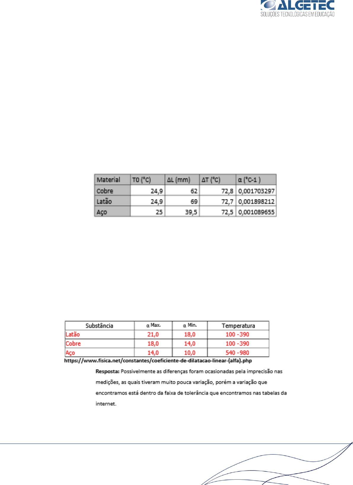 LABORATÓRIO DE FÍSICA DILATÔMETRO 1 ALGETEC – SOLUÇÕES TECNOLÓGICAS EM EDUCAÇÃO CEP: 40260-215 Fone: 71 3272-3504 E-mail: contato@algetec.com.br | Site: www.algetec.com.br AVALIAÇÃO DOS RESULTADOS PARTE I - DETERMINAIÃO DO COEFICIENTE DE DILATAIÃO LINEAR 1. Anote na Tabela 1 os valores obtidos durante a primeira parte do experimento. Utilize a equação 1 para calcular o coeficiente de dilatação linear α de cada material, lembrando que o comprimento inicial dos corpos de prova é L0 = 500 mm. Tabela 1 – Temperatura e dilatação dos corpos de prova com diferentes materiais ∆𝐿 = 𝛼. 𝐿0. ∆𝑇 (1) 2. Pesquise na internet o valor do coeficiente de dilatação de cada material e compare com o calculado. Justifique eventuais diferenças. mailto:contato@algetec.com.br http://www.algetec.com.br/ LABORATÓRIO DE FÍSICA DILATÔMETRO 2 ALGETEC – SOLUÇÕES TECNOLÓGICAS EM EDUCAÇÃO CEP: 40260-215 Fone: 71 3272-3504 E-mail: contato@algetec.com.br | Site: www.algetec.com.br PARTE II: VARIAIÃO NO COMPRIMENTO FINAL DE UM TUBO METÁLICO EM FUNIÃO DO SEU COMPRIMENTO INICIAL 1. Anote na Tabela 2 os valores obtidos durante a segunda parte do experimento. Tabela 2 – Temperatura e dilatação dos corpos de prova com diferentes comprimentos 2. Construa o gráfico variação do comprimento ∆L x comprimento inicial L0 e determine seu coeficiente angular. 3. Determine o coeficiente angular do gráfico ∆L x L0 e explique o que ele representa. mailto:contato@algetec.com.br http://www.algetec.com.br/ LABORATÓRIO DE FÍSICA DILATÔMETRO 3 ALGETEC – SOLUÇÕES TECNOLÓGICAS EM EDUCAÇÃO CEP: 40260-215 Fone: 71 3272-3504 E-mail: contato@algetec.com.br | Site: www.algetec.com.br 4. Com base nos seus conhecimentos, verifique a validade da afirmação: “A variação no comprimento de um material, para uma mesma variação de temperatura, é diretamente proporcional ao seu comprimento inicial.” Resposta: Podemos validar está aifrmação porque a dilatação depende não só da variação de temperatura, mas também das dimensões (comprimento inicial) e do material de composição da barra, visto que os materiais apresentam diferentes comportamentos quando submetidos a mesma variação de temperatura. mailto:contato@algetec.com.br http://www.algetec.com.br/