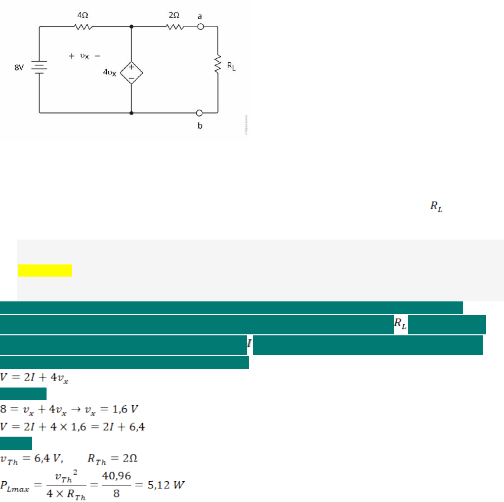 CIRCUITOS ELETRICOS I ATIVIDADE 2 Sabe-se que a “potência máxima é transferida a uma carga quando a resistência de carga for igual à resistência de Thévenin quando vista da carga” (ALEXANDER; SADIKU, 2013, p. 133). ALEXANDER, C. K.; SADIKU, M. N. O. Fundamentos de circuitos elétricos. 5. ed. São Paulo: Bookman, 2013. Diante dessa informação, analise o circuito abaixo: Figura - Circuito com fontes de tensão e resistores Fonte: Elaborada pelo autor. A partir do exposto, responda: qual é a máxima transferência de potência para a carga no circuito? Analise as afirmativas a seguir e julgue a alternativa correta: • 0,8 W. • 40,96 W. • 5,12 W. • 10,24 W. • 20,48 W. Resposta correta. A alternativa está correta, pois, primeiramente, temos que obter o circuito equivalente de Thévenin visto pelo terminal ab. Consideramos a resistência do como infinita e colocamos uma fonte de corrente com a corrente entre a e b e calculamos a tensão da fonte de corrente. Aplicando as leis de Kirchhoff, teremos: Também: Então: • Pode-se dizer que um circuito linear é constituído apenas por elementos e fontes lineares, isto é, resistores, capacitores e indutores. Sabe-se que a linearidade é definida como uma relação constante de causa e efeito. SADIKU, M. N. O.; MUSA S. M.; ALEXANDER C. K. Análise de circuitos elétricos com aplicações. 5. ed. São Paulo: AMGH, 2014. A partir dessas informações, considere o circuito abaixo: Figura - Circuito com resistores Fonte: Elaborada pelo autor. Sabe-se que, para uma corrente na entrada , a corrente da saída será de . A partir dessas informações e do conteúdo estudado a respeito de linearidade e superposição, responda: Qual é a corrente de saída para a uma corrente da entrada de ? Assinale a alternativa correta: • 12A • 6 • 2 • • ~Resposta correta. A alternativa está correta porque O circuito é linear. Se aumentar o 2 vezes para que seja igual a 12 , a corrente da saída ( também vai aumentar 2 vezes. Então, temos: . Leia o trecho a seguir: “Se um circuito tiver duas ou mais fontes independentes, uma maneira de determinar o valor de uma variável específica (tensão ou corrente) é usar a análise nodal ou a de malhas. Outra forma seria determinar a contribuição de cada fonte independente à variável e então somá-las. Essa última forma é conhecida como superposição” (ALEXANDER; SADIKU, 2013, p. 115). ALEXANDER, C. K.; SADIKU, M. N. O. Fundamentos de circuitos elétricos. 5. ed. São Paulo: Bookman, 2013. A partir dessas informações, considere o circuito abaixo: Figura - Circuito com fonte de tensão, fonte de corrente e resistor Fonte: Elaborada pelo autor. A partir da figura acima e do fragmento citado, calcule a tensão , utilizando propriedade de superposição e, em seguida, julgue qual das alternativas é a correta: • 3 • 0 • 12 • 15 • 30 Resposta correta. A alternativa está correta porque analisamos a contribuição de cada fonte de forma independente, aplicando a fonte de 12V e considerando a fonte de 3 A como contato aberto, calculamos a tensão sobre o resistor e, desse modo, temos: . Aplicando a fonte de 3 A, a corrente sobre o resistor será igual a 0 A ; sendo assim, a tensão sobre o resistor será igual a zero. Leia o trecho a seguir: “Muitas vezes pode acontecer de um determinado elemento em um circuito ser variável, enquanto outros elementos são fixos. Como exemplo característico, temos uma tomada de uma residência onde se pode conectar diferentes aparelhos, constituindo em uma carga variável. Cada vez que o elemento variável for alterado, todo o circuito tem de ser analisado por completo novamente. Para evitar esse problema, o teorema de Thévenin fornece uma técnica pela qual a parte fixa do circuito é substituída por um circuito equivalente” (ALEXANDER; SADIKU, 2013, p. 122). ALEXANDER, C. K.; SADIKU, M. N. O. Fundamentos de circuitos elétricos. 5. ed. São Paulo: Bookman, 2013. Considerando as informações apresentadas e os conteúdos estudados, observe o circuito equivalente de Thévenin visto pela terminal ab no circuito abaixo e responda: qual é a tensão de Thévenin? Assinale a alternativa correta: Figura - Circuito com fonte de tensão e fonte de corrente e resistores Fonte: Elaborada pelo autor. • • • • • Resposta correta. A alternativa está correta, pois, para calcular a tensão de Thévenin vista pelo terminal ab, consideramos o terminal ab como um circuito aberto. Aplicando a lei de Kirchhoff para o circuito, teremos a equação abaixo, em que a tensão de Thévenin é representada com e é calculada igual a 21 volts . . O princípio da superposição afirma que a tensão (ou a corrente) em um elemento em um circuito linear é a soma algébrica da soma das tensões (ou das correntes) naquele elemento em virtude da atuação isolada de cada uma das fontes independentes” (ALEXANDER; SADIKU, 2013, p. 115). ALEXANDER, C. K.; SADIKU, M. N. O. Fundamentos de circuitos elétricos. 5. ed. São Paulo: Bookman, 2013. A partir da leitura do fragmento acima, calcule a corrente no circuito abaixo, utilizando propriedade de superposição e assinale a alternativa correta: Figura - Circuito com fontes de tensão e fonte de corrente Fonte: Elaborada pelo autor. • 1,5 • 3 • 4,5 • 2,5 • 2 Resposta correta. O efeito de cada fonte tem que ser estudado separadamente. Ao aplicar a fonte de 20 , o resistor de 6 ? está em paralelo com o outro resistor de 6 ?. Assim, teremos um resistor equivalente de 3 ? que está em série com o resistor de 7 ?, no qual está passando a corrente . Aplicando a fonte de 10 , para corrente total ( ), temos: Desse modo, a corrente que passa pelo resistor de 7 ohms será: Aplicando a fonte de 4 , teremos curto-circuito e, então, a corrente não passará pelo resistor de 7 ohms. Leia o trecho a seguir: É possível “liberar a potência máxima a uma carga quando um sistema com perdas internas conhecidas 