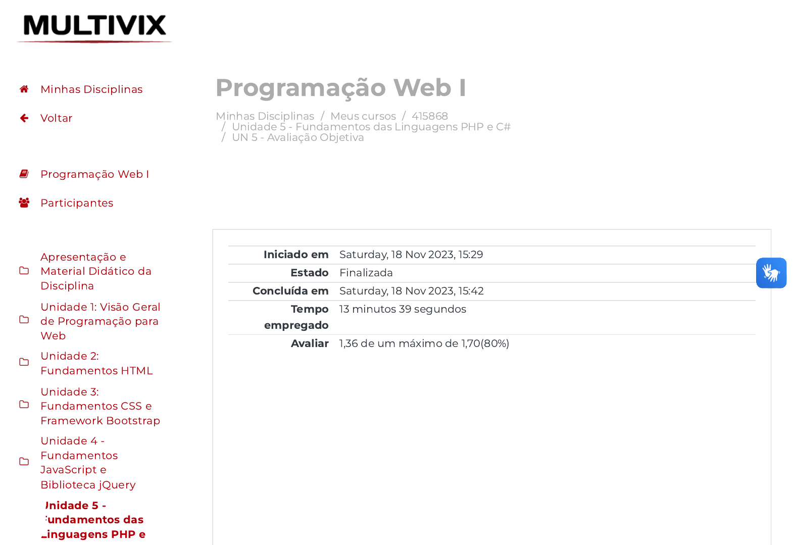 18/11/2023, 15:42 UN 5 - Avaliação Objetiva: Revisão da tentativa https://avap.multivix.edu.br/mod/quiz/review.php?attempt=4378151&cmid=1524079 1/11 Minhas Disciplinas / Meus cursos / 415868 / Unidade 5 - Fundamentos das Linguagens PHP e C# / UN 5 - Avaliação Objetiva Programação Web I Iniciado em Saturday, 18 Nov 2023, 15:29 Estado Finalizada Concluída em Saturday, 18 Nov 2023, 15:42 Tempo empregado 13 minutos 39 segundos Avaliar 1,36 de um máximo de 1,70(80%) Minhas Disciplinas Voltar Programação Web I Participantes Apresentação e Material Didático da Disciplina Unidade 1: Visão Geral de Programação para Web Unidade 2: Fundamentos HTML Unidade 3: Fundamentos CSS e Framework Bootstrap Unidade 4 - Fundamentos JavaScript e Biblioteca jQuery Unidade 5 - Fundamentos das Linguagens PHP e https://avap.multivix.edu.br/my/ https://avap.multivix.edu.br/course/view.php?id=23579 https://avap.multivix.edu.br/course/view.php?id=23579§ion=6 https://avap.multivix.edu.br/mod/quiz/view.php?id=1524079 https://avap.multivix.edu.br/my/ https://avap.multivix.edu.br/course/view.php?id=23579 https://avap.multivix.edu.br/user/index.php?id=23579 https://avap.multivix.edu.br/course/view.php?id=23579§ion=1 https://avap.multivix.edu.br/course/view.php?id=23579§ion=2 https://avap.multivix.edu.br/course/view.php?id=23579§ion=3 https://avap.multivix.edu.br/course/view.php?id=23579§ion=4 https://avap.multivix.edu.br/course/view.php?id=23579§ion=5 https://avap.multivix.edu.br/course/view.php?id=23579§ion=6 https://avap.multivix.edu.br/ https://avap.multivix.edu.br/ https://avap.multivix.edu.br/ https://avap.multivix.edu.br/ https://avap.multivix.edu.br/ https://avap.multivix.edu.br/ https://avap.multivix.edu.br/ https://avap.multivix.edu.br/ https://avap.multivix.edu.br/ https://avap.multivix.edu.br/ https://avap.multivix.edu.br/ https://avap.multivix.edu.br/ 18/11/2023, 15:42 UN 5 - Avaliação Objetiva: Revisão da tentativa https://avap.multivix.edu.br/mod/quiz/review.php?attempt=4378151&cmid=1524079 2/11 Questão 1 Correto Atingiu 0,34 de 0,34 Em relação as duas formas básicas de realização de repetição, atraves da linguagem C#, é possível utilizar a estrutura for ou while. A partir da sintaxe C#, por exemplo, pode-se realizar marcações Razor no uso de tais estruturas. Considerando o exposto, avalie as a�rmações a seguir. I. Na utilização básica da estrutura while, envolvendo uma variável em comparação a um número, é necessário que uma variável seja atribuída (acrescida ou decrescida), internamente ao laço, para que então a cada repetição possa ser realizado o teste proposto à repetição. Caso contrário acontece uma repetição in�nita. Por exemplo em: while (x < 10){ ... } II. Em um laço de repetição for, envolvendo uma variável em comparação a um número, é necessário que a variável em questão seja atribuída internamente a estrutura, para que não aconteça uma repetição in�nita. Por exemplo em: for (int y = 1; y < 5; y++){ ... } III. Tanto para estrutura de repetição for quanto para while é necessário atribuir valor para a variável em questão, internamente, durante cada repetição, com intuito que não ocorra um loop in�nito. É correto o que se a�rma em Escolha uma opção: Minhas Disciplinas Voltar Programação Web I Participantes Apresentação e Material Didático da Disciplina Unidade 1: Visão Geral de Programação para Web Unidade 2: Fundamentos HTML Unidade 3: Fundamentos CSS e Framework Bootstrap Unidade 4 - Fundamentos JavaScript e Biblioteca jQuery Unidade 5 - Fundamentos das Linguagens PHP e https://avap.multivix.edu.br/my/ https://avap.multivix.edu.br/course/view.php?id=23579 https://avap.multivix.edu.br/user/index.php?id=23579 https://avap.multivix.edu.br/course/view.php?id=23579§ion=1 https://avap.multivix.edu.br/course/view.php?id=23579§ion=2 https://avap.multivix.edu.br/course/view.php?id=23579§ion=3 https://avap.multivix.edu.br/course/view.php?id=23579§ion=4 https://avap.multivix.edu.br/course/view.php?id=23579§ion=5 https://avap.multivix.edu.br/course/view.php?id=23579§ion=6 https://avap.multivix.edu.br/ https://avap.multivix.edu.br/ https://avap.multivix.edu.br/ https://avap.multivix.edu.br/ https://avap.multivix.edu.br/ https://avap.multivix.edu.br/ https://avap.multivix.edu.br/ https://avap.multivix.edu.br/ https://avap.multivix.edu.br/ https://avap.multivix.edu.br/ https://avap.multivix.edu.br/ https://avap.multivix.edu.br/ 18/11/2023, 15:42 UN 5 - Avaliação Objetiva: Revisão da tentativa https://avap.multivix.edu.br/mod/quiz/review.php?attempt=4378151&cmid=1524079 3/11 II e III, apenas. I e III, apenas. I, apenas. I, II e III. I e II, apenas. Minhas Disciplinas Voltar Programação Web I Participantes Apresentação e Material Didático da Disciplina Unidade 1: Visão Geral de Programação para Web Unidade 2: Fundamentos HTML Unidade 3: Fundamentos CSS e Framework Bootstrap Unidade 4 - Fundamentos JavaScript e Biblioteca jQuery Unidade 5 - Fundamentos das Linguagens PHP e https://avap.multivix.edu.br/my/ https://avap.multivix.edu.br/course/view.php?id=23579 https://avap.multivix.edu.br/user/index.php?id=23579 https://avap.multivix.edu.br/course/view.php?id=23579§ion=1 https://avap.multivix.edu.br/course/view.php?id=23579§ion=2 https://avap.multivix.edu.br/course/view.php?id=23579§ion=3 https://avap.multivix.edu.br/course/view.php?id=23579§ion=4 https://avap.multivix.edu.br/course/view.php?id=23579§ion=5 https://avap.multivix.edu.br/course/view.php?id=23579§ion=6 https://avap.multivix.edu.br/ https://avap.multivix.edu.br/ https://avap.multivix.edu.br/ https://avap.multivix.edu.br/ https://avap.multivix.edu.br/ https://avap.multivix.edu.br/ https://avap.multivix.edu.br/ https://avap.multivix.edu.br/ https://avap.multivix.edu.br/ https://avap.multivix.edu.br/ https://avap.multivix.edu.br/ https://avap.multivix.edu.br/ 18/11/2023, 15:42 UN 5 - Avaliação Objetiva: Revisão da tentativa http