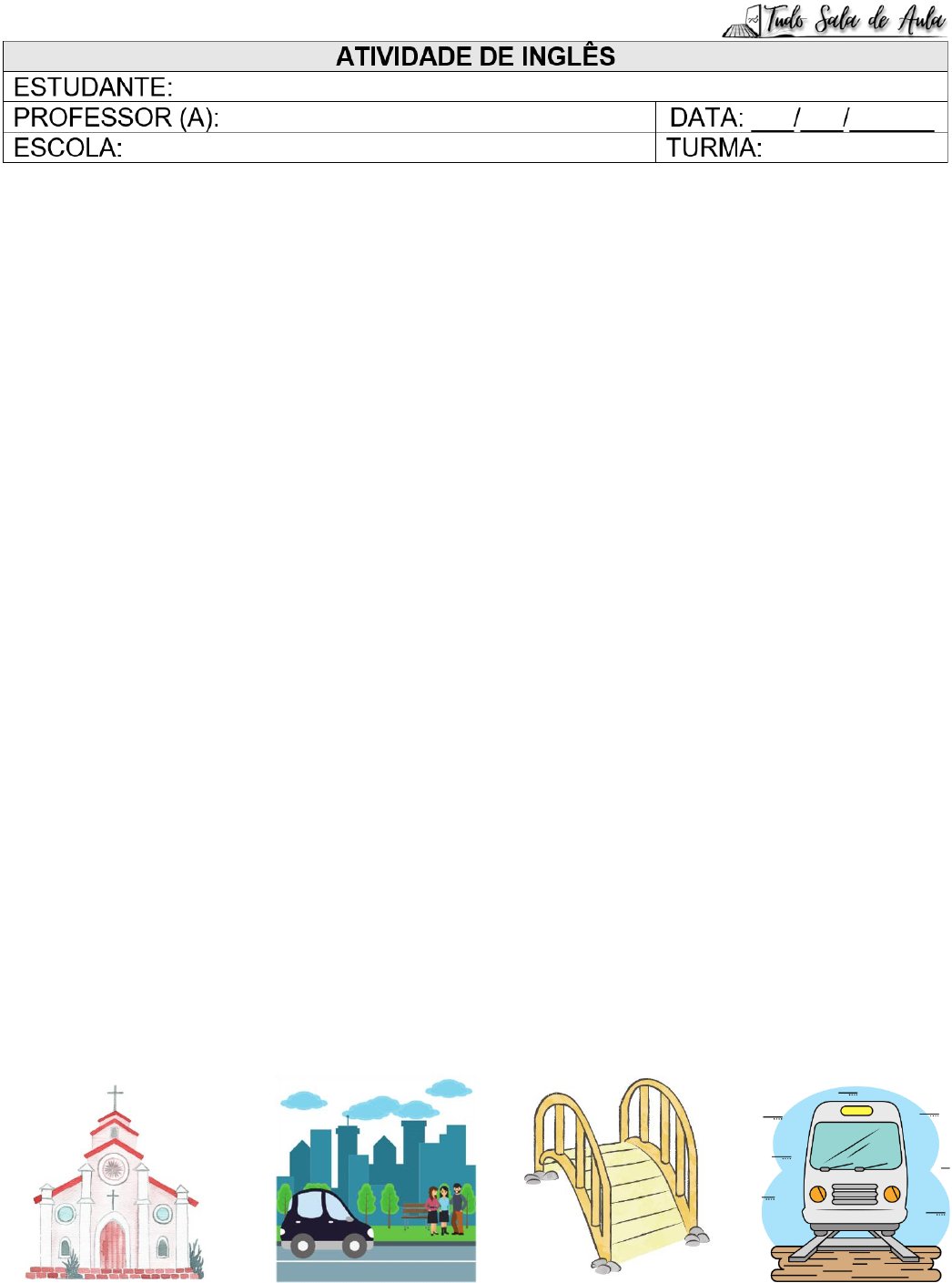 1. Associe as palavras aos seus significados. ( 1 ) Edifício ( ) Post office ( 2 ) Posto do corpo de bombeiros ( ) Bus ( 3 ) Apartamento ( ) Ambulance ( 4 ) Loja ( ) Skyscraper ( 5 ) Calçada ( ) Building ( 6 ) Parada de ônibus ( ) Fire Station ( 7 ) Escola ( ) Apartment ( 8 ) Igreja ( ) Shop ( 9 ) Ônibus ( ) Sidewalk ( 10 ) Correio ( ) Street ( 11 ) Arranha-céu ( ) Bank ( 12 ) Ambulância ( ) Subway ( 13 ) Rua ( ) Truck ( 14 ) Hospital ( ) Motorcycle ( 15 ) Delegacia de Polícia ( ) Museum ( 16 ) Carro ( ) Bridge ( 17 ) Sinal de trânsito ( ) Public phone ( 18 ) Semáforo ( ) Corner ( 19 ) Táxi ( ) Cab / Taxi ( 20 ) Esquina ( ) Police Station ( 21 ) Ponte ( ) Hospital ( 22 ) Museu ( ) Car ( 23 ) Banco ( ) Church ( 24 ) Metrô ( ) School ( 25 ) Telefone Público ( ) Bus stop ( 26 ) Moto ( ) Trafic sign ( 27 ) Caminhão ( ) Trafic light 2. A partir das imagens, escreva em inglês seus significados. a. b. c. d. __________________ __________________ __________________ __________________ 3. Busque no diagrama as seguintes palavras sobre o tema CIDADE. BANK CHURCH MUSEUM SHOP SUBWAY BUILDING CORNER POLICE STATION SIDEWALK TRAFIC LIGHT BUS STOP FIRE STATION POST OFFICE SKYSCRAPER TRAFIC SIGN BRIDGE MOTOCYCLE SCHOOL STREET TRUCK 4. Observe o trecho da canção de Miley Cyrus ( Party in the U.S.A. ). “Jumped in the cab, here I am for the first time. Look to my right, and I see the Hollywood sign” Sobre o vocabulário de Meios de Transporte na Cidade em inglês, qual está sendo mencionado? a) Metrô b) Ambulância c) Táxi d) Ônibus 5. Na canção de Demi Lovato “Skyscraper” há a seguinte passagem: "Go on and try to tear me down, I will be rising from the ground like a skyscraper". Ignorando a metáfora contida nesse trecho e considerando o tema em estudo “Locais da Cidade em Inglês”, marque a alternativa onde apresenta um local que é mencionado na passagem dessa canção. a) Igreja. b) Arranha-céu. c) Loja. d)Correio. 6. Ao caminhar por uma cidade, podemos nos deparar com vários tipos de estabelecimentos. Você como pedestre, precisa sempre andar pela calçada, que em inglês chamamos de SIDEWALK. Considerando o vocabulário em inglês sobre Cidade, como chamamos o encontro de duas ruas? a) Shop. b) Bridge. c) Church. d) Corner. 7. Relacione os seguintes verbos de ações com seus respectivos significados. ( 1 ) To walk ( ) Atravessar a rua ( 2 ) To stop ( ) Avançar / Ir / Prosseguir ( 3 ) To Go ( ) Caminhar ( 4 ) To Drive ( ) Dirigir ( 5 ) To cross the street ( ) Dobrar a esquina ( 6 ) To turn the corner ( ) Parar 8. A partir das imagens, escreva em inglês o verbo de ação. a) b) ____________________________ ____________________________ 9. Samanta foi a Ottawa pela primeira vez e resolveu passear na cidade. Ao caminhar, avistou um lindo vestido na vitrine de uma loja do outro lado da rua. Para que Samanta chegue a essa loja o que ela deve fazer? a) To cross the street. b) To turn the corner. c) To turn the left. d) To stop. 10. Marque a alternativa onde há somente verbos de ação. a) To stop / Sidewalk / Bridge b) Motorcycle / To turn the corner / Building c) To drive / To turn the corner / To stop d) To drive / Church / Shop