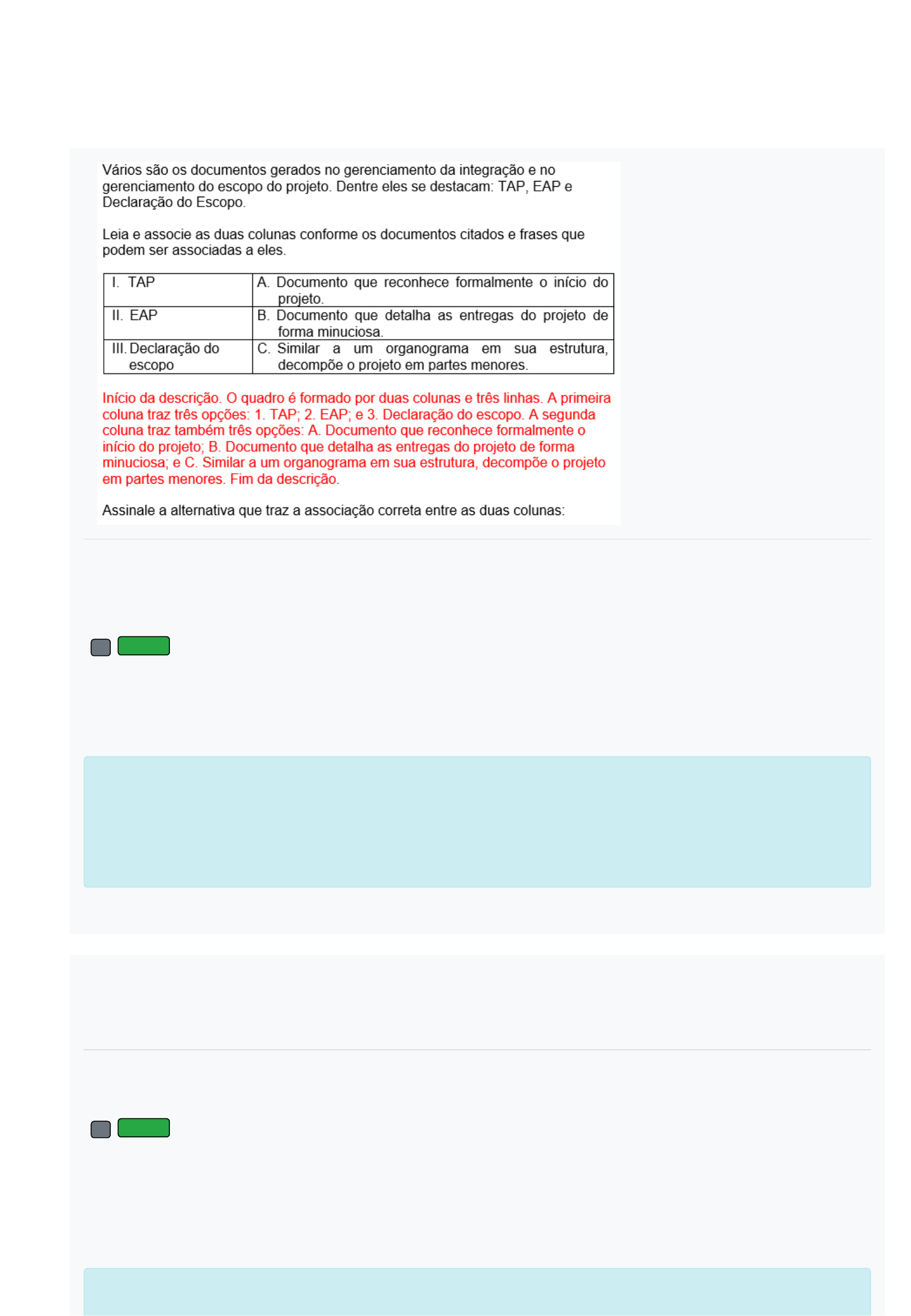 18/11/2023, 22:55 Cosmos · Cosmos https://kroton.platosedu.io/lms/m/aluno/disciplina/index/3119292/9037714 1/6 Gerenciamento estratégico de projetos Professor(a): Charlie Hudson Turette Lopes (Especialização) 1) 2) Prepare-se! Chegou a hora de você testar o conhecimento adquirido nesta disciplina. A Avaliação Virtual (AV) é composta por questões objetivas e corresponde a 100% da média final. Você tem até cinco tentativas para “Enviar” as questões, que são automaticamente corrigidas. Você pode responder as questões consultando o material de estudos, mas lembre-se de cumprir o prazo estabelecido. Boa prova! Alternativas: I-B; II-C; III-A. I-A; II-C; III-B. CORRETO I-A; II-B; III-C. I-C; II-A; III-B. I-B; II-A; III-C. Código da questão: 75362 A Estrutura Analítica do Projeto (EAP) é uma importante ferramenta para o planejamento no gerenciamento de projetos. A respeito do EAP, assinale a alternativa correta. Alternativas: O último nível hierárquico da EAP apresenta os pacotes de trabalho. CORRETO O último nível hierárquico da EAP apresenta as entregas do projeto. O nome do projeto é inserido do maior nível de decomposição da EAP. Deve ser feita apenas pelo Gerente de Projetos. O processo “Criar a EAP” está no grupo de processos de iniciação. Resolução comentada: O TAP é o documento que reconhece formalmente o início do projeto. A EAP é similar a um organograma em sua estrutura, e decompõe o projeto em partes menores. Já a Declaração do Escopo é o documento que detalha as entregas do projeto de forma minuciosa. Resolução comentada: 18/11/2023, 22:55 Cosmos · Cosmos https://kroton.platosedu.io/lms/m/aluno/disciplina/index/3119292/9037714 2/6 3) 4) Código da questão: 75359 Gerenciar riscos é fundamental para a condução de projetos de diversos perfis de complexidade. O gerente de projetos e sua equipe precisam utilizar ferramentas e técnicas adequadas para identificar, analisar e dar respostas aos riscos. Sobre o gerenciamento de riscos nos projetos, analise as assertivas a seguir e identifique as corretas: I. O bom gerenciamento de riscos reduz as incertezas do projeto. II. “Planejar as respostas aos riscos” é o processo no qual decisões como aceitar, mitigar, transferir ou eliminar os riscos são tomadas. III. A Matriz de probabilidade X impacto é empregada na análise qualitativa dos riscos. IV. Premissas não possuem relação com riscos. São verdadeiras: Alternativas: II e III, apenas II e IV, apenas. I, II e III, apenas. CORRETO I, II e IV, apenas. I e II, apenas. Código da questão: 75373 No primeiro nível da EAP é inserido o nome do projeto; no segundo, as entregas; e, no último nível da EAP, os pacotes de trabalho. Resolução comentada: Gerenciar riscos é fundamental para a condução de projetos de diversos perfis de complexidade. O gerente de projetos e sua equipe precisam utilizar ferramentas e técnicas adequadas para identificar, analisar e dar respostas aos riscos. Sobre o gerenciamento de riscos nos projetos, analise as assertivas a seguir e identifique as corretas: I. O bom gerenciamento de riscos reduz as incertezas do projeto. II. “Planejar as respostas aos riscos” é o processo no qual decisões como aceitar, mitigar, transferir ou eliminar os riscos são tomadas. III. A Matriz de probabilidade X impacto é empregada na análise qualitativa dos riscos. IV. Premissas não possuem relação com riscos. São verdadeiras: 18/11/2023, 22:55 Cosmos · Cosmos https://kroton.platosedu.io/lms/m/aluno/disciplina/index/3119292/9037714 3/6 5) 6) Alternativas: I-B; II-A; III-C. I-A; II-C; III-B. I-B; II-C; III-A. I-C; II-A; III-B. CORRETO I-A; II-B; III-C. Código da questão: 75372 O Gerente de Projetos (GP) é responsável pela integridade, confiabilidade e cuidado das atividades realizadas em um projeto. Sobre a atuação do GP, analise as assertivas a seguir e identifique as corretas: I. O GP deve obrigatoriamente ter conhecimento técnico sobre o projeto que está atuando. II. O GP deve ter diligência em sua atuação no projeto. III. O GP nem sempre atuará em estruturas hierárquicas projetizadas. IV. O GP é responsável pelo desempenho das métricas do projeto. São verdadeiras: Alternativas: I e II, apenas. I, II e III, apenas II e IV, apenas III e IV, apenas. II, III e IV, apenas CORRETO Código da questão: 75358 Projetos geram resultados únicos e exclusivos. Por outro lado, os processos são previsíveis, mensuráveis e rotineiros. Escolha a alternativa que é um exemplo de processo. Alternativas: Fabricação de celulares em uma linha de montagem. CORRETO Instalação de uma linha de montagem para fabricação de celulares. A construção de um prédio. A construção de um prédio. Transposição de um rio. Resolução comentada: No gerenciamento de riscos, uma ferramenta sugerida é a Matriz de probabilidade X impacto. No gerenciamento das comunicações, um fator decisivo para escolha de tecnologias empregadas é a confiabilidade das informações. Já no gerenciamento das partes interessadas, poder e interesse de cada participante do projeto devem ser identificados. Resolução comentada: I é INCORRETA, o GP deve ter conhecimento técnico em gerenciamento de projetos, mas pode atuar em vários segmentos empresariais e industriais; II é CORRETA, essa é uma habilidade esperada do GP; III é CORRETA, pois o GP pode atuar em outras estruturas, como a funcional; IV é CORRETA, pois é uma competência esperada do GP. Resolução comentada: 18/11/2023, 22:55 Cosmos · Cosmos https://kroton.platosedu.io/lms/m/aluno/disciplina/index/3119292/9037714 4/6 7) 8) Código da questão: 75354 Último processo de custos do grupo de processos de planejamento; e C. Feito a partir de indicadores de valor agregado. Fim da descrição. Assinale a alternativa que traz a associação correta entre as duas colunas: Alternativas: I-A; II-B; III-C. CORRETO I-C; II-A; III-B. I-B; II-C; III-A. I-B; II-A; III-C. I-A; 
