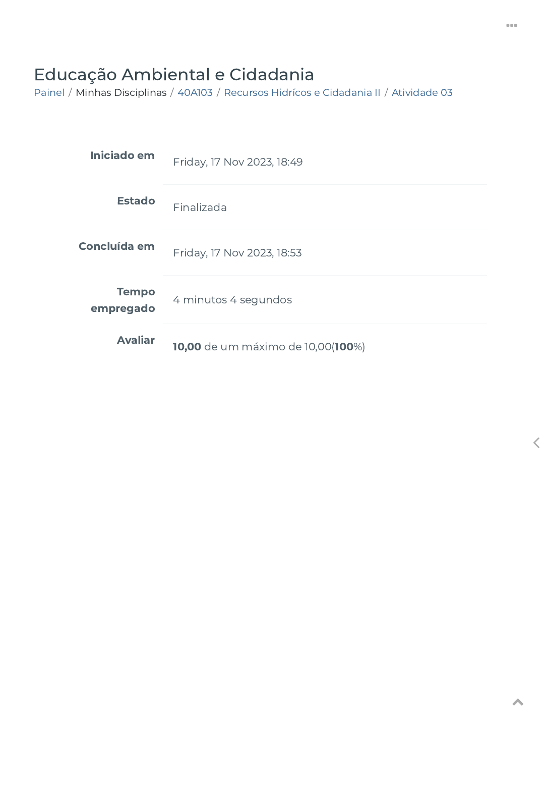 17/11/2023, 18:53 Atividade 03 https://ava.politecnicabr.com.br/mod/quiz/review.php?attempt=5918687 1/7 Painel / Minhas Disciplinas / 40A103 / Recursos Hidrícos e Cidadania II / Atividade 03 Educação Ambiental e Cidadania Iniciado em Friday, 17 Nov 2023, 18:49 Estado Finalizada Concluída em Friday, 17 Nov 2023, 18:53 Tempo empregado 4 minutos 4 segundos Avaliar 10,00 de um máximo de 10,00(100%) https://ava.politecnicabr.com.br/my/ https://ava.politecnicabr.com.br/my/ https://ava.politecnicabr.com.br/course/view.php?id=1046 https://ava.politecnicabr.com.br/course/view.php?id=1046#section-4 https://ava.politecnicabr.com.br/mod/quiz/view.php?id=27252 https://ava.politecnicabr.com.br/ 17/11/2023, 18:53 Atividade 03 https://ava.politecnicabr.com.br/mod/quiz/review.php?attempt=5918687 2/7 Questão 1 Correto Atingiu 2,00 de 2,00 Marque corretamente conforme o texto abaixo: A Lei Federal 9.433/97, também conhecida como Lei das Águas, instituiu a Política Nacional dos Recursos Hídricos e criou o Sistema Nacional de Gerenciamento dos Recursos Hídricos. Através da Lei 9.984/2000, foi criada a Agência Nacional de Águas (ANA), com a missão de implementar o sistema criado pela Lei de Recursos Hídricos. Essa Lei tem como base o princípio de que a água é um bem de domínio público, porém é um recurso natural limitado, dotado de valor econômico. Essa lei também determina que, em situações de escassez, o uso da água tem como prioridade o consumo humano e a dessedentação de animais. Além disso, a gestão dos recursos hídricos deve proporcionar o uso múltiplo das águas. A Política Nacional de Recursos Hídricos tem como objetivo assegurar a disponibilidade de água potável para esta e para as futuras gerações, e tem como um de seus instrumentos a Outorga de Direito de Uso de Recursos Hídricos. O principal ponto da Lei 9.433/97 é considerar a água como bem de consumo, passando a ser cobrada. Hoje, o valor que pagamos pela água em nossos lares é referente à sua distribuição e tratamento. A proposta da lei é cobrar pela retirada de água do ambiente, ou seja, cobrar pelos recursos naturais que estão sendo utilizados. Dessa maneira, deseja-se fazer com que a água seja reconhecida como bem econômico, fornecendo ao usuário uma indicação de seu real valor e incentivando a racionalização do seu uso, além de obter recursos �nanceiros para o �nanciamento dos programas e intervenções contemplados nos recursos hídricos Escolha uma opção: Verdadeiro Falso https://ava.politecnicabr.com.br/ 17/11/2023, 18:53 Atividade 03 https://ava.politecnicabr.com.br/mod/quiz/review.php?attempt=5918687 3/7 Questão 2 Correto Atingiu 2,00 de 2,00 Marque a alternativa Verdadeiro ou Falso: Segundo dados da OMS, mais de 2 milhões de pessoas morrem todo ano com doenças causadas pelo consumo de água contaminada e pela falta de saneamento. As crianças com até cinco anos são as mais afetadas, sendo 40% do total de casos. Essa realidade ocorre especialmente nos países em desenvolvimento, como Brasil, China e Índia. Uma pesquisa da Unesco sobre a qualidade dos mananciais de 122 países mostrou que a Bélgica é o país com pior qualidade de água por causa da escassez de seus lençóis freáticos, da poluição causada pelas indústrias e a falta de tratamento de resíduos. Nos primeiros lugares, estão Finlândia, Canadá, Nova Zelândia, Reino Unido e Japão. Ainda de acordo com o relatório, os rios asiáticos são os mais poluídos do mundo, e metade da população nos países pobres está exposta a água contaminada por esgoto ou resíduos industriais. Os exemplos de desperdício e despreocupação são muitos: lavagem de veículos com água tratada, o uso de válvulas sob pressão nas descargas dos vasos sanitários, o despejo das águas servidas de banho e lavagens em geral, sem a preocupação com a racionalização de consumo e/ou reutilização. Um meio para evitar a falta de água no futuro está nas ações de educação e conscientização das pessoas, incluindo todas as classes sociais e todos os setores: agrícola, indústria, comércio, residências e escolas. Ensinar a inter-relação que existe entre solo, água, ar e seres vivos é um modo de alcançar o objetivo de se ter cidadãos mais comprometidos com o futuro do planeta. No Brasil, as pessoas estão acostumadas com a ideia de abundância de água, a�nal de contas, é o país que possui 12% da água doce do mundo. Sem a consciência de que esse recurso pode acabar, é comum encontrar pessoas lavando a calçada com a mangueira aberta sem necessidade, utilizando jatos d’água (“vassoura hidráulica”), ou então escovando os dentes com a torneira aberta, jogando fora água potável. Escolha uma opção: https://ava.politecnicabr.com.br/ 17/11/2023, 18:53 Atividade 03 https://ava.politecnicabr.com.br/mod/quiz/review.php?attempt=5918687 4/7 Questão 3 Correto Atingiu 2,00 de 2,00 A Outorga de Direito de Uso de Recursos Hídricos é: Escolha uma opção: Verdadeiro Falso a. um documento emitido pela Agência Nacional das Águas (ANA), que dá o direito de retirada do recurso natural a uma empresa por determinado tempo. b. um documento emitido pelo Instituto Brasileiro de Meio Ambiente e Recursos Renováveis (IBAMA), que dá o direito de retirada do recurso natural a uma empresa por determinado tempo. c. o certi�cado que atesta o compromisso e a conduta da empresa em relação ao meio ambiente d. a capacidade de armazenamento de água da maioria dos reservatórios já foi muito reduzida pelo assoreamento e falta de cuidado com as margens. e. Nenhuma das alternativas anteriores. https://ava.politecnicabr.com.br/ 17/11/2023, 18:53 Atividade 03 https://ava.politecnicabr.com.br/mod/quiz/review.php?attempt=5918687 5/7 Questão 4 Correto Atingiu 2,00 de 2,00 As principais competências dos Comitês de Bacias Hidrográ�cas são: Escolha uma opção: a. aprovar o Plano de Recursos Hídricos da bacia. b. es