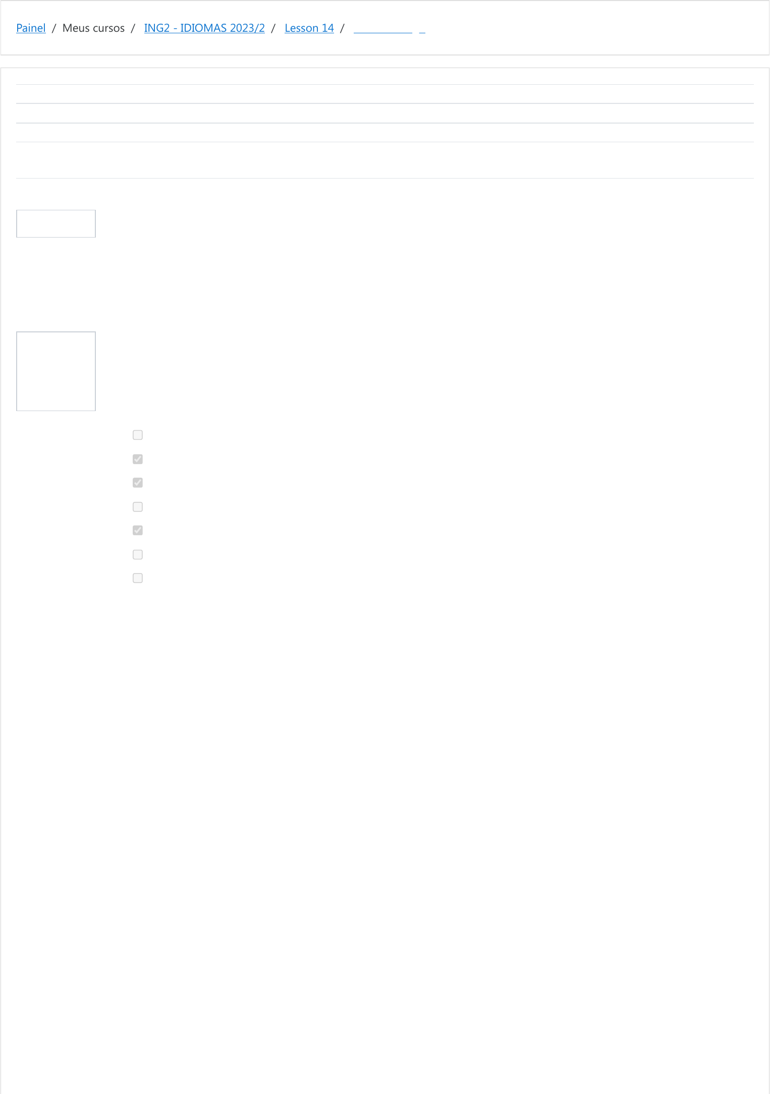Painel / Meus cursos / ING2 - IDIOMAS 2023/2 / Lesson 14 / Girls in charge Informação Questão 1 Correto Atingiu 5,00 de 5,00 Iniciado em domingo, 19 nov 2023, 08:47 Estado Finalizada Concluída em domingo, 19 nov 2023, 08:49 Tempo empregado 2 minutos 3 segundos Avaliar 10,00 de um máximo de 10,00(100%) Mr Tennant left Sarah and Amélie in charge of the diner for a weekend because he had to visit his mother in Alberta. Listen to him talking about what the girls had and hadn't done and check the ones you hear. Escolha uma ou mais: had cooked hadn't included themselves on Saturday schedule had organized the week schedule hadn't taken the trash out had ordered food and drinks had organized the schedules hadn't sent important e-mails Sua resposta está correta. As respostas corretas são: had organized the week schedule, had ordered food and drinks, hadn't included themselves on Saturday schedule https://moodle.ifsul.edu.br/novohamburgo/my/ https://moodle.ifsul.edu.br/novohamburgo/course/view.php?id=357 https://moodle.ifsul.edu.br/novohamburgo/course/view.php?id=357#section-23 https://moodle.ifsul.edu.br/novohamburgo/mod/quiz/view.php?id=56903 Questão 2 Correto Atingiu 5,00 de 5,00 Escolha uma ou mais: had made money hadn't organized anything had cooked had cleaned everything hadn't cleaned the tables had talked to his mother had called the clients had done a great job with the clients had taken the garbage out Sua resposta está correta. As respostas corretas são: had cleaned everything, had made money, had taken the garbage out, had done a great job with the clients ◄ At barracuda Seguir para... Put it in order! ► https://moodle.ifsul.edu.br/novohamburgo/mod/quiz/view.php?id=56902&forceview=1 https://moodle.ifsul.edu.br/novohamburgo/mod/quiz/view.php?id=56904&forceview=1