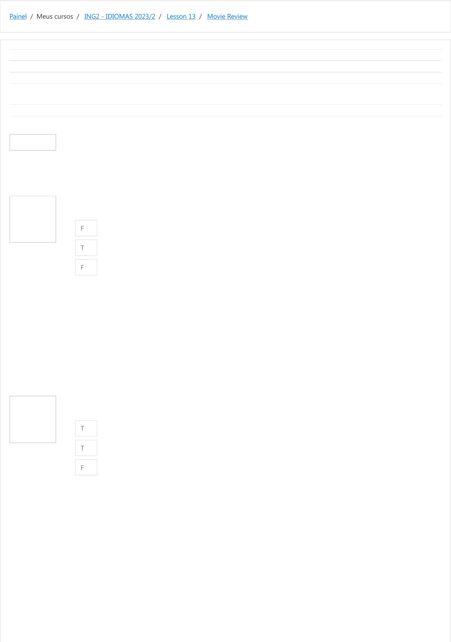 Painel / Meus cursos / ING2 - IDIOMAS 2023/2 / Lesson 13 / Movie Review Informação Questão 1 Correto Atingiu 1,00 de 1,00 Questão 2 Correto Atingiu 1,00 de 1,00 Iniciado em domingo, 19 nov 2023, 08:27 Estado Finalizada Concluída em domingo, 19 nov 2023, 08:28 Tempo empregado 1 minuto 14 segundos Notas 3,00/3,00 Avaliar 10,00 de um máximo de 10,00(100%) Listen to a movie review and check the sentences True (T) or False (F). Percy Jones is the director of Moving Mountains. The movie was released in Canada. People believe the movie is good but won't get any Oscar Statue. F T F Sua resposta está correta. A resposta correta é: [F] Percy Jones is the director of Moving Mountains. [T] The movie was released in Canada. [F] People believe the movie is good but won't get any Oscar Statue. It is a thriller and people are really connected to the movie while watching it. It can be considered a Canadian-American movie. Shelton is considered a good director, but not a perfectionist. T T F Sua resposta está correta. A resposta correta é: [T] It is a thriller and people are really connected to the movie while watching it. [T] It can be considered a Canadian-American movie. [F] Shelton is considered a good director, but not a perfectionist. https://moodle.ifsul.edu.br/novohamburgo/my/ https://moodle.ifsul.edu.br/novohamburgo/course/view.php?id=357 https://moodle.ifsul.edu.br/novohamburgo/course/view.php?id=357#section-22 https://moodle.ifsul.edu.br/novohamburgo/mod/quiz/view.php?id=56886 Questão 3 Correto Atingiu 1,00 de 1,00 The movie soundtrack is very good, with hit songs. As well as the soundtrack, the costumes are amazing. Despite some huge problems, the movie is good. T F F Sua resposta está correta. A resposta correta é: [T] The movie soundtrack is very good, with hit songs. [F] As well as the soundtrack, the costumes are amazing. [F] Despite some huge problems, the movie is good. ◄ Movie Crew - Who Is Who? Seguir para... Strong Or Weak Sound? ► https://moodle.ifsul.edu.br/novohamburgo/mod/quiz/view.php?id=56885&forceview=1 https://moodle.ifsul.edu.br/novohamburgo/mod/quiz/view.php?id=56887&forceview=1