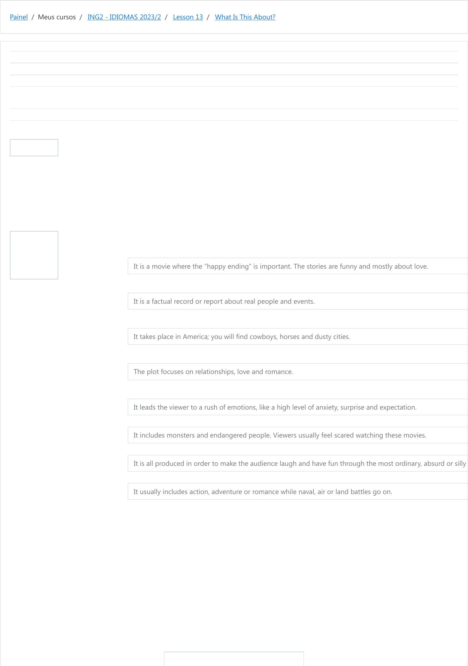 Painel / Meus cursos / ING2 - IDIOMAS 2023/2 / Lesson 13 / What Is This About? Informação Questão 1 Correto Atingiu 1,00 de 1,00 Iniciado em domingo, 19 nov 2023, 08:05 Estado Finalizada Concluída em domingo, 19 nov 2023, 08:08 Tempo empregado 3 minutos 22 segundos Notas 1,00/1,00 Avaliar 10,00 de um máximo de 10,00(100%) You studied some movie genres in this lesson. Relate them to their description. ⠀⠀⠀⠀⠀⠀⠀⠀ Romantic Documentary Western Chick flick Thriller Horror Comedy War It is a movie where the “happy ending” is important. The stories are funny and mostly about love. It is a factual record or report about real people and events. It takes place in America; you will find cowboys, horses and dusty cities. The plot focuses on relationships, love and romance. It leads the viewer to a rush of emotions, like a high level of anxiety, surprise and expectation. It includes monsters and endangered people. Viewers usually feel scared watching these movies. It is all produced in order to make the audience laugh and have fun through the most ordinary, absurd or silly It usually includes action, adventure or romance while naval, air or land battles go on. Sua resposta está correta. A resposta correta é: Romantic → It is a movie where the “happy ending” is important. The stories are funny and mostly about love., Documentary → It is a factual record or report about real people and events., Western → It takes place in America; you will find cowboys, horses and dusty cities., Chick flick → The plot focuses on relationships, love and romance., Thriller → It leads the viewer to a rush of emotions, like a high level of anxiety, surprise and expectation., Horror → It includes monsters and endangered people. Viewers usually feel scared watching these movies., Comedy → It is all produced in order to make the audience laugh and have fun through the most ordinary, absurd or silly situations., War → It usually includes action, adventure or romance while naval, air or land battles go on.. Seguir para... https://moodle.ifsul.edu.br/novohamburgo/my/ https://moodle.ifsul.edu.br/novohamburgo/course/view.php?id=357 https://moodle.ifsul.edu.br/novohamburgo/course/view.php?id=357#section-22 https://moodle.ifsul.edu.br/novohamburgo/mod/quiz/view.php?id=56880 ◄ Movie Section Talking About Preferences ► https://moodle.ifsul.edu.br/novohamburgo/mod/quiz/view.php?id=56879&forceview=1 https://moodle.ifsul.edu.br/novohamburgo/mod/quiz/view.php?id=56881&forceview=1