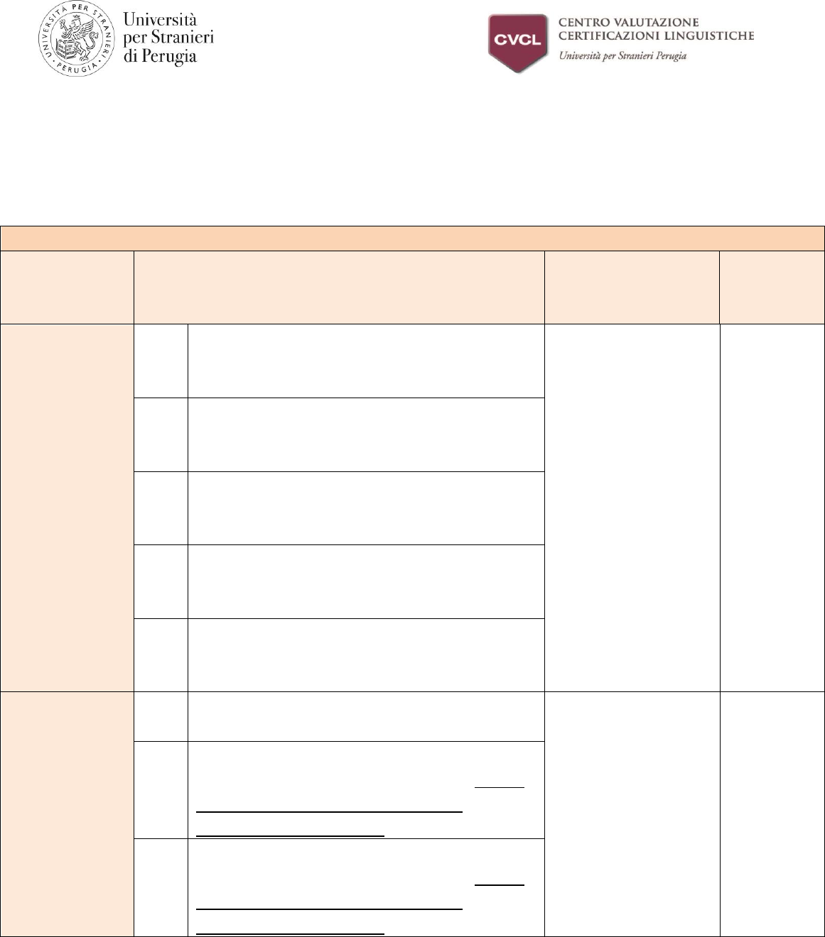 CELI 2 (livello B1) CRITERI DI VALUTAZIONE E PUNTEGGI 1° FASCICOLO: PARTE A e PARTE B Prova Criteri e punteggi Punteggio complessivo nella prova Rilevanza della prova PARTE A Prova di comprensione della lettura A.1 2 punti per ogni risposta corretta 0 punti per l’astensione o per ogni risposta errata Il punteggio ottenuto viene riportato su un punteggio complessivo di 40 punti (vedi tabelle di conversione) 25% A.2 1 punto per ogni risposta corretta 0 punti per l’astensione o per ogni risposta errata A.3 1 punto per ogni risposta corretta 0 punti per l’astensione o per ogni risposta errata A.4 1 punto per ogni risposta corretta 0 punti per l’astensione o per ogni risposta errata A.5 1 punto per ogni completamento corretto 0 punti per l’astensione o per ogni completamento errato PARTE B Prova di Produzione scritta B.1 Da 0 a 5 punti (1/2 punto per ogni risposta completa e ben formulata) 40 punti 25% B.2 Da 0 a 15 punti assegnati seguendo le relative scale di competenze (vedi Criteri per l’espressione dei giudizi e dei punteggi – parte scritta) B.3 Da 0 a 20 punti assegnati seguendo le relative scale di competenze (vedi Criteri per l’espressione dei giudizi e dei punteggi – parte scritta) 2° FASCICOLO: PARTE C Prova Criteri e punteggi Punteggio complessivo nella prova Rilevanza della prova PARTE C Prova di comprensione dell’ascolto C.1 2 punti per ogni risposta corretta 0 punti per l’astensione o per ogni risposta errata Il punteggio ottenuto viene riportato su un punteggio complessivo di 40 punti (vedi tabelle di conversione) 25% C.2 2 punti per ogni risposta corretta 0 punti per l’astensione o per ogni risposta errata C.3 1 punto per ogni risposta corretta 0 punti per l’astensione o per ogni risposta errata PROVA DI PRODUZIONE ORALE Prova Criteri e punteggi Punteggio complessivo nella prova Rilevanza della prova Prova di produzione orale Da 0 a 20 punti assegnati seguendo le relative scale di competenze (vedi Criteri per l’espressione dei giudizi e dei punteggi – parte orale) Il punteggio ottenuto viene moltiplicato per 2. Punteggio complessivo = 40 punti 25% Punteggio della Prova Scritta 120 punti Punteggio della Prova Orale 40 punti Punteggio complessivo 160 punti Per superare l’esame del CELI 2 - B1 è necessario ottenere un minimo di 72 punti nella Prova scritta (dato dalla somma dei punteggi ottenuti nelle diverse componenti) 22 punti nella Prova orale ESPRESSIONE DEL RISULTATO Il risultato finale si ottiene sommando il punteggio della Prova Scritta al punteggio della Prova Orale e viene espresso secondo una scala che prevede 5 gradi, 3 positivi e 2 negativi. Ogni grado viene indicato con una lettera dell’alfabeto e corrisponde a una banda di punteggi: Punteggio compreso tra 138 e 160 punti A = ottimo Punteggio compreso tra 115 e 137 punti B = buono Punteggio compreso tra 94 e 114 punti C = sufficiente Punteggio compreso tra 60 e 93 punti D = insufficiente Punteggio compreso tra 0 e 59 punti E = gravemente insufficiente L’esame è considerato superato se il punteggio ottenuto è compreso tra 94 e 160. SISTEMA DI CAPITALIZZAZIONE I candidati che non abbiano superato la Prova Scritta (Parti A, B, C) e che abbiano invece superato la Prova Orale o viceversa (Prova scritta superata e Prova orale non superata), possono capitalizzare per un anno (due sessioni d’esame) il risultato parziale ottenuto, sottoponendosi nuovamente alla prova risultata insufficiente. ACCESSO AL RISULTATO I candidati possono accedere ai propri risultati direttamente dal sito del CVCL: www.cvcl.it, entrando in ‘Area studenti’ e poi ‘Area riservata ai candidati’ e autenticandosi con le seguenti credenziali: Username: il proprio numero di matricola Password: la propria data di nascita. Una volta entrati, accedendo alla funzione ‘Risultati’ e poi ‘Azioni’ potranno controllare l’esito del proprio esame, scaricare e stampare il proprio Profilo (per un esempio si veda “Esempio profilo candidati”) e i certificati sostituitivi. Nel Profilo, oltre all’esito dell’esame e al punteggio raggiunto, vengono riportate le valutazioni ottenute nelle singole prove (gravemente insufficiente, insufficiente, sufficiente, buono, ottimo). http://www.cvcl.it/ Il giudizio della commissione di valutazione è insindacabile (art 1.14 Regolamento Esami CELI) Dietro esplicita e motivata richiesta il candidato ha il diritto di visionare i propri elaborati esclusivamente presso i locali del CVCL dell’Università per Stranieri di Perugia, previo appuntamento (art 1.16 Regolamento Esami CELI)