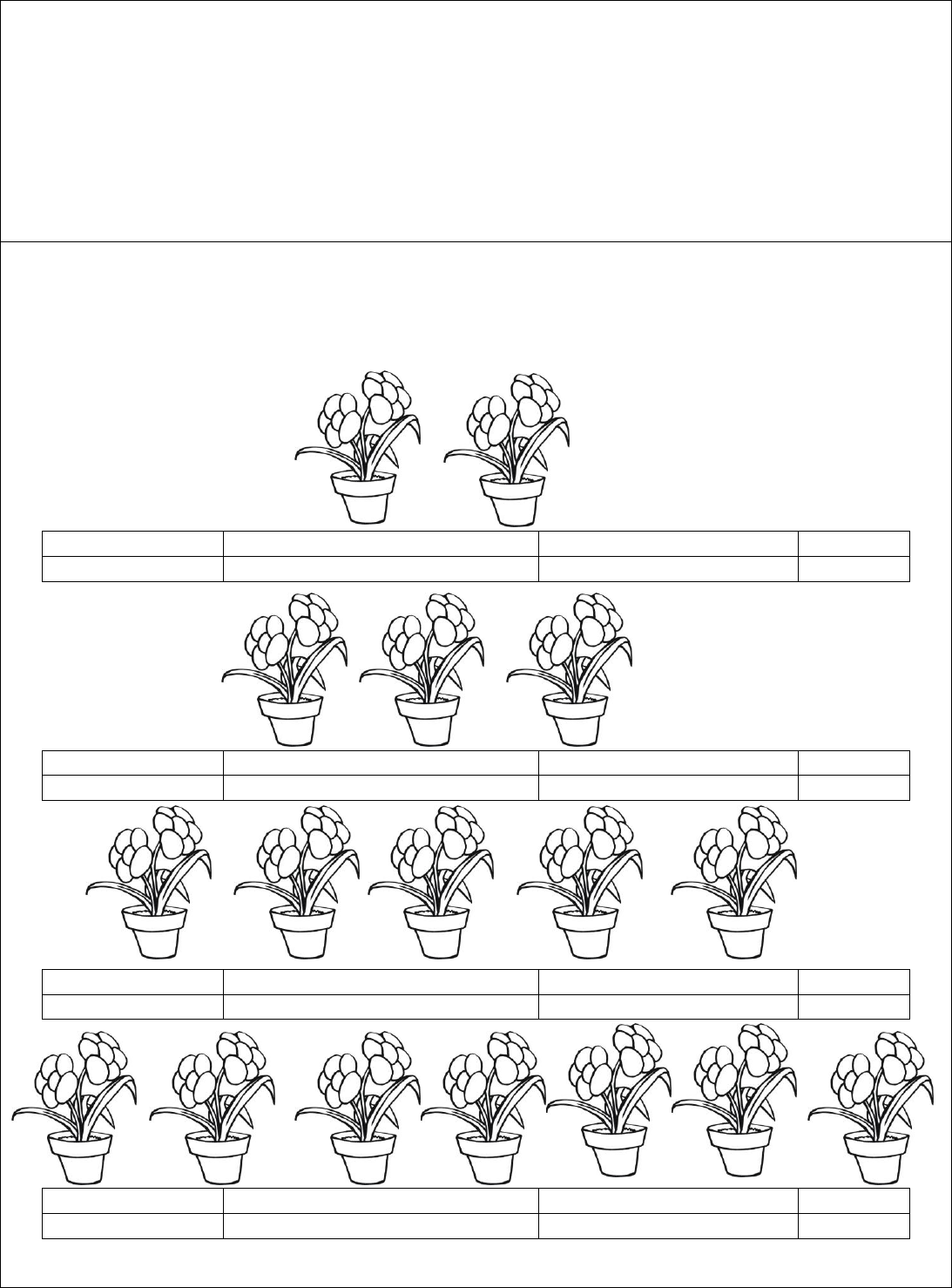 NOME: ________________________________________ Nº ______ PROFESSORA: ______________________________ ANO: ________ DATA: ____/____/____ Maria é dona de uma floricultura e resolveu arrumar sua vitrine. Para deixá-la bem bonita colocou em cada vaso duas flores bem coloridas! 1. Observa os vasos com as flores e completa a tabela abaixo: Quantos vasos? Quantas flores em cada vaso? Quantas flores ao todo? X Quantos vasos? Quantas flores em cada vaso? Quantas flores ao todo? X Quantos vasos? Quantas flores em cada vaso? Quantas flores ao todo? X Quantos vasos? Quantas flores em cada vaso? Quantas flores ao todo? X