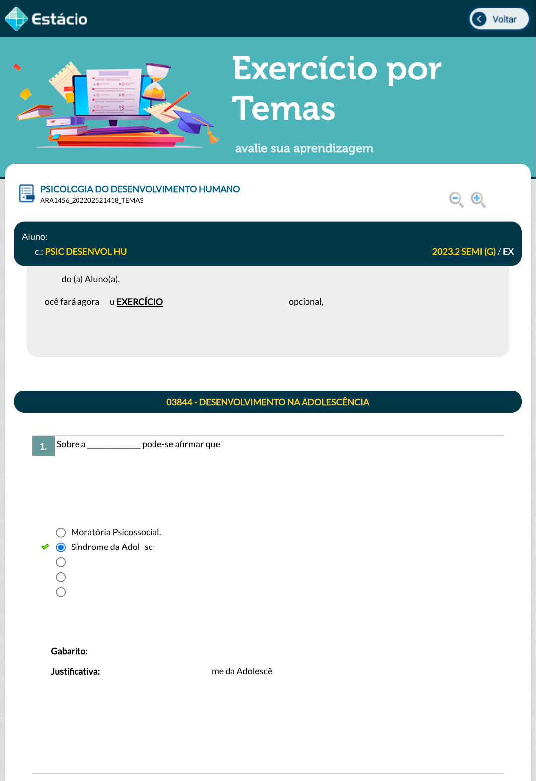 Exercício por Temas avalie sua aprendizagem Sobre a _______________ pode-se a�rmar que é um conjunto de comportamentos e mudanças que as crianças apresentam ao chegar à adolescência entre os 12 e 18 anos. É importante para os pais compreenderem que este é um momento natural, mas que deve ser observado e conduzido para que não exista tendência a se tornar patológico, com a superação de três lutos: (i) a perda do corpo infantil; (ii) a perda da identidade da infância; (iii) a perda da �gura protetora dos pais. Sobre essa visão sobre o processo da adolescência, marque a alternativa que completa corretamente a lacuna. PSICOLOGIA DO DESENVOLVIMENTO HUMANO Lupa ARA1456_202202521418_TEMAS Aluno: ANDRE LUIZ C AVES M DES Matr.: 202 02521418 Disc.: PSIC DESENVOL HU 2023.2 SEMI (G) / EX Prezado (a) Aluno(a), Você fará agora seu EXERCÍCIO! Lembre-se que este exercício é opcional, mas não valerá ponto para sua avaliação. O mesmo será composto de questões de múltipla escolha. Após responde cada questão, você terá acesso ao gabarito comentado e/ou à explicação da mesma. Aproveite para se familiarizar com este modelo de questões que será usado na sua AV e AVS. 03844 - DESENVOLVIMENTO NA ADOLESCÊNCIA 1. Moratória Psicossocial. Síndrome da Adolescência Normal. Identidade Colcha de Retalhos. Adolescência Tardia. Adolescência Universal. Data Resp.: 19/11/2023 18:13:18 Explicação: Gabarito: Síndrome da Adolescência Normal. Justi�cativa: Na visão de Knobel, a Síndrome da Adolescência Normal é um conjunto de comportamentos e mudanças que as crianças apresentam ao chegar à adolescência entre os 12 e 18 anos. Será de vital importância para os pais compreenderem que este é um momento natural, mas que deve ser observado e conduzido para que não exista tendência a se tornar patológico, com a superação de três lutos: a perda do corpo infantil; a perda da identidade da infância; a perda da �gura protetora dos pais. javascript:voltar(); javascript:voltar(); javascript:voltar(); javascript:voltar(); javascript:diminui(); javascript:diminui(); javascript:aumenta(); javascript:aumenta(); Sobre as características da Síndrome da Adolescência Normal, foram relacionados por Knobel sintomas e aspectos relevantes dessa fase de desenvolvimento. "Poderão ser notadas modi�cações corporais e adaptadas as expectativas da sociedade. Essa experiência de ter um corpo em mutação leva a con�itos com a autoimagem, criando orgulho e ao mesmo tempo vergonha do próprio corpo. Poderão ocorrer momentos de isolamento e apropriação de identidades transitórias, como um esboço de desenho da própria identidade". Esses sintomas podemos dizer que estão relacionados a qual tema a ser desenvolvido A adolescência é uma fase repleta de mudanças físicas, emocionais e sociais. Durante esse período, muitos jovens podem experimentar o que é conhecido como a "síndrome da adolescência normal". Marque a alternativa que indica algumas das características da síndrome da adolescência normal. Segundo Rodrigues e Melchiori (2014), Piaget a�rma que existem alguns avanços observados no pensamento durante a adolescênciae que podem ser descritos como a capacidade de pensar em termos abstratos, passando a manipular informação de uma maneira mais �exível. É possível se entendido conscientemente o tempo histórico e espaço extraterrestre pois eles apreciam melhor a metáfora e alegoria (descobrindo signi�cados mais profundos na literatura) e �cam aptos a pensar em termos do que poderia ser, imaginando possibilidades testando hipóteses. O que provoca a mudança para o raciocínio formal, na visão de Piaget atribuiu essa mudança a uma combinação de _______________ e a expansão das _______________. Ambas são essenciais, pois o raciocínio do jovem pode até avançar o su�ciente para permitir o raciocínio formal, mas ele só poderá realizá-lo com a estimulação apropriada. RODRIGUES, O.M., MELCHIORI, L.E. Aspectos do desenvolvimento na idade escolar e na adolescência. 2014. Marque a alternativa que completa a lacuna corretamente. 2. Busca a si mesmo e da identidade. Atitude reinvindicatória. Necessidade de intelectualizar. Evolução sexual. Tendência grupal. Data Resp.: 19/11/2023 18:15:23 Explicação: Gabarito: busca a si mesmo e da identidade. Justi�cativa: Knobel relacionou 10 sintomas e características da Síndrome da Adolescência Normal, neste caso as características estão relacionadas com o tema da busca de si mesmo e da identidade. Todas as modi�cações corporais e as expectativas da sociedade com relação ao jovem podem levá-lo a perceber que ele está vivenciando uma situação nova, com ansiedade pelo desconhecimento do rumo que tudo irá tomar. Apesar de todas essas mudanças, o adolescente precisa transitar e evoluir sua personalidade, ou seja, precisa saber quem ele é, em que está se transformando, para assim reconstruir sua identidade. É muito comum os jovens passarem horas e horas em frente ao espelho e comparam-se uns aos outros, buscando um padrão de normalidade e aceitação. Poderão ocorrer momentos de isolamento e apropriação de identidades transitórias, como um esboço de desenho da própria identidade. 3. Flutuações hormonais mínimas e reações que não afetam o comportamento. Diminuição da curiosidade e da exploração do mundo exterior. Um processo de busca de identidade e independência dos pais. Estabilidade emocional completa, sem altos e baixos e fragilidade emocional. Isolamento social e falta de interesse em relacionamentos interpessoais. Data Resp.: 19/11/2023 18:16:16 Explicação: A característica central da síndrome da adolescência normal é o processo de busca de identidade e independência dos pais. Durante essa fase, os adolescentes estão tentando de�nir quem são, o que acreditam e como desejam se encaixar no mundo, muitas vezes desa�ando as normas e valores familiares
