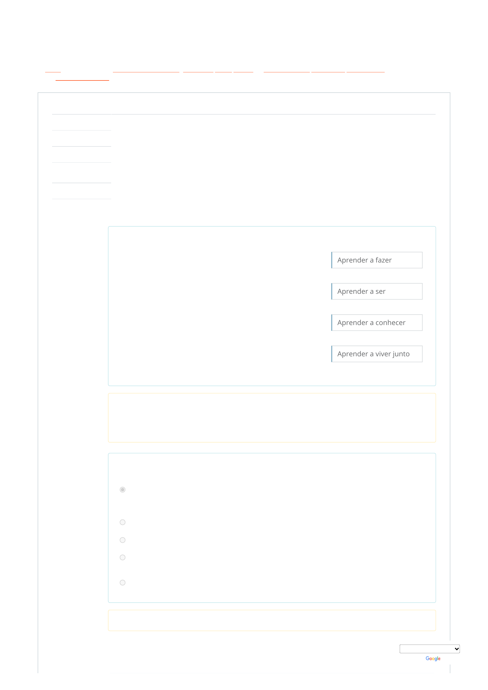 16/11/2023 19:02 Exercício Avaliativo 1: Revisão da tentativa https://mooc38.escolavirtual.gov.br/mod/quiz/review.php?attempt=13159445&cmid=274840 1/2 Painel / Meus cursos / Fundamentos e Metodologia da Educação Corporativa / Módulo 1 - Educação na Formação Profissional / Exercício Avaliativo 1 Questão 1 Correto Atingiu 1,00 de 1,00 Questão 2 Correto Atingiu 1,00 de 1,00 Iniciado em quinta, 16 nov 2023, 18:17 Estado Finalizada Concluída em quinta, 16 nov 2023, 18:26 Tempo empregado 8 minutos 40 segundos Notas 4,00/4,00 Avaliar 20,00 de um máximo de 20,00(100%) Considerando os quatro pilares que devem embasar a educação de Jacques Delors (2003), relacione: Adquirir qualificação profissional para enfrentar numerosas situações do cotidiano e no âmbito das diversas experiências sociais. Aprender para agir cada vez mais com maior capacidade de autonomia, de discernimento e de responsabilidade pessoal. Trata-se do aprender a aprender ativo e reflexivo. O aprender experimentado e vivenciado na dinâmica corporativa. Preparar-se para gerir conflitos - no respeito pelos valores do pluralismo, da compreensão mútua e da paz. Aprender a fazer Aprender a ser Aprender a conhecer Aprender a viver junto Com base nos quatro pilares para a educação de Jacque Delors (2003), concebe-se a educação para o século XXI, de forma que resulte no desenvolvimento de novas competências no aluno. Essas competências estão fundamentadas na assimilação de saberes por meio do conhecimento aprendido e apreendido, que resulte em ser mais crítico, criativo e reflexivo, com capacidades de se adaptar ao mudo de constantes mudanças e, ainda, para uma inserção social mais agregadora. Assinale a alternativa incorreta: Escolha uma opção: a. Na epistemologia construtivista, é certo dizer que o conhecimento é um produto que pertence ao professor. Na epistemologia construtivista o professor tem o papel de mediador do processo de ensino-aprendizagem e tem por responsabilidade apoiar e incentivar o aluno a ser sujeito do seu aprender. b. A função desenvolvimento profissional nas organizações públicas é constituída pela capacitação e treinamento, pelo planejamento de carreira e pela promoção funcional. c. O desenvolvimento de competências nas ações de educação se encontra fundamentado na assimilação de saberes a partir do conhecimento aprendido e apreendido. d. O processo ensino-aprendizagem, com base nos quatro pilares da educação para o século XXI (Jacques Delors, 2003), resultará num conjunto de saberes, todos essenciais ao mundo do trabalho na Era do Conhecimento. e. As tendências tradicionais apoiam-se na centralidade da instrução, tendo a escola como uma agência centrada no professor. Sua resposta está correta. Selecione o idioma Powered by Tradutor https://mooc38.escolavirtual.gov.br/my/ https://mooc38.escolavirtual.gov.br/course/view.php?id=14613 https://mooc38.escolavirtual.gov.br/course/view.php?id=14613#section-1 https://mooc38.escolavirtual.gov.br/mod/quiz/view.php?id=274840 https://translate.google.com/ 16/11/2023 19:02 Exercício Avaliativo 1: Revisão da tentativa https://mooc38.escolavirtual.gov.br/mod/quiz/review.php?attempt=13159445&cmid=274840 2/2 Questão 3 Correto Atingiu 1,00 de 1,00 Questão 4 Correto Atingiu 1,00 de 1,00 Relacione o tipo de Educação a sua descrição: O centro de atenção está nas tarefas: trata-se da educação que visa qualificar tecnicamente as pessoas, por meio da transmissão de conceitos, valores e técnicas profissionais. Tem como centro de atenção o conhecimento da própria pessoa e o desenvolvimento de habilidades que a credenciem a assumir a responsabilidade pelo seu futuro pessoal e profissional. É uma educação que possibilita à pessoa conhecer a si mesma, identificando seu potencial para saber utilizá-lo no momento certo, e para planejar estrategicamente o próprio futuro, desenvolvendo habilidades para ser criativa e crítica. Focaliza o conhecimento da realidade organizacional, suas origens e tendências. Trata dos valores, da cultura da organização, que propiciam a integração dessa pessoa à equipe e à organização, resultando em uma educação que torna a pessoa conhecedora do seu papel e da sua importância como parte de uma equipe de trabalho, compreendendo toda a trajetória da organização, visão, missão, valores, objetivos, estruturas e sistemas, o que leva ao desenvolvimento das habilidades para atuar com eficiência e efetividade. Educação Técnica Educação Pessoal Educação Profissional A resposta correta é: Focaliza o conhecimento da realidade organizacional, suas origens e tendências. Trata dos valores, da cultura da organização, que propiciam a integração dessa pessoa à equipe e à organização, resultando em uma educação que torna a pessoa conhecedora do seu papel e da sua importância como parte de uma equipe de trabalho, compreendendo toda a trajetória da organização, visão, missão, valores, objetivos, estruturas e sistemas, o que leva ao desenvolvimento das habilidades para atuar com eficiência e efetividade = Educação Profissional. O centro de atenção está nas tarefas: trata-se da educação que visa qualificar tecnicamente as pessoas, por meio da transmissão de conceitos, valores e técnicas profissionais = Educação Técnica. Tem como centro de atenção o conhecimento da própria pessoa e o desenvolvimento de habilidades que a credenciem a assumir a responsabilidade pelo seu futuro pessoal e profissional. É uma educação que possibilita à pessoa conhecer a si mesma, identificando seu potencial para saber utilizá-lo no momento certo, e para planejar estrategicamente o próprio futuro, desenvolvendo habilidades para ser criativa e crítica = Educação Pessoal. Ao saber agir responsável e reconhecido, que implica mobilizar, integrar, transferir conhecimentos, recursos, habilidades, que agregam valor econômico à organização e valor social ao