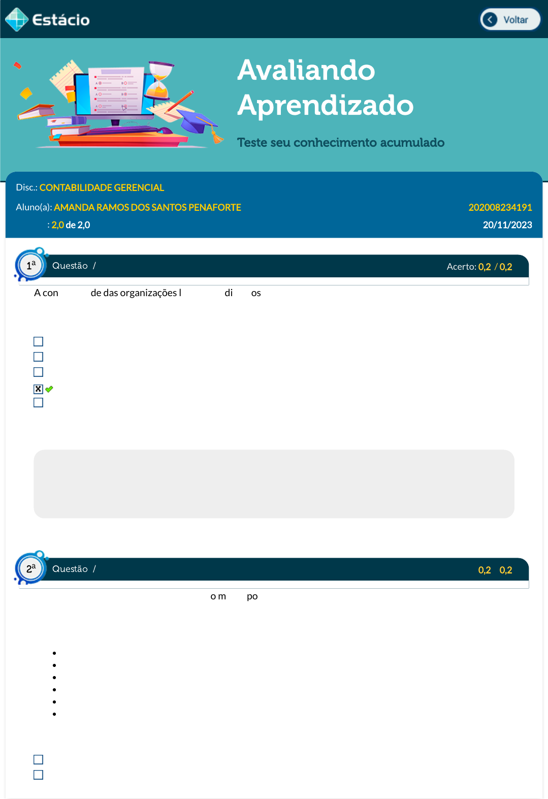 20/11/2023, 11:41 Estácio: Alunos https://simulado.estacio.br/alunos/ 1/5 Avaliando Aprendizado Teste seu conhecimento acumulado Disc.: CONTABILIDADE GERENCIAL Aluno(a): AMANDA RAMOS DOS SANTOS PENAFORTE 202008234191 Acertos: 2,0 de 2,0 20/11/2023 Acerto: 0,2 / 0,2 A contabilidade das organizações lidam com diversos tipos e classi�cações para os custos. O custo de oportunidade é um conceito importante na gestão �nanceira. Assinale a alternativa correta sobre custo de oportunidade. Custo de oportunidade é o custo real de um bem ou serviço. Custo de oportunidade é o mesmo que custo de produção de um bem ou serviço. Custo de oportunidade é o mesmo que lucro obtido em uma transação �nanceira. Custo de oportunidade é o custo de renunciar a uma oportunidade em favor de outra. Custo de oportunidade é o custo de aquisição de um bem ou serviço. Respondido em 20/11/2023 11:33:52 Explicação: Valor do benefício econômico que se deixa de obter ao escolher uma das alternativas. Ou seja, ao optar por uma delas, a administração necessariamente renuncia a outra(s) que geraria(m) algum benefício para a empresa - e tal benefício desperdiçado con�gura o custo de oportunidade. Acerto: 0,2 / 0,2 Uma indústria, que utiliza o preço ou custo médio ponderado móvel para a mensuração de seus estoques, recebeu uma encomenda de 220.000 unidades de seu produto pelo valor total de R$ 7.250.000. A indústria possuía as seguintes informações: O estoque inicial de matéria-prima era de R$ 3.125.000 (250.000 kg). Antes de iniciar a produção, a indústria adquiriu mais 125.000 kg (custo unitário de R$ 14,00). Cada unidade produzida utiliza 1 kg de matéria-prima. O custo da Mão de Obra Direta (MOD) empregada foi de R$ 1.250.000. Os Custos Indiretos de Fabricação (CIFs) foram de R$ 400.000. Toda a produção do período foi vendida. Qual é o custo de produção unitário? R$ 20,00 R$ 21,50 Questão / 1 a Questão / 2 a https://simulado.estacio.br/alunos/inicio.asp https://simulado.estacio.br/alunos/inicio.asp javascript:voltar(); javascript:voltar(); 20/11/2023, 11:41 Estácio: Alunos https://simulado.estacio.br/alunos/ 2/5 R$ 20,50 R$ 22,00 R$ 21,00 Respondido em 20/11/2023 11:35:08 Explicação: A resposta correta é: R$ 20,50 Acerto: 0,2 / 0,2 A taxa de retorno do ativo, junto com a margem de contribuição são indicadores importantes para a gestão contábil e �nanceira de um empreendimento. O que é a taxa de retorno do ativo? É a capacidade da empresa de gerar lucro a partir dos seus passivos. É a capacidade da empresa de gerar lucro a partir do seu patrimônio líquido. É a capacidade da empresa de gerar lucro a partir dos seus ativos. É a capacidade da empresa de gerar lucro a partir dos seus custos �xos. É a capacidade da empresa de gerar lucro a partir dos seus custos variáveis. Respondido em 20/11/2023 11:36:16 Explicação: Taxa de retorno do ativo é outro conceito que pode ser utilizado em conjunto com a margem de contribuição. Signi�ca a capacidade da empresa de gerar lucro a partir dos seus ativos. A taxa de retorno do ativo demonstra o quanto de resultado o ativo da empresa gerou para ela. Acerto: 0,2 / 0,2 A empresa deve combinar as visões de custos e mercado na de�nição do preço de venda. Por que essa combinação é importante? Para garantir que a empresa atenda apenas as demandas dos clientes atuais. Para garantir que a empresa tenha um alto lucro. Para garantir que a empresa ofereça preços competitivos no mercado. Para garantir que os preços de venda cubram apenas os custos de produção. Para garantir que a empresa atenda às demandas do mercado e ao mesmo tempo cubra seus custos e gere lucro. Respondido em 20/11/2023 11:37:08 Explicação: A de�nição do preço de venda deve levar em conta tanto os custos de produção quanto as demandas do mercado. É importante que a empresa compreenda o que o mercado quer para atribuir o preço de venda, mas também deve garantir que esse preço cubra os custos de produção e gere lucro para a empresa. Dessa forma, a empresa consegue atender às demandas do mercado e garantir a viabilidade �nanceira do negócio. Acerto: 0,2 / 0,2 Questão / 3 a Questão / 4 a Questão / 5 a 20/11/2023, 11:41 Estácio: Alunos https://simulado.estacio.br/alunos/ 3/5 Uma indústria fabrica e vende os produtos Alfa e Gama e durante o mês de janeiro de 2020 apresentou os seguintes dados: Considerando que a indústria distribui seus custos indiretos com base nos custos diretos de produção, os custos unitários dos produtos Alfa e Gama são, respectivamente: $ 574 e $ 858. $ 700 e $ 700. $ 780 e $ 630. $ 630 e $ 700. $ 630 e $ 788. Respondido em 20/11/2023 11:37:46 Explicação: A resposta correta é: $ 630 e $ 788. Acerto: 0,2 / 0,2 Algumas formas de custeio são permitidas pela contabilidade �nanceira enquanto outras não são aceitas. Um método de custeio muito utilizado pela contabilidade gerencial, que auxilia a tomada de decisão, porém não aceito pela contabilidade �nanceira é o Custeio variável. Custeio baseado em atividades. Custeio ABC. Custeio por absorção. Custeio indireto. Respondido em 20/11/2023 11:38:15 Explicação: O sistema de custeio variável ou direto considera como custos da produção apenas os custos variáveis.Esse custeio é muito usado pela Contabilidade Gerencial para �ns de tomada de decisão, pois emprega o conceito de margem de contribuição. No entanto, ele não é permitido pela Contabilidade Financeira, pois fere a realização da receita, a confrontação e a competência, já que todos os custos �xos são reconhecidos como despesas, independentemente de seus produtos correspondentes terem sido vendidos. Acerto: 0,2 / 0,2 O ponto de equilíbrio é o nível de vendas em que a receita total é igual ao total dos custos e despesas. Dessa forma, as variáveis que alteram o ponto de equilíbrio são: I. Custos e despesas �xas Questão / 6 a Questão / 7 a