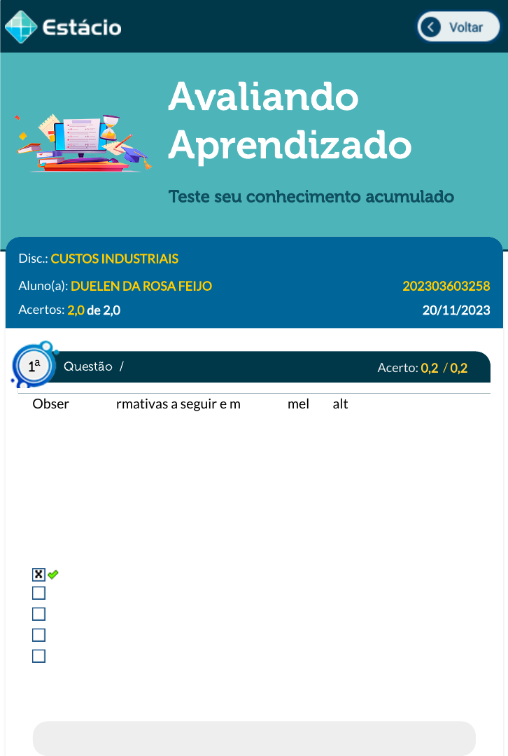 20/11/2023, 17:19 Estácio: Alunos https://simulado.estacio.br/alunos/ 1/7 Avaliando Aprendizado Teste seu conhecimento acumulado Disc.: CUSTOS INDUSTRIAIS Aluno(a): DUELEN DA ROSA FEIJO 202303603258 Acertos: 2,0 de 2,0 20/11/2023 Acerto: 0,2 / 0,2 Observe as a�rmativas a seguir e marque a melhor alternativa: I ¿ A Contabilidade de Custos tem por objeto o controle das operações da entidade, o apoio na tomada de decisões relativas a quanto produzir e quando, além de contribuir signi�cativamente na formação de preços ou na decisão de terceirizar atividades ou não; II ¿ A Contabilidade Gerencial representa um ramo autônomo da Contabilidade Financeira ou da Contabilidade de Custos; III ¿ O custeio por processo é adequado a empresas de atividades similares a concessionária de veículos (revisões obrigatórias) e produção de relógios; Apenas a a�rmativa I é correta; Apenas as a�rmativas são incorretas; Apenas as a�rmativas I e III estão corretas; Todas as a�rmativas são corretas; Apenas as a�rmativas I e III estão incorretas Respondido em 20/11/2023 17:13:05 Explicação: Base na teoria da Contabilidade. Questão / 1 a https://simulado.estacio.br/alunos/inicio.asp https://simulado.estacio.br/alunos/inicio.asp javascript:voltar(); javascript:voltar(); 20/11/2023, 17:19 Estácio: Alunos https://simulado.estacio.br/alunos/ 2/7 Acerto: 0,2 / 0,2 Os Custos primários incluem basicamente: c) Mão de obra direta e Matéria prima; d) Mão de obra indireta e Custos indiretos; b) Mão de obra direta e Mão de obra indireta; e) Mão de obra indireta e Custos diretos. a) Mão de obra indireta e Matéria Prima; Respondido em 20/11/2023 17:13:47 Acerto: 0,2 / 0,2 Com relação aos custos �xos e variáveis, diretos e indiretos, é incorreto a�rmar que: O custo de depreciação de uma máquina é geralmente Fixo e Indireto, assim como os salários da supervisão da produção. Custos Indiretos serão sempre rateados de acordo com algum critério de proporcionalidade que permita a melhor alocação de acordo com o esforço de produção de cada bem. Custos Diretos são geralmente variáveis, pois dependem do volume da produção, casos da Matéria Prima e da Mão-de-Obra Direta. A departamentalização é um critério de alocação de Custos Indiretos que busca ratear da melhor forma o total de insumos e recursos utilizados no processo produtivo Os Custos Fixos têm relação direta com o volume de produção, sendo necessários acrescentar a eles os custos variáveis diretos e indiretos. Respondido em 20/11/2023 17:16:21 Acerto: 0,2 / 0,2 Questão / 2 a Questão / 3 a Questão / 4 a 20/11/2023, 17:19 Estácio: Alunos https://simulado.estacio.br/alunos/ 3/7 A empresa JR apresenta os seguintes dados: Produção de 2000 unidades Custos �xos totais= 72000 Reais Custos variáveis totais= 70000 Reais Custos de depreciação= 10000 Reais (incluídos nos CF totais) Despesas �xas totais= 38000 Reais Despesas variáveis totais= 25000 Reais Despesas provisão inadimplência= 2000 Reais Venda de 1400 unidades a 25 Reais cada Custo de oportunidade de investimento= 5000 Reais Margem de contribuição unitária= 15,50 Reais Para a empresa JR, o ponto de equilíbrio �nanceiro é: a. 7127 e. 7056 b. 6898 c. 7535 d. 6452 Respondido em 20/11/2023 17:14:19 Explicação: Qpef= (72000+38000-10000)/15,5 = 6452 unid Acerto: 0,2 / 0,2 Determinada empresa produz e vende unicamente o produto A. A margem de contribuição unitária do produto A duplicou do terceiro para o quarto Questão / 5 a 20/11/2023, 17:19 Estácio: Alunos https://simulado.estacio.br/alunos/ 4/7 trimestre de 2009, mantendo-se todas as variáveis constantes. A causa para que esse fato tenha ocorrido foi a(o) diminuição do valor do aluguel das instalações. aumento dos custos da matéria-prima na fabricação do produto A. aumento do preço do produto A. aumento do aluguel das instalações. diminuição dos salários. Respondido em 20/11/2023 17:14:23 Acerto: 0,2 / 0,2 Se o preço de venda de um determinado produto é R$ 150,00 e ele é revendido com uma margem de 27% determine o preço de custo do produto e o ¿mark-up¿ obtido. PC = R4 120,00 e MARK UP = 40% PC = R4 110,00 e MARK UP = 37% PC = R4 120,00 e MARK UP = 37% PC = R4 120,00 e MARK UP = 27% PC = R$ 109,50,00 e MARK UP = 37% Respondido em 20/11/2023 17:15:24 Explicação: Margem = L / PV L = Margem * PV = 0,27 * 150 Lucro = R$ 40,5 PV = PC + L PC = PV - L PC = 150 - 40,5 PC = R$ 109,50 Mark-up = L / PC = 40,5 / 109,5 Mark-up = 0,3699 = 37% Questão / 6 a 20/11/2023, 17:19 Estácio: Alunos https://simulado.estacio.br/alunos/ 5/7 Acerto: 0,2 / 0,2 Na Indústria AZX, foram feitos os seguintes lançamentos no período: Custo de Produção do Período (CPP) = R$10300,00 Custo dos Produtos Acabados (CPA) = R$7500,00 Custo dos Produtos Vendidos (CPV) lançado no Demonstrativo de Resultados = R$7200,00 Estoque inicial do período de produtos em elaboração (EIPE) = R$1300,00 Estoque inicial do período de produtos acabados (EIPA) = R$1500,00 De posse desses dados, a equipe necessita calcular o valor do estoque final dos produtos em elaboração (EFPE) e dos produtos acabados (EFPA), respectivamente. Assinale a alternativa que representa o valor encontrado, sabendo que os funcionários fizeram os cálculos devidamente corretos: 4200,00 e 1800,00. 4300,00 e 1600,00. 4300,00 e 2000,00. 4100,00 e 2000,00. 4100,00 e 1800,00. Respondido em 20/11/2023 17:14:36 Explicação: Como CPA = EIPE + CPP ¿ EFPE, então: 7500 = 1300 + 10300 - EFPE, logo: EFPE = 4100,00 E como CPV = EIPA + CPA ¿ EFPA, então: 7200 = 1500 + 7500 ¿ EFPA, logo: EFPA = 1800,00 Acerto: 0,2 / 0,2 A Praiano Empreendimentos tem um período de conversão de seus estoques de 60 dias, um período médio de recebimento das vendas de 45 Questão / 7 a Questão / 8 a 20/11/2023, 17:19 Estácio: Alunos https://simulado.estacio.br/alunos/ 6/7 dias e um período médio de pagamento a fornecedores de 30 dias. Qu