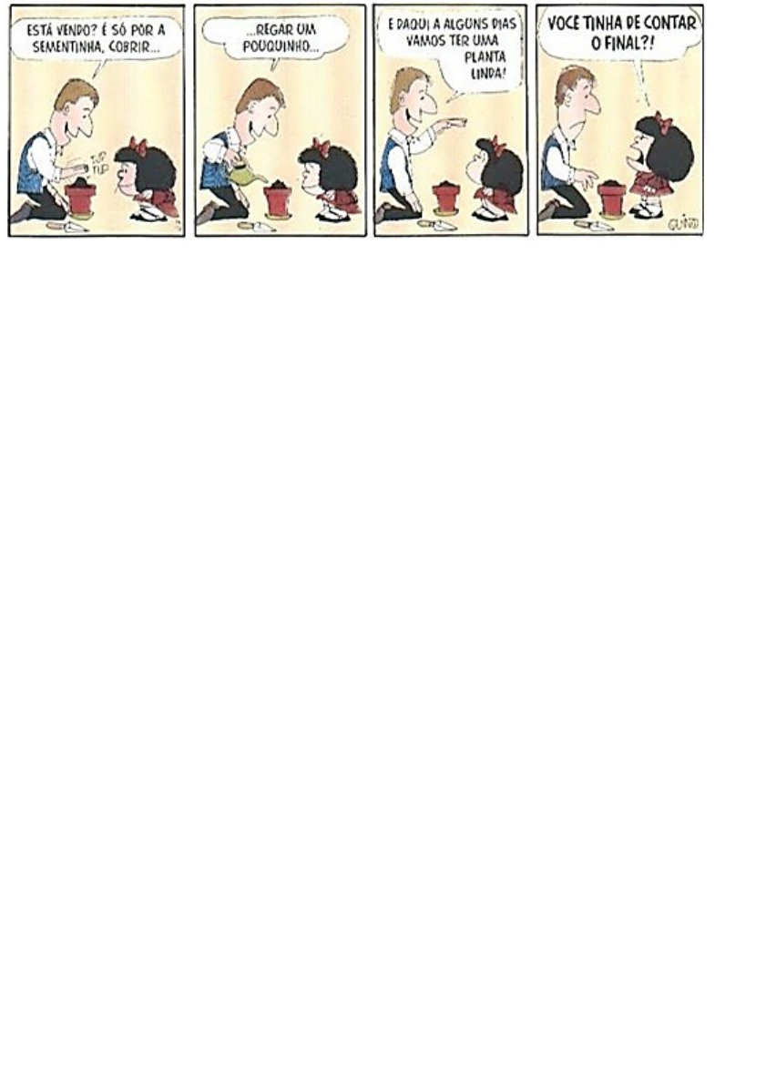 ESCOLA FLORIANO PEIXOTO Atendimento Educacional Especializado Profª: Romilda Lima Aluno(a):_______________________________________________ 1ª) No último quadrinho, o uso das letras maiúsculas e do uso da exclamação revelam que Mafalda ficou a) triste. b) preocupada. c) alegre. d) indignada. 2ª) A expressão do pai de Mafalda no último quadrinho revela que ele ficou a) com raiva. b) triste. c) confuso. d) alegre. 3ª) A finalidade da tirinha acima é a) promover reflexão. b) gerar dúvida no leitor. c) mostrar como se planta uma árvore. d) causar humor. 4ª) A tirinha acima apresenta uma linguagem a) verbal, somente. b) não verbal, somente. c) mista. d) nenhum tipo de linguagem. GABARITO: 1ª) d 2ª) c 3ª) d 4ª) c