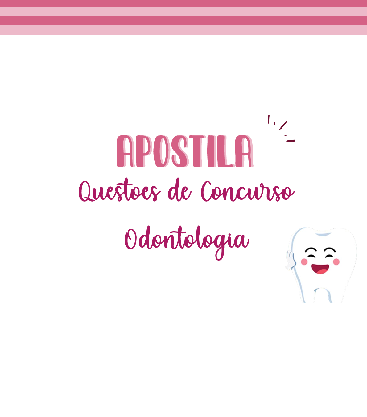 Por: Thainara Almeida | @dra.sorrisinho Essa apostila foi criada por Thainara Almeida, criadora da página dra.sorrisinho, fico feliz que tenha adquirido essa apostila com questões de concurso da área de Odontologia onde irei abordar questões das disciplinas abaixo! Lembrando que ao final da apostila encontra-se o gabarito com as respostas das questões... Cirurgia oral Dentística Endodontia Odontopediatria Implantodontia Farmacologia Periodontia Anestesiologia Prótese Oclusão Casos Clínicos Ortodontia Patologia Odontologia Hospitalar Materiais Odontológicos 1 - Paciente de 72 anos de idade foi encaminhado ao Cirurgião Bucomaxilofacial após queda da própria altura. Ao exame clínico, foi identificado ferimento corto-contuso na região mentual e mordida aberta anterior. Com base nessas informações, o diagnóstico é de uma fratura a) sínfise mandibular b) bilateral de côndilo. c) ângulo mandibular bilateral d) bilateral de mandíbula próxima à região dos forames mentuais. 2 - De acordo com a análise dentária, pode-se estimar a maior ou menor probabilidade de um dente ser de uma pessoa do sexo masculino ou do feminino. A esse respeito, o grupo dentário que apresenta características morfológicas de maior relevância na distinção entre o sexo masculino e feminino é o de: a) caninos. b) pré-molares. c) terceiros molares. d) molares inferiores. e) incisivos superiores. 3 - Os materiais odontológicos com maior potencial anticárie são classificados como cimentos de ionômero de vidro e cimentos de ionômero de vidro modificados por resina, que apresentam a) retenção maior que os selantes resinosos, com evidência por meio de estudos clínicos controlados randomizados da superioridade dos selantes resinosos. b) indicação no tratamento preventivo da cárie dentária conhecida como ART (Tratamento Restaurador Atraumático). c) eficácia na prevenção da iniciação e progressão da cárie dentária quando utilizados como selantes de fossas e fissuras. d) indicação na colagem de aparelhos ortodônticos para indivíduos com baixo risco de cárie dentária, apesar da qualidade estética desfavorável. e) retenção menor que os selantes resinosos, com evidência por meio de estudos clínicos controlados randomizados da superioridade dos selantes fluoretados. 4 - A presença de lesões cervicais cavitadas nos dentes 11 e 13 requer a) acompanhamento clínico e radiográfico. b) controle da cárie sem restauração. c) remineralização das lesões com flúor fosfato acidulado. d) preparo cavitário limitado à remoção do tecido cariado e) preparo cavitário com extensão de prevenção. 5 - Paciente do gênero masculino, leucoderma, 42 anos de idade, portador do vírus HIV e com interrupção de tratamento de coquetel retroviral, relata alteração em ?céu da boca há aproximadamente 20 dias? e que possui sabor ?estranho/desagradável?, às vezes tem sensação de queimação. Apresenta na região de palato duro e mole, membrana branca a branco-amarelada que é removida por raspagem e apresenta em mucosa subjacente área eritematosa irregular. O quadro clínico descrito relaciona-se com a hipótese de diagnóstico de a) Líquen plano erosivo. b) Candidíase hiperplásica c) Candidíase pseudomembranosa. d) Estomatite nicotínica. e) Hiperplasia fibrosa inflamatória papilomatosa. 6 - Paciente com 32 anos de idade, sexo feminino, apresenta pequena tumefação no lado direito da face e queixa de dor acentuada no dente 17. No momento do exame, a paciente encontra-se febril e refere mal-estar geral. Durante a anamnese, verifica-se histórico de alergia às penicilinas e a gravidade de sua infecção é considerada moderada. O exame clínico mostra mobilidade do dente 17 e forte sensibilidade à percussão e palpação. O aspecto radiográfico da área periapical mostra áreas radiolúcidas amplas. O quadro clínico descrito é compatível com o diagnóstico de a) angina de Ludwig. b) abscesso apical agudo. c) pericementite apical crônica. d) pericoronarite. e) granuloma apical. 7 - As lesões fundamentais são alterações morfológicas que ocorrem na mucosa bucal e assumem características próprias. Dentre as alternativas a seguir, assinale a que descreve corretamente uma bolha: a) São elevações circunscritas contendo liquido em seu interior com diâmetro maior que 3mm b) São elevações superficiais circunscritas com diâmetro menor que 3mm e de conteúdo sólido c) São elevações circunscritas contendo liquido em seu interior e não ultrapassando 3mm d) São elevações superficiais circunscritas com diâmetro maior que 3mm e de conteúdo sólido e) São elevações superficiais irregulares contendo liquido em seu interior com diâmetro maior que 3mm 8 – Paciente com 32 anos de idade, sexo feminino, apresenta pequena tumefação no lado direito da face e queixa de dor acentuada no dente 17. No momento do exame, a paciente encontra-se febril e refere mal-estar geral. Durante a anamnese, verifica-se histórico de alergia às penicilinas e a gravidade de sua infecção é considerada moderada. O exame clínico mostra mobilidade do dente 17 e forte sensibilidade à percussão e palpação. O aspecto radiográfico da área periapical mostra áreas radiolúcidas amplas. Recomenda-se a prescrição de: a) clavulanato de potássio 125 mg. b) amoxicilina 1 g. c) amoxicilina suspensão 250 mg/5 mL. d) estearato de eritromicina 1 g. e) clindamicina 600 mg. 9 - A endocardite infecciosa é uma infecção, geralmente bacteriana, da superfície endocárdica do coração. A profilaxia antibiótica é indicada antes de procedimentos odontológicos, como antes de realizar a) anestesias por técnicas de rotina (exceto a intraligamentar) através de tecidos não infectados. b) exodontia de dentes permanentes por indicação ortodôntica. c) radiografias odontológicas. d) colocação de aparelhos protéticos e ortodônticos removíveis. e) esfoliação de dentes decíduos. 