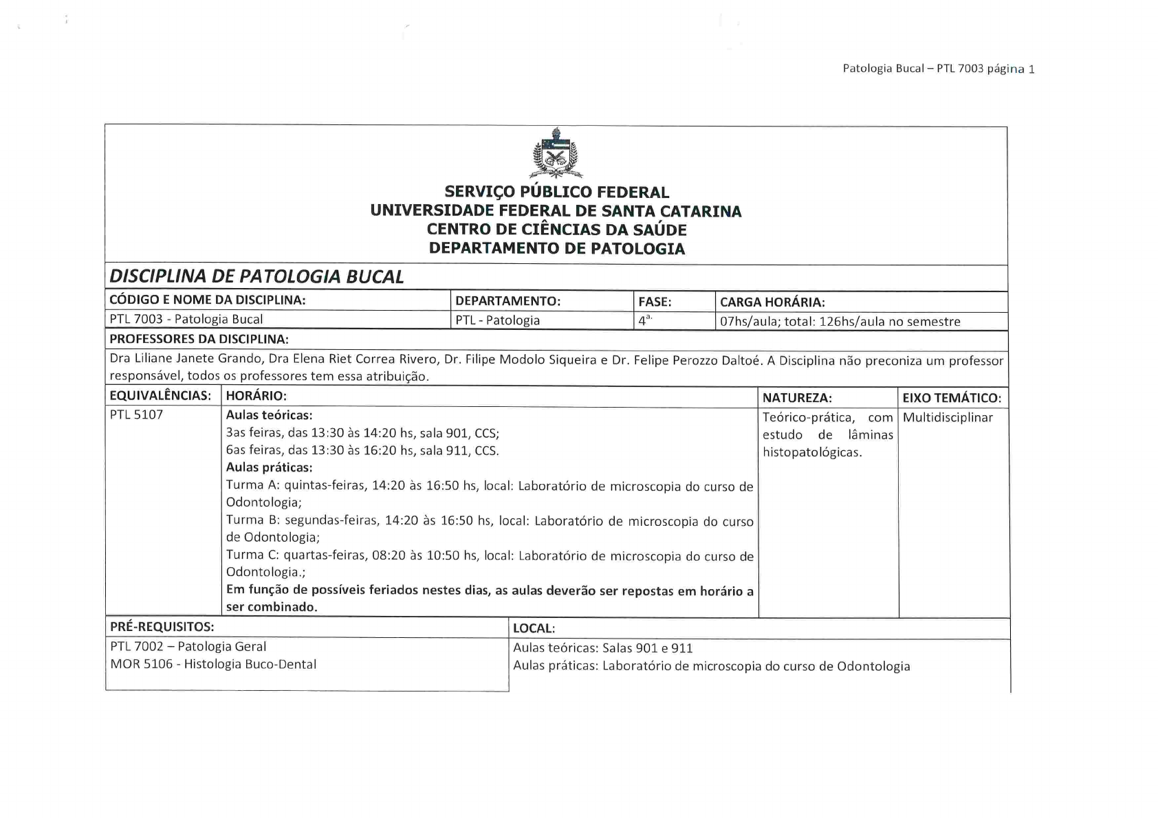 Dra Liliane Janete Grande, Dra Elena Riet Correa Rivero, Dr. Filipe Modolo Siqueira e Dr. Felipe Perozzo Daltoé. A Disciplina não preconiza um professor