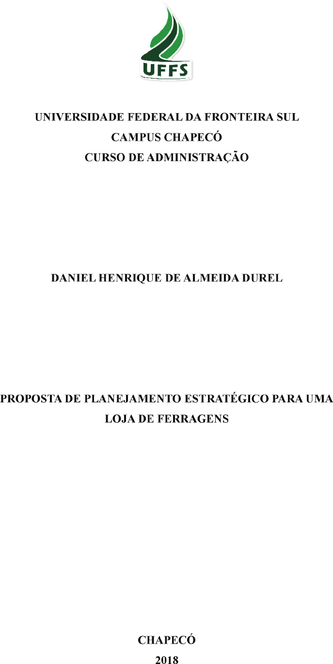 DANIEL HENRIQUE DE ALMEIDA DUREL PROPOSTA DE PLANEJAMENTO ESTRATÉGICO PARA UMA LOJA DE FERRAGENS Trabalho de Conclusão de Curso apresentado ao curso de Administração da Universidade Federal da Fronteira Sul, como requisito para obtenção do título de Bacharel em Administração Orientador: Prof. Me. Ronei Arno Mocellin CHAPECÓ 2018 PROGRAD/DBIB - Divisão de Bibliotecas Durel, Daniel Henrique de Almeida Proposta de planejamento estratégico para uma loja de ferragens/ Daniel Henrique de Almeida Durel. -- 2018. 91 f.:il. Orientador: Ronei Arno Mocellin. Trabalho de conclusão de curso (graduação) - Universidade Federal da Fronteira Sul, Curso de Administração , Chapecó, SC, 2018. 1. Administração estratégica. 2. Planejamento estratégico. 3. Loja de varejo. I. Mocellin, Ronei Arno, orient. II. Universidade Federal da Fronteira Sul. III. Título. Elaborada pelo sistema de Geração Automática de Ficha de Identificação da Obra pela UFFS com os dados fornecidos pelo(a) autor(a). Dedico este trabalho aos meus pais Neuri e Neli, pelos incentivos, apoio e compreensão que recebi. AGRADECIMENTOS Agradeço primeiramente a Deus, pela presença em minha vida, por guiar minhas escolhas e iluminar o meu caminho. Ao meu pai Neuri, e minha mãe Neli, por todo apoio e incentivo em todos os momentos da minha vida, por todo o amor e compreensão dedicados a mim. Obrigado por tudo. Agradeço a minha irmã Daniela, por acreditar em mim, por me ajudar em todos os momentos, muito obrigado por todo apoio. A toda minha família, que sempre me fortaleceu em momentos difíceis. A minha namorada Andressa, pela paciência nos dias de estudos, pelos incentivos nos dias difíceis, pelo apoio incondicional e os momentos felizes compartilhados. Pelos amigos conquistados durante a graduação, pela troca de conhecimentos, ajuda nas provas e trabalhos, pelas festas e apoio durante o curso, agradeço em especial ao Alison, André, Rondi, Edson, Anderson, Rafaela, Andréia, Clarine, Ramon, Elizandra por todos os trabalhos em grupo, por todas as conversas, conselhos, risos, sou grato por tudo. A todos os professores do curso de administração, por todos os ensinamentos compartilhados. Em especial ao professor Ronei Arno Mocellin pela paciência, orientações, ideias e os mates. Por fim, agradeço a todos que de alguma forma contribuíram para a realização deste sonho. RESUMO O planejamento estratégico é essencial para qualquer empresa, essa ferramenta auxilia os gestores na tomada de decisão, através de práticas condizentes com a realidade do ambiente externo e os fatores internos. Dessa forma, este trabalho teve como objetivo geral desenvolver uma proposta de planejamento estratégico para a empresa Almeida Ferragens, uma microempresa do varejo de ferragens e ferramentas, com sede no município de Chapecó/SC. O estudo está classificado quanto a sua abordagem, como qualitativo, configura-se de acordo aos os objetivos como aplicada e descritiva, quanto aos procedimentos de coleta de dados trata-se de um estudo de caso e pesquisa de campo. Os dados utilizados foram coletados através de entrevista semiestruturada com o diretor geral e a gerente financeira e pesquisas. A partir dos dados obtidos, foi possível descrever e analisar o ambiente externo e o ambiente interno da empresa, em seguida foi definido as diretrizes de missão, visão e os valores, e determinados os objetivos e metas a serem alcançados. Os resultados do presente estudo apontam para uma postura estratégica de manutenção, tendo em vista que a organização está inserida num ambiente de várias oportunidades, no entanto, possui muitas fragilidades que dificultam o aproveitamento destas oportunidades. Diante do exposto, foram elaboradas estratégias e formalizadas através do 5W2H, visando corrigir as debilidades internas, ao passo que buscam aproveitar as oportunidades geradas pelo ambiente externo. Visando criar ao empresário medidas e diretrizes para sustentar o desenvolvimento da empresa. Palavras-chave: Administração estratégica. Planejamento estratégico. Loja de varejo. ABSTRACT Strategic planning is essential for any company, this tool helps managers in decision making, through practices consistent with the reality of the external environment and internal factors. Thus, this work aimed to develop a strategic planning proposal for the company Almeida Ferragens, a microenterprise of hardware and tool retail, headquartered in the municipality of Chapecó / SC. The study is classified according to its approach as qualitative, it is configured according to the objectives as applied and descriptive, as far as data collection procedures is concerned with a case study and field research. The data used were collected through a semistructured interview with the general director and the financial manager and research. From the data obtained, it was possible to describe and analyze the external environment and the internal environment of the company, then the mission, vision and values guidelines were defined, and the objectives and goals to be achieved were determined. The results of the present study point to a strategic posture of maintenance, since the organization is inserted in an environment of several opportunities, however, it has many fragilities that make difficult the use of these opportunities. In view of the above, strategies and formalized through 5W2H have been elaborated, aiming at correcting internal weaknesses, while seeking to take advantage of the opportunities generated by the external environment. Aiming to create to the entrepreneur measures and guidelines to sustain the development of the company. Keywords: Strategic administration. Strategic planning. Retail Store. LISTA DE FIGURAS Figura 1 – Tipos de estratégias ................................................................................................. 18 Figura 2 – Os níveis estratégico, tático e operacional e suas principais caracterí