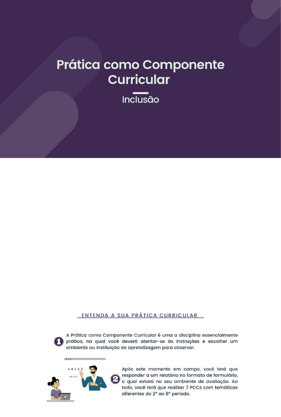 Confira tudo o que você precisa saber sobre sua Prática Curricular As Práticas como Componente Curricular são atividades que proporcionam o desenvolvimento de competências e habilidades necessárias à profissão docente, visando a experimentação do cotidiano docente, além de fomentar procedimentos próprios no processo de ensino-aprendizagem, pois alia teoria e prática. A Resolução CNE/CP 2/2002 (CONSELHO NACIONAL DE EDUCAÇÃO) determina que os cursos de licenciatura dediquem 400 horas de prática como componente curricular que devem ser vivenciadas ao longo do curso. Cursos de segunda licenciatura possuem carga horária de 200 (duzentas) horas de prática como componente curricular. Caminhos para realização da Prática como Componente Curricular https://sway.office.com/a0OjMgQOyru53VCn#content=vF4TlwvNtSGlMM https://sway.office.com/a0OjMgQOyru53VCn#content=vF4TlwvNtSGlMM Saiba mais sobre sua avaliação na Prática como Componente Curricular... Confira tudo o que você precisa saber sobre sua Prática Curricular Caminhos para realização da Prática como Componente Curricular Saiba mais sobre sua avaliação na Prática como Componente Curricular...