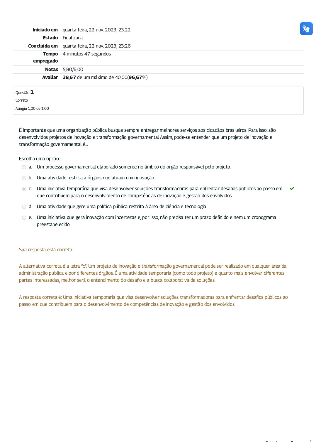 22/11/2023, 23:27 Exercício avaliativo - Módulo 1: Revisão da tentativa https://mooc41.escolavirtual.gov.br/mod/quiz/review.php?attempt=481902&cmid=13335 1/6 Iniciado em quarta-feira, 22 nov. 2023, 23:22 Estado Finalizada Concluída em quarta-feira, 22 nov. 2023, 23:26 Tempo empregado 4 minutos 47 segundos Notas 5,80/6,00 Avaliar 38,67 de um máximo de 40,00(96,67%) Questão 1 Correto Atingiu 1,00 de 1,00 É importante que uma organização pública busque sempre entregar melhores serviços aos cidadãos brasileiros. Para isso, são desenvolvidos projetos de inovação e transformação governamental Assim, pode-se entender que um projeto de inovação e transformação governamental é... Escolha uma opção: a. Um processo governamental elaborado somente no âmbito do órgão responsável pelo projeto. b. Uma atividade restrita a órgãos que atuam com inovação. c. Uma iniciativa temporária que visa desenvolver soluções transformadoras para enfrentar desa�os públicos ao passo em que contribuem para o desenvolvimento de competências de inovação e gestão dos envolvidos. d. Uma atividade que gere uma política pública restrita à área de ciência e tecnologia. e. Uma iniciativa que gera inovação com incertezas e, por isso, não precisa ter um prazo de�nido e nem um cronograma preestabelecido. Sua resposta está correta. A alternativa correta é a letra “c”. Um projeto de inovação e transformação governamental pode ser realizado em qualquer área da administração pública e por diferentes órgãos. É uma atividade temporária (como todo projeto) e quanto mais envolver diferentes partes interessadas, melhor será o entendimento do desa�o e a busca colaborativa de soluções. A resposta correta é: Uma iniciativa temporária que visa desenvolver soluções transformadoras para enfrentar desa�os públicos ao passo em que contribuem para o desenvolvimento de competências de inovação e gestão dos envolvidos. S l i idi 22/11/2023, 23:27 Exercício avaliativo - Módulo 1: Revisão da tentativa https://mooc41.escolavirtual.gov.br/mod/quiz/review.php?attempt=481902&cmid=13335 2/6 Questão 2 Parcialmente correto Atingiu 0,80 de 1,00 Analise a a�rmativa a seguir e julgue se as frases que a completam são verdadeiras ou falsas. A facilitação é o trabalho de facilitadores(as) no planejamento, na condução de um grupo e na sistematização dos resultados do trabalho colaborativo. Ela é importante em projetos de inovação e transformação governamental porque... a) favorece a participação dos diferentes envolvidos com o uso de técnicas e metodologias sob medida. b) cria condições para que a colaboração de todos e todas as partes envolvidas sejam consideradas. c) pode ser aplicada aos mais diferentes contextos e desa�os da administração pública. d) diminui a responsabilidade do órgão gestor do projeto na condução do mesmo. e) ajuda cada ator a compreender seu papel e ter voz ativa no projeto. Verdadeira Verdadeira Verdadeira Falsa Falsa Sua resposta está parcialmente correta. Você selecionou corretamente 4. As alternativas “a”, ”b”, “c” e “e” estão corretas porque a facilitação é a grande potencializadora da colaboração de cada um dos envolvidos na análise e na busca coletiva de soluções para desa�os públicos. Com a adoção de técnicas e metodologias de forma singular, pode ser aplicada aos mais diferentes contextos e desa�os da administração pública. Além disso, contribui para que cada parte interessada entenda seu papel e atue de forma coordenada. A letra “d” é falsa porque apesar da facilitação favorecer o trabalho colaborativo, isso não reduz a responsabilidade do órgão gestor do projeto na sua execução. Cada parte interessada tem seu papel e não cabe à facilitação interferir nisso. A resposta correta é: a) favorece a participação dos diferentes envolvidos com o uso de técnicas e metodologias sob medida. → Verdadeira, b) cria condições para que a colaboração de todos e todas as partes envolvidas sejam consideradas. → Verdadeira, c) pode ser aplicada aos mais diferentes contextos e desa�os da administração pública. → Verdadeira, d) diminui a responsabilidade do órgão gestor do projeto na condução do mesmo. → Falsa, e) ajuda cada ator a compreender seu papel e ter voz ativa no projeto. → Verdadeira. Selecione o idioma Powered by Tradutor https://translate.google.com/ https://translate.google.com/ 22/11/2023, 23:27 Exercício avaliativo - Módulo 1: Revisão da tentativa https://mooc41.escolavirtual.gov.br/mod/quiz/review.php?attempt=481902&cmid=13335 3/6 Questão 3 Correto Atingiu 1,00 de 1,00 Sobre os princípios da facilitação, identi�que as alternativas verdadeiras, marcando “V”, e as falsas, marcando “F”. a) A facilitação é guiada por quatro princípios básicos: respeito às pessoas, transparência do processo, participação igualitária e autonomia do grupo. b) Embora a autonomia do grupo seja um princípio, quem facilita deve estar atento para alcançar de qualquer forma os produtos demandados, mesmo que o grupo tenha uma visão divergente. c) O princípio de respeito às pessoas mostra a importância de quem facilita reconhecer, valorizar e ter empatia pelas pessoas em sua diversidade e especi�cidades. d) A transparência do processo é um princípio que contribui para que o/a facilitador/a ganhe a con�ança do grupo. e) A participação igualitária é uma premissa para a facilitação porque, em uma construção colaborativa, todos e todas devem ter igual oportunidade de participação, independente do seu cargo ou conhecimento técnico. V F V V V Sua resposta está correta. A alternativa “a” apresenta corretamente os quatro princípios básicos da facilitação. A alternativa “c”, também correta, destaca a importância de quem facilita desenvolver habilidades para respeitar a pluralidade das pessoas e suas singularidades