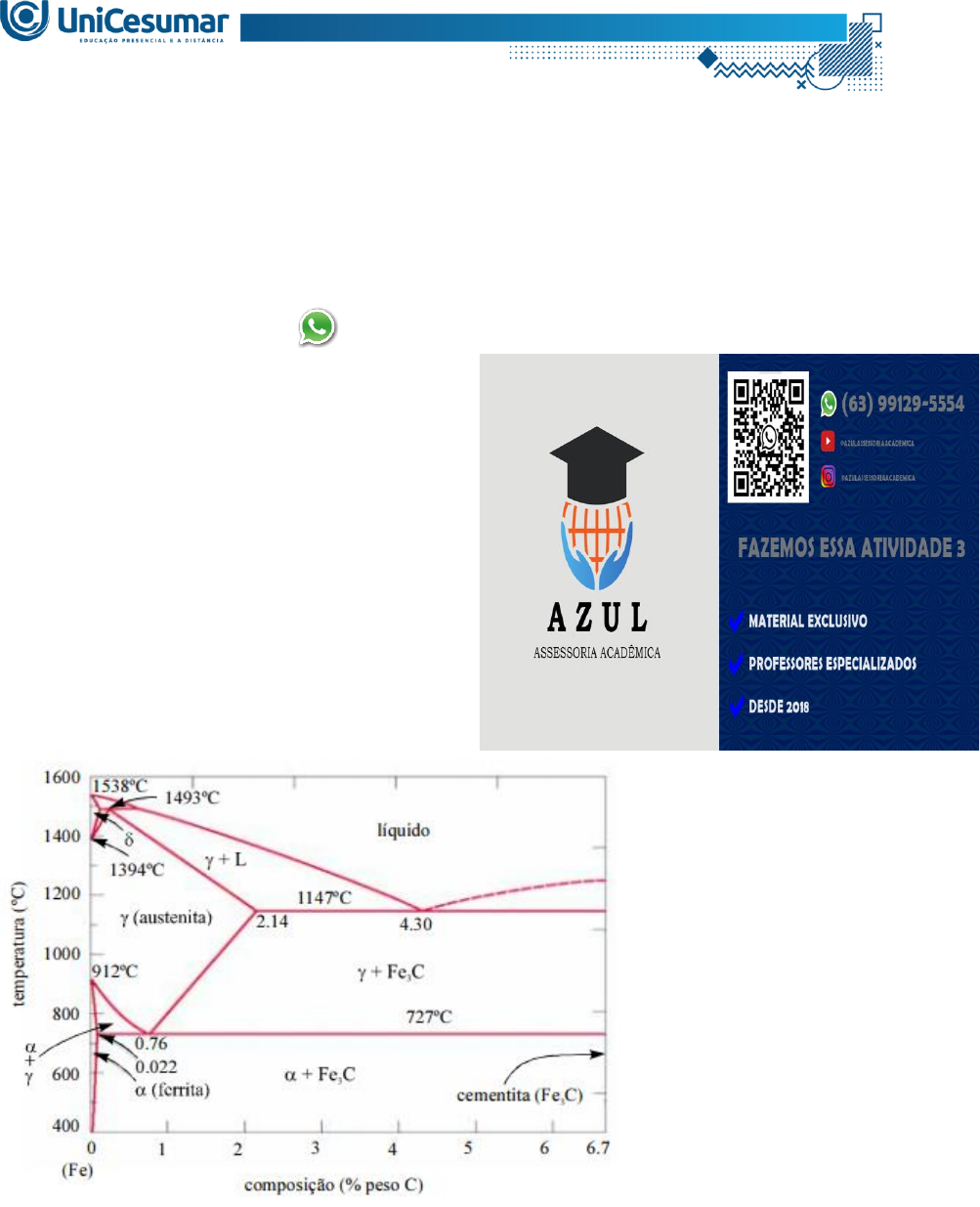 QUESTÃO 1: O diagrama de fases eutético binário representa um tipo frequente de diagrama de fases binário, notável pela presença de uma característica distintiva: a solubilidade limitada dos componentes do sistema na fase sólida. Na figura abaixo está apresentado um diagrama de fases Ferro-Carbono. Olá, aluno(a)! Está com dificuldade ou sem tempo para elaborar essa atividade? Iremos te ajudar! Entre em contato (63) 99129-5554 ATIVIDADE 3 - CIÊNCIAS DOS MATERIAIS - 54/2023 QUESTÃO 1: O diagrama de fases eutético binário representa um tipo frequente de diagrama de fases binário, notável pela presença de uma característica distintiva: a solubilidade limitada dos componentes do sistema na fase sólida. Na figura abaixo está apresentado um diagrama de fases Ferro- Carbono. Fonte: Callister (2013) Considerando o diagrama de fases apresentado, DETERMINE a quantidade relativa para o ponto P localizado a uma temperatura de 800°C com composição inicial de 99,75%p. Fe. QUESTÃO 1: O diagrama de fases eutético binário representa um tipo frequente de diagrama de fases binário, notável pela presença de uma característica distintiva: a solubilidade limitada dos componentes do sistema na fase sólida. Na figura abaixo está apresentado um diagrama de fases Ferro-Carbono. QUESTÃO 2: Quando se aumenta a temperatura de uma bara metálica, seu comprimento aumenta devido à expansão térmica. Ao se elevar a temperatura em 1,0 °C uma barra metálica de 1,0 m, o seu comprimento aumenta de 2,0 x 10-2 mm. CALCULE o comprimento final de outra barra do mesmo metal, com medida inicial 80 cm, quando temos uma taxa de variação de temperatura em 20,0 °C? CALLISTER JR., W. D.; RETHWISCH, D. G. Ciência e Engenharia de Materiais: uma Introdução. 8. ed. Rio de Janeiro: Editora LTC, 2013.
