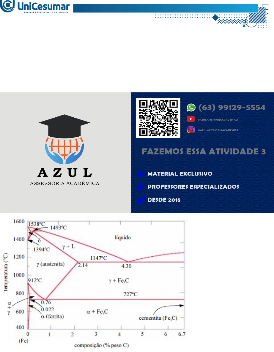 QUESTÃO 1: O diagrama de fases eutético binário representa um tipo frequente de diagrama de fases binário, notável pela presença de uma característica distintiva: a solubilidade limitada dos componentes do sistema na fase sólida. Na figura abaixo está apresentado um diagrama de fases Ferro-Carbono. ATIVIDADE 3 - CIÊNCIAS DOS MATERIAIS - 54/2023 QUESTÃO 1: O diagrama de fases eutético binário representa um tipo frequente de diagrama de fases binário, notável pela presença de uma característica distintiva: a solubilidade limitada dos componentes do sistema na fase sólida. Na figura abaixo está apresentado um diagrama de fases Ferro-Carbono. Fonte: Callister (2013) Considerando o diagrama de fases apresentado, DETERMINE a quantidade relativa para o ponto P localizado a uma temperatura de 800°C com composição inicial de 99,75%p. Fe. QUESTÃO 2: Quando se aumenta a temperatura de uma bara metálica, seu comprimento aumenta devido à expansão térmica. Ao se elevar a temperatura em 1,0 °C uma barra metálica de 1,0 m, o seu comprimento aumenta de 2,0 x 10-2 mm. CALCULE o comprimento final de outra barra do mesmo metal, com medida inicial 80 cm, quando temos uma taxa de variação de temperatura em 20,0 °C? CALLISTER JR., W. D.; RETHWISCH, D. G. Ciência e Engenharia de Materiais: uma Introdução. 8. ed. Rio de Janeiro: Editora LTC, 2013. QUESTÃO 1: O diagrama de fases eutético binário representa um tipo frequente de diagrama de fases binário, notável pela presença de uma característica distintiva: a solubilidade limitada dos componentes do sistema na fase sólida. Na figura abaixo está apresentado um diagrama de fases Ferro - Carb ono. ATIVIDADE 3 - CIÊNCIAS DOS MATERIAIS - 5 4 /2023 QUESTÃO 1: O diagrama de fases eutético binário representa um tipo frequente de diagrama de fases binário, notável pela presença de uma característica distintiva: a solubilidade limitada dos componentes do sistema na fase sólida. Na figura abaixo está apresentado um diagrama de fases Ferro - Carb ono. Fonte: Callister (2013) Considerando o diagrama de fases apresentado, DETERMINE a quantidade relativa para o ponto P localizado a uma temperatura de 800°C com composição inicial de 99,75%p. Fe. QUESTÃO 1: O diagrama de fases eutético binário representa um tipo frequente de diagrama de fases binário, notável pela presença de uma característica distintiva: a solubilidade limitada dos componentes do sistema na fase sólida. Na figura abaixo está apresentado um diagrama de fases Ferro-Carbono. ATIVIDADE 3 - CIÊNCIAS DOS MATERIAIS - 54/2023 QUESTÃO 1: O diagrama de fases eutético binário representa um tipo frequente de diagrama de fases binário, notável pela presença de uma característica distintiva: a solubilidade limitada dos componentes do sistema na fase sólida. Na figura abaixo está apresentado um diagrama de fases Ferro-Carbono. Fonte: Callister (2013) Considerando o diagrama de fases apresentado, DETERMINE a quantidade relativa para o ponto P localizado a uma temperatura de 800°C com composição inicial de 99,75%p. Fe.