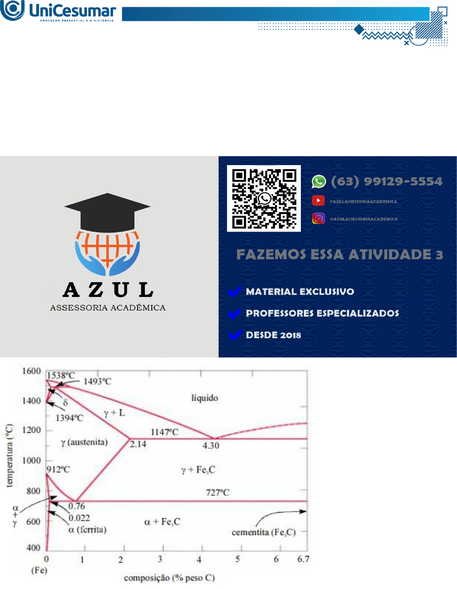 QUESTÃO 1: O diagrama de fases eutético binário representa um tipo frequente de diagrama de fases binário, notável pela presença de uma característica distintiva: a solubilidade limitada dos componentes do sistema na fase sólida. Na figura abaixo está apresentado um diagrama de fases Ferro-Carbono. ATIVIDADE 3 - CIÊNCIAS DOS MATERIAIS - 54/2023 QUESTÃO 1: O diagrama de fases eutético binário representa um tipo frequente de diagrama de fases binário, notável pela presença de uma característica distintiva: a solubilidade limitada dos componentes do sistema na fase sólida. Na figura abaixo está apresentado um diagrama de fases Ferro-Carbono. Fonte: Callister (2013) Considerando o diagrama de fases apresentado, DETERMINE a quantidade relativa para o ponto P localizado a uma temperatura de 800°C com composição inicial de 99,75%p. Fe. QUESTÃO 1: O diagrama de fases eutético binário representa um tipo frequente de diagrama de fases binário, notável pela presença de uma característica distintiva: a solubilidade limitada dos componentes do sistema na fase sólida. Na figura abaixo está apresentado um diagrama de fases Ferro-Carbono. QUESTÃO 2: Quando se aumenta a temperatura de uma bara metálica, seu comprimento aumenta devido à expansão térmica. Ao se elevar a temperatura em 1,0 °C uma barra metálica de 1,0 m, o seu comprimento aumenta de 2,0 x 10-2 mm. CALCULE o comprimento final de outra barra do mesmo metal, com medida inicial 80 cm, quando temos uma taxa de variação de temperatura em 20,0 °C? CALLISTER JR., W. D.; RETHWISCH, D. G. Ciência e Engenharia de Materiais: uma Introdução. 8. ed. Rio de Janeiro: Editora LTC, 2013.