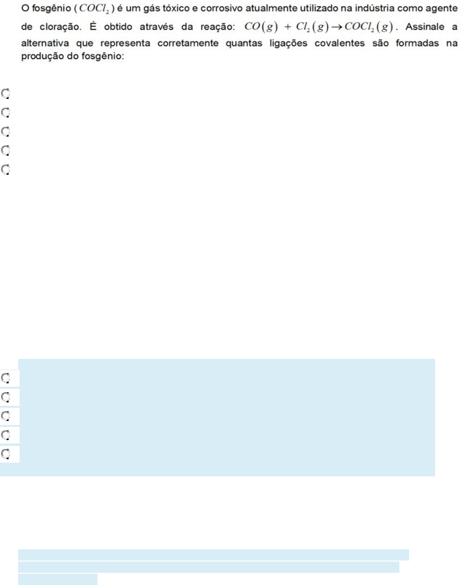 Questão 1 Escolha uma: a. 3 b. 4 c. 1 d. 2 e. 5 R: 4 ligações covalantes Associe a coluna 1, que contem as principais ligações secundarias, a coluna 2, que contém algumas substancias e em seguida assinale a alternativa que apresenta a correlação correta entre as duas colunas: Coluna 1 Coluna 2 I-Ligação de hidrogênio. A) Amônia (NH3) II-Interação dipolo-dipolo. B) Cloreto de Metila (CH3CI) III-Dispersão de London. C) Bromo (BR2) Escolha uma: a. I- b; II- a; III-c. b. I- c; II- a; III-b. c. I- c; II-b; III- a. d. I- a; II-b; III-c. e. I- a; II-c; III-b. A resposta correta é: I-a; II-c; III-b. Questão 3 Sobre a nomenclatura dos oxiácidos, sabe-se que ácidos com sufixo -oso apresentam um oxigênio a menos que os ácidos com sufixo -ico. Assinale a alternativa que completa as lacunas da tabela. Escolha uma: a. Ácido Perbromoso, HBrO3, Ácido hipobrômico, HBrO. b. Ácido Bromoso, HBrO, Ácido Perbrômico, HBrO3. c. Ácido Perbrômico, HBrO, Ácido Bromoso,HBrO3, d. Ácido Perbrômico, HBrO3, Ácido Bromoso, HBrO e. Ácido Bromoso, HBrO3 , Ácido Perbrômico, HBrO. HBrO4 = Ácido perbrômico Ácido brômico HBrO3 HBrO2= ácido Bromoso HBrO R: Alternativa D Questão 4 O é largamente utilizado como inseticida, pesticida, herbicida e, também, como fertilizante. O nome correto da substância da fórmulaé: Escolha uma: a. Binitrato de amônio. b. Nitreto de amônio. c. Nitritoso de amônio. d. Nitrato de amônio. e. Pernitrito de amônio. HNO3 é o ácido nítrico --> NO3- é o nitrato NH4OH é o hidróxido de amônio --> NH4+ é o amônio mesmo Unindo os dois, temos: NH4NO3 que é chamado Nitrato de Amônio R: Alternativa D