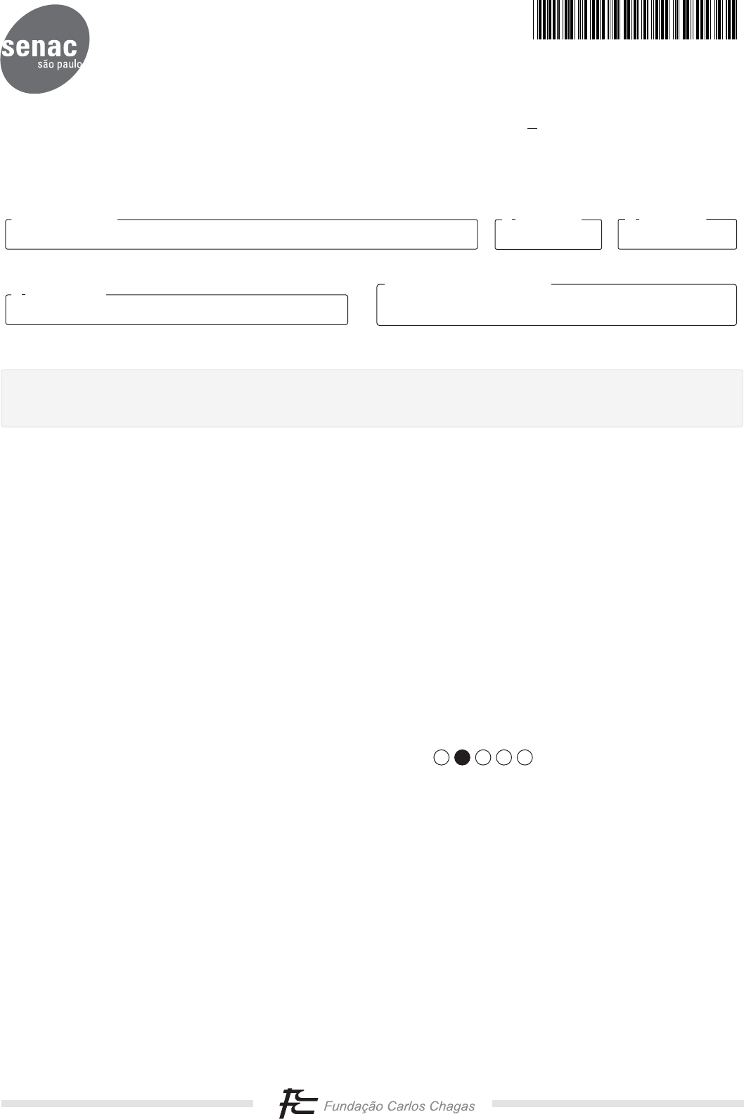 INSTRUÇÕES VOCÊ DEVE ATENÇÃO - Verifique se este caderno: - contém 64 questões, numeradas de 1 a 64. - contém a proposta de redação e o espaço para rascunho. Caso contrário, reclame ao fiscal da sala um outro caderno. Não serão aceitas reclamações posteriores. - Para cada questão existe apenas UMA resposta certa. - Você deve ler cuidadosamente cada uma das questões e escolher a resposta certa. - Essa resposta deve ser marcada na FOLHADE RESPOSTAS que você recebeu. - Procurar, na FOLHADE RESPOSTAS, o número da questão que você está respondendo. - Verificar no caderno de prova qual a letra (A,B,C,D,E) da resposta que você escolheu. - Marcar essa letra na FOLHADE RESPOSTAS, conforme o exemplo: - Ler o que se pede na Prova de Redação e utilizar, se necessário, o espaço para rascunho. - Marque as respostas primeiro a lápis e depois cubra com caneta esferográfica de tinta preta ou azul. - Marque apenas uma letra para cada questão. Mais de uma letra assinalada implicará anulação dessa questão. - Responda a todas as questões. - Não será permitida qualquer espécie de consulta, nem o uso de máquina calculadora. - Você deverá transcrever a redação, a tinta, na folha apropriada. Os rascunhos não serão considerados em hipótese alguma. - Você terá o total de 4 horas para responder a todas as questões, preencher a Folha de Respostas e fazer a Prova de Redação (rascunho e transcrição). - Ao término da prova, devolva este caderno de prova ao aplicador, juntamente com sua Folha de Respostas e a folha de transcrição da Prova de Redação. - Proibida a divulgação ou impressão parcial ou total da presente prova. Direitos Reservados. A C D E Dezembro/2009 CADERNO DE QUESTÕES - ESPANHOL CENTRO UNIVERSITÁRIO SENAC N do CadernooN de Inscriçãoo ASSINATURA DO CANDIDATO N do Documentoo Nome do Candidato Vestibular 1 Semestre de 2010o Caderno de Prova ’ESP’, Tipo 001 MODELO 0000000000000000 MODELO1 00001−0001−0001 2 SENAC-Vestibular-2010 Ciências da Natureza e Matemática 1. Bondes são veículos que circulam sobre trilhos. Foram implantados como meio de transporte público na segunda metade do século XIX, puxados por cavalos ou mulas. Passaram, depois, a ser movidos por energia elétrica − forma como ainda se mantêm como tradicional meio de transporte em grandes cidades da Europa e dos Estados Unidos. No Brasil, os bondes foram adotados em municí- pios como São Paulo, Santos, Porto Alegre e Rio de Ja- neiro. Hoje, os poucos que ainda funcionam no País têm função turística, apenas. (http://wwww.castelinho38.com/bloggers / uploaded_images/bonde-799963.jpg) Um bonde tem barras horizontais fixas no teto. A intervalos regulares, nestas barras, estão dispostas hastes de couro que podem ser seguradas pelos usuários do transporte, para se manterem em equilíbrio. A aceleração da gravidade é g e despreza-se o atrito entre a haste e a barra. θ Se o bonde realiza uma curva de raio R, num plano horizontal, tendo velocidade v, o ângulo θ que uma haste forma com a vertical é (A) Rg v senarc 2 (B) Rg v cosarc 2 (C) Rg v tgarc 2 (D) 2v Rg senarc (E) 2v Rg cosarc _________________________________________________________ 2. Um grande avião moderno precisa atingir, na pista, velocidade de 360 km/h para conseguir decolar. Suas turbinas têm potência para dar-lhe aceleração de 2,0 m/s2. O comprimento mínimo da pista usado na decolagem deste avião é, em km, (A) 4,5 (B) 4,0 (C) 3,5 (D) 3,0 (E) 2,5 Caderno de Prova ’ESP’, Tipo 001 SENAC-Vestibular-2010 3 3. Um skatista, com seu ágil meio de transporte, formam um conjunto de massa 50 kg. A partir do repouso na beirada A de uma pista em forma de tubo semicilíndrico de raio 5,6 m, o atleta passa pelo ponto inferior B de sua trajetória com velocidade de 10 m/s. Adote g = 10 m/s2. A B R No trecho AB, o trabalho das forças resistentes ao movi- mento é, em joules, (A) − 300 (B) − 200 (C) − 100 (D) 100 (E) 200 _________________________________________________________ 4. Uma balsa, que opera entre certa ilha e o continente, tem 25 m de comprimento e 10 m de largura. Seu peso é de 240 toneladas. Ao receber um caminhão de massa 40 toneladas, ela sofre afundamento, em cm, de (A) 32 (B) 16 (C) 8,0 (D) 4,0 (E) 2,0 _________________________________________________________ 5. O biodiesel tem calor de combustão de 8,0 . 103 cal/g e densidade 0,80 g/cm3. Um ônibus movido a este combustível consome 5,0 L numa viagem de 60 km entre duas cidades. Considerando-se rendimento médio de todo o processo 25%, o trabalho útil realizado pelo ônibus nesta viagem vale, em joules, (A) 3,2 . 106 (B) 6,4 . 106 (C) 3,2 . 107 (D) 6,4 . 107 (E) 3,2 . 108 Dados: g = 10 m/s2 dágua = 1,0 kg/L Dado: 1 cal = 4 J Caderno de Prova ’ESP’, Tipo 001 4 SENAC-Vestibular-2010 6. Um atleta pilotando uma asa delta sobrevoa horizon- talmente e a baixa altitude a piscina de uma residência. Ele observa uma lâmpada acesa no fundo da piscina que está vazia. É correto afirmar que o atleta: (A) poderia observar a lâmpada durante um intervalo de tempo maior, se a piscina estivesse cheia. (B) com a piscina cheia ou vazia vê a lâmpada no mesmo intervalo de tempo. (C) só poderia observar a lâmpada com a piscina cheia enquanto estivesse sobre a piscina. (D) ao passar sobre a piscina cheia veria a lâmpada numa posição mais profunda do que realmente se encontra. (E) não veria a lâmpada se a piscina estivesse cheia. _________________________________________________________ 7. Uma pessoa está parada na plataforma de uma estação e ouve o apito do trem que se aproxima com frequência 20% superior àquela do trem quando se afasta. Considere 340 m/s a velocidade do som no ar. A velocidade com que o trem passa pela estação é, em m/s, de aproximadamente, (A) 54 (B) 48 (C) 42 (D) 37 (E) 31 _________________________________________________________ 8. As composições metroviárias percorrem trilhos que unem as estaç