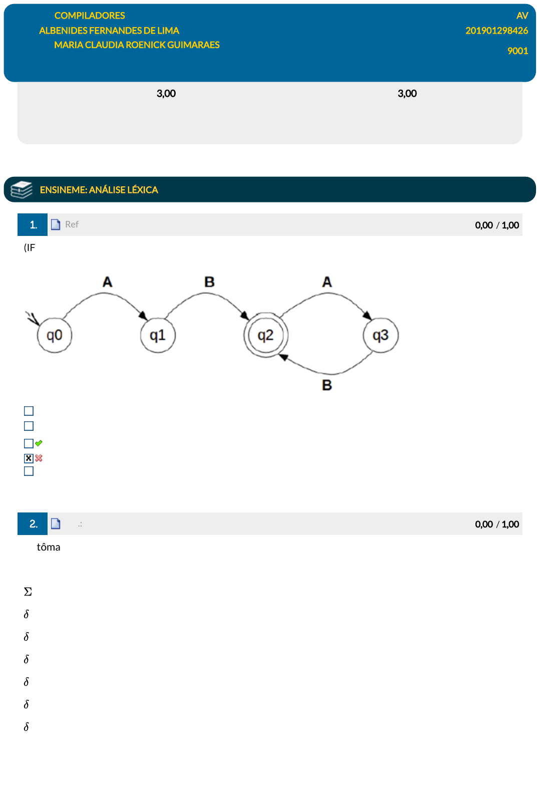 Disciplina: COMPILADORES AV Aluno: ALBENIDES FERNANDES DE LIMA 201901298426 Professor: MARIA CLAUDIA ROENICK GUIMARAES Turma: 9001 CCT0838_AV_201901298426 (AG) 27/10/2023 10:20:44 (F) Avaliação: 3,00 pts Nota SIA: 3,00 pts Estação de trabalho liberada pelo CPF 07602463358 com o token 752208 em 27/10/2023 08:27:31. O aproveitamento da Avaliação Parcial será considerado apenas para as provas com nota maior ou igual a 4,0. ENSINEME: ANÁLISE LÉXICA 1. Ref.: 6116822 Pontos: 0,00 / 1,00 (IFB/2017) Considerando-se a de�nição autômatos �nitos, assinale a única alternativa que contém somente cadeias de caracteres totalmente aceitas pelo autômato �nito da �gura. AB, ABAA, ABABAB. AB, ABAB, ABAABA. AB, ABAB, ABABAB. AB, ABBA, ABABAB. AB, ABAB, ABBAAB. 2. Ref.: 3990674 Pontos: 0,00 / 1,00 Autômato Finito é formalmente de�nido por uma quíntupla como por exemplo esta: Q = número de estados = {S0, S1, S2, S3,S4,S5} = símbolos de entrada = {A,E,M,O,S} = transições = (S0,S) = S1 (S1,E) = S2 (S1,O) = S3 (S3,M)= S4 (S4,A) = S5 q0 = estado inicial = {S0} F = conjunto de estados �nais = {S3,S5} Σ δ δ δ δ δ δ javascript:alert('C%C3%B3digo da quest%C3%A3o: 6116822.'); javascript:alert('C%C3%B3digo da quest%C3%A3o: 6116822.'); javascript:alert('C%C3%B3digo da quest%C3%A3o: 3990674.'); javascript:alert('C%C3%B3digo da quest%C3%A3o: 3990674.'); Sabendo-se que os estados �nais quando atingidos caracterizam que a palavra foi aceita, que palavras seriam aceitas por este autômato? "Som" e "Sema" "Se" e "Soma" "Mesa" e "So" "Mesa" e "Ema" "So" e "Sema" ENSINEME: ANÁLISE SEMÂNTICA 3. Ref.: 3992184 Pontos: 0,00 / 1,00 As árvores como representações intermediárias grá�cas são muito utilizadas para armazenar informações que auxiliam na execução dos passos da etapa de análise da compilação. Quanto a estes aspectos podemos a�rmar que: Arvores de Derivação Anotadas prestam um auxílio valioso à Análise Semântica Porque Como seus nós possuem atributos associados podem ser validados quanto a vários aspectos, por exemplo, o tipo de variáveis. Com base nas a�rmativas acima podemos concluir que: As duas a�rmativas são falsas As duas são corretas e a segunda não justi�ca a primeira A primeira é falsa e a segunda correta As duas são corretas e a segunda justi�ca a primeira A primeira é verdadeira e a segunda falsa 4. Ref.: 3992187 Pontos: 0,00 / 1,00 A determinação das dependências de uma árvore anotada e o tipo dos atributos limitam a escolha do esquema de tradução a ser utilizado. Considere a árvore abaixo e seu respectivo grafo de dependência (setas azuis) Ao analisarmos a situação podemos a�rmar: javascript:alert('C%C3%B3digo da quest%C3%A3o: 3992184.'); javascript:alert('C%C3%B3digo da quest%C3%A3o: 3992184.'); javascript:alert('C%C3%B3digo da quest%C3%A3o: 3992187.'); javascript:alert('C%C3%B3digo da quest%C3%A3o: 3992187.'); Somente poderá ser utilizado um Esquema S-atribuído Porque No esquema S-atribuído todos os atributos são sintetizados Com base nas a�rmativas podemos concluir que: A primeira é falsa e a segunda correta As duas são corretas e a segunda justi�ca a primeira As duas a�rmativas são falsas A primeira é verdadeira e a segunda falsa As duas são corretas e a segunda não justi�ca a primeira ENSINEME: ANÁLISE SINTÁTICA 5. Ref.: 3992530 Pontos: 0,00 / 1,00 Na implementação de Analisadores Sintáticos Descendentes Preditivo, é criada uma tabela para determinar que produção utilizar em função do símbolo não terminal no topo da pilha e do símbolo que está sendo lido na entrada. Para auxiliar no trabalho de criação da tabela, são de�nidos dois conjuntos o First e o Follow Considere a seguinte gramática X→abY|c Y→dY|ε Z→e Qual seria o conjunto Follow para o não terminal X? {b} {c} {a} {$} {ε} 6. Ref.: 3992528 Pontos: 0,00 / 1,00 Enade 2017 Em um compilador, um analisador sintático descendente preditivo pode ser implementado com o auxílio de uma tabela construída a partir de uma gramática livre de contexto. Essa tabela, chamada tabela LL(k), indica a regra de produção a ser aplicada olhando-se o k-ésimo próximo símbolo lido, chamado lookahead(k). Por motivo de e�ciência, normalmente busca-se utilizar k=1. Considere a gramática livre de contexto G=(X,Y,Z,a,b,c,d,e,P,X)G=(X,Y,Z,a,b,c,d,e,P,X), em que PP é composto pelas seguintes regras de produção: X→aZbXY|c Y→dX|ε javascript:alert('C%C3%B3digo da quest%C3%A3o: 3992530.'); javascript:alert('C%C3%B3digo da quest%C3%A3o: 3992530.'); javascript:alert('C%C3%B3digo da quest%C3%A3o: 3992528.'); javascript:alert('C%C3%B3digo da quest%C3%A3o: 3992528.'); Z→e Considere, ainda, a seguinte tabela LL(1), construída a partir da gramática GG, sendo $$ o símbolo que representa o �m da cadeia. Essa tabela possui duas produções distintas na célula (Y,d)(Y,d), gerando, no analisador sintático, uma dúvida na escolha da regra de produção aplicada em determinados momentos da análise. Considerando que o processo da construção dessa tabela LL(1), a partir da gramática GG, foi seguido corretamente, a existência de duas regras de produção distintas na célula (Y,d), neste caso especí�co, resulta da presença de duas regras de produção com o mesmo não terminal na cabeça. da ausência do símbolo de �m de cadeia ($) nas regras de produção. do uso incorreto do símbolo de cadeia vazia (ε) nas regras de produção. de um não determinismo causado por uma ambiguidade na gramática. da presença de duas regras de produção com um único terminal no corpo. ENSINEME: GERAÇÃO DE CÓDIGO 7. Ref.: 3993121 Pontos: 0,00 / 1,00 O produto �nal da etapa de síntese do compilador é o código de montagem que será submetido ao montador para gerar o módulo objeto. Em seu trabalho o montador deve, entre outras coisas, determinar os endereços em memória das instruções , dos rótulos e das variáveis. Considere o 